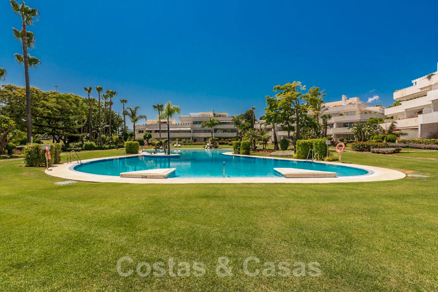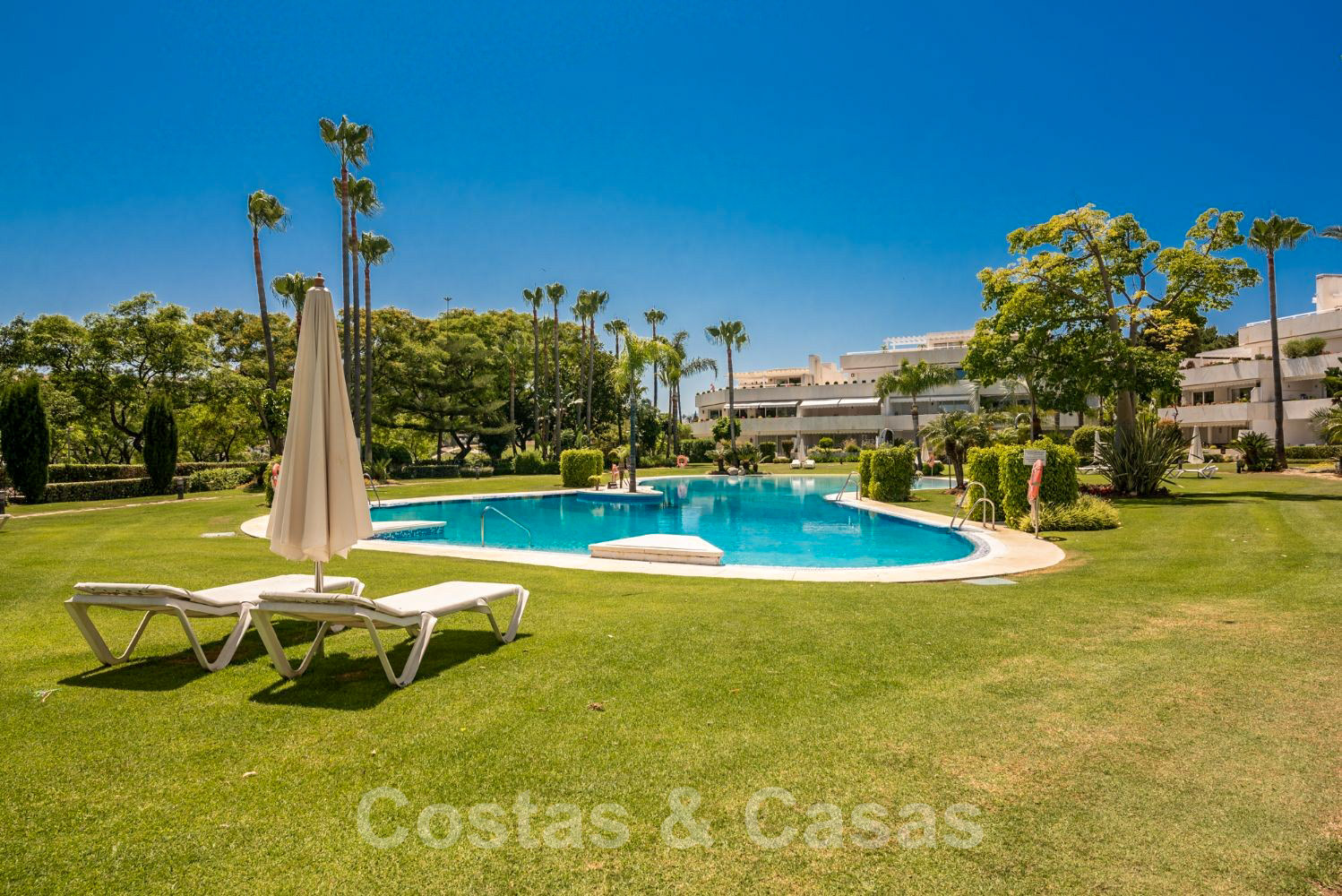 Grande piscine (style piscine de plage) située dans un jardin subtropical manucuré adjacent au terrain de golf.