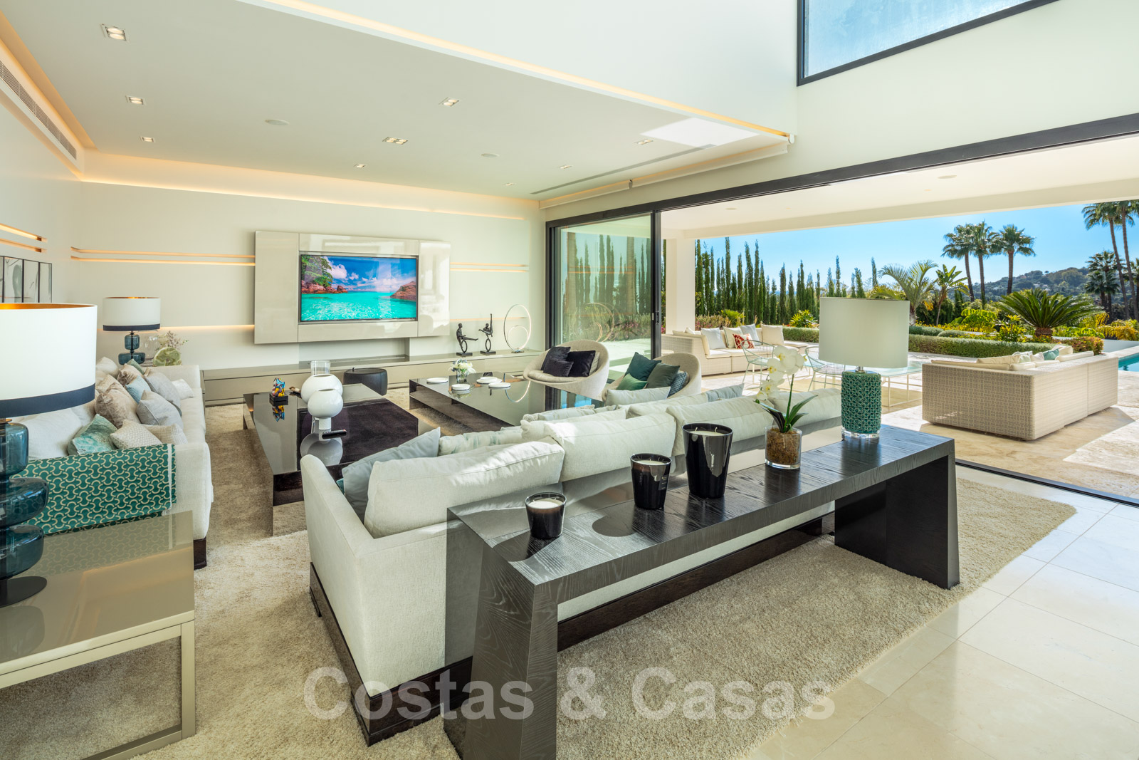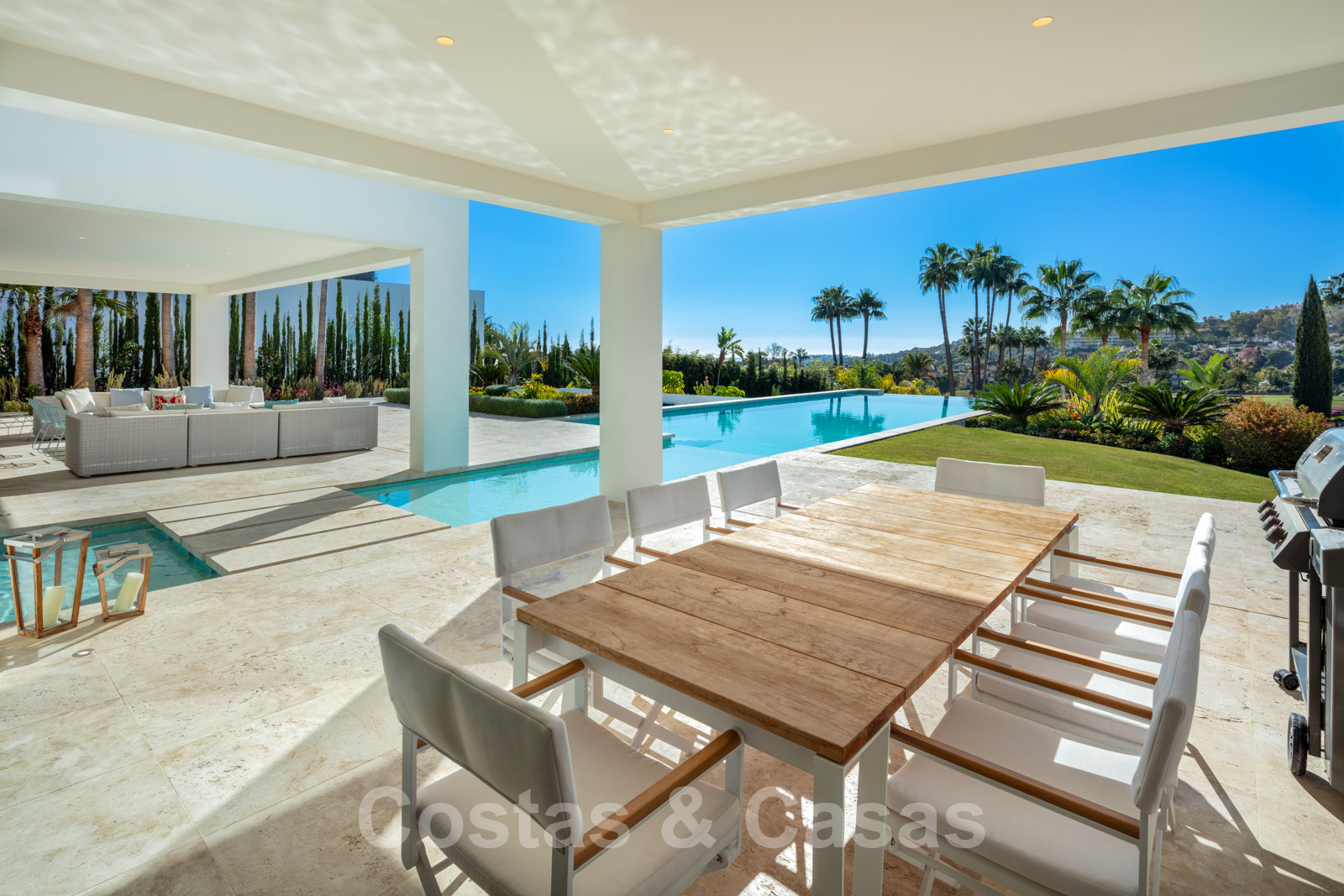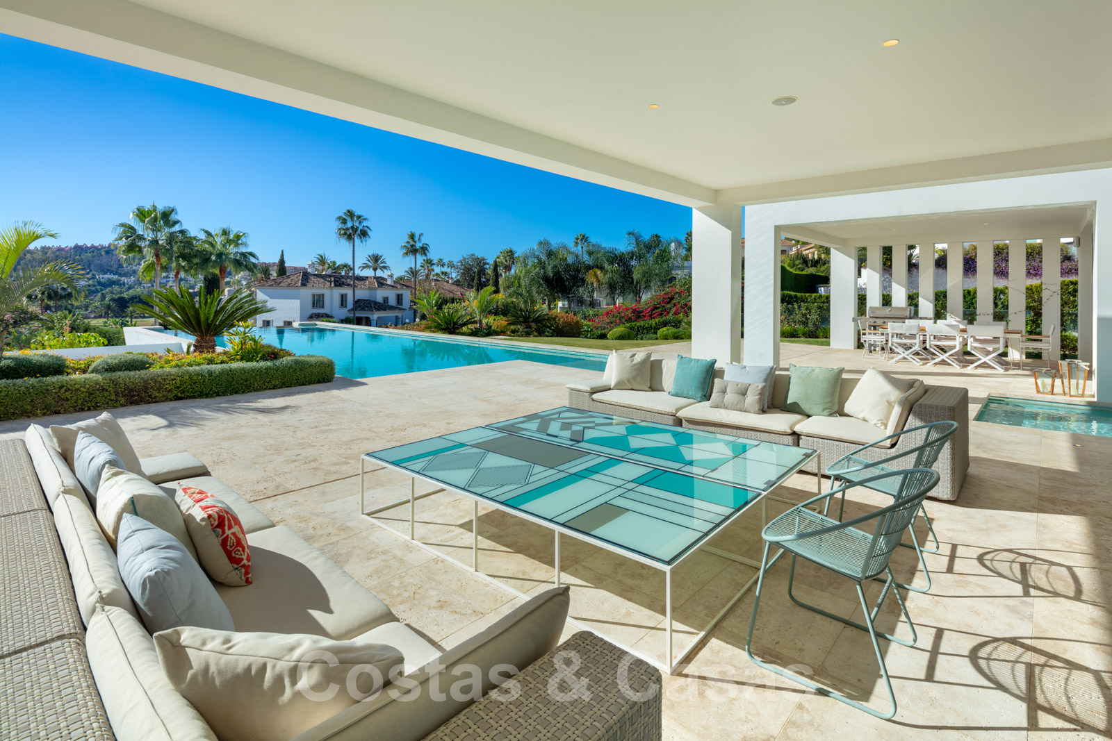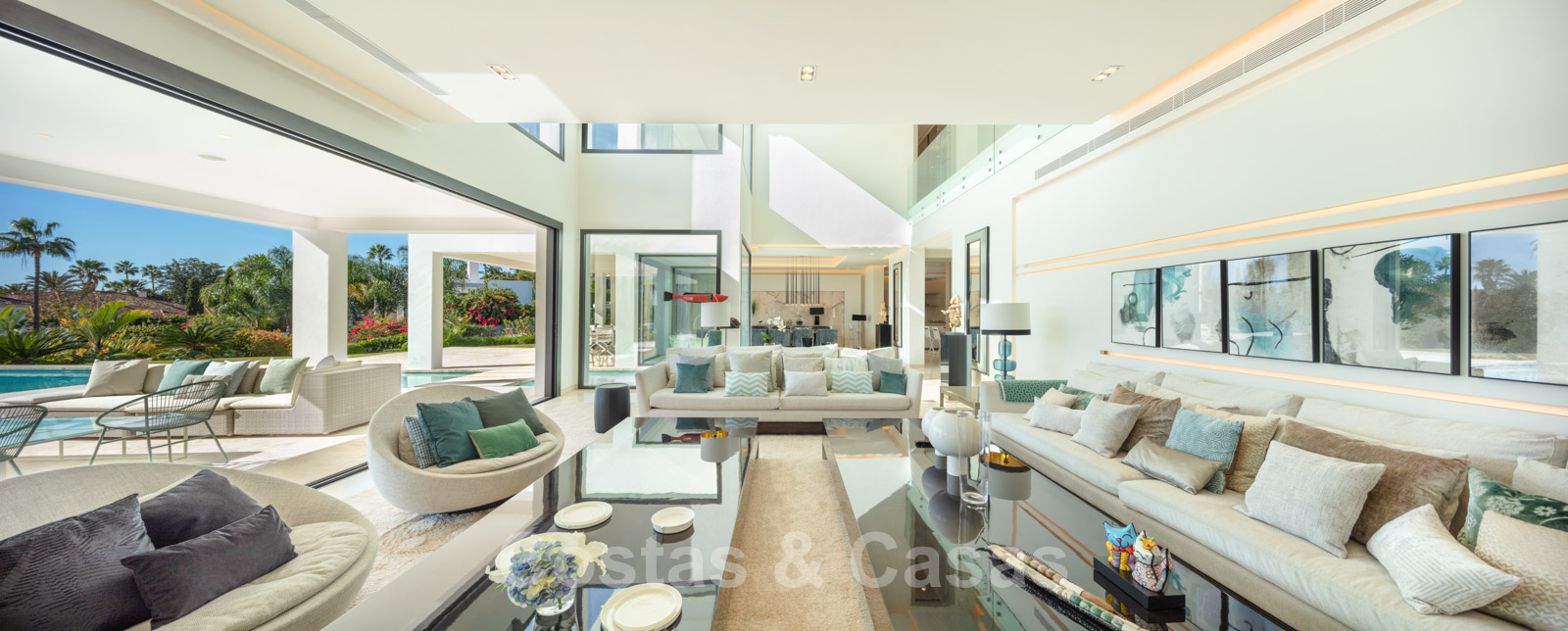 Un séjour ouvert avec un accès direct aux grandes terrasses couvertes et ouvertes et à l'extraordinaire piscine.