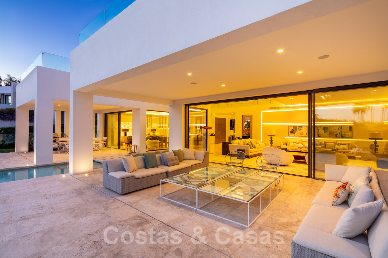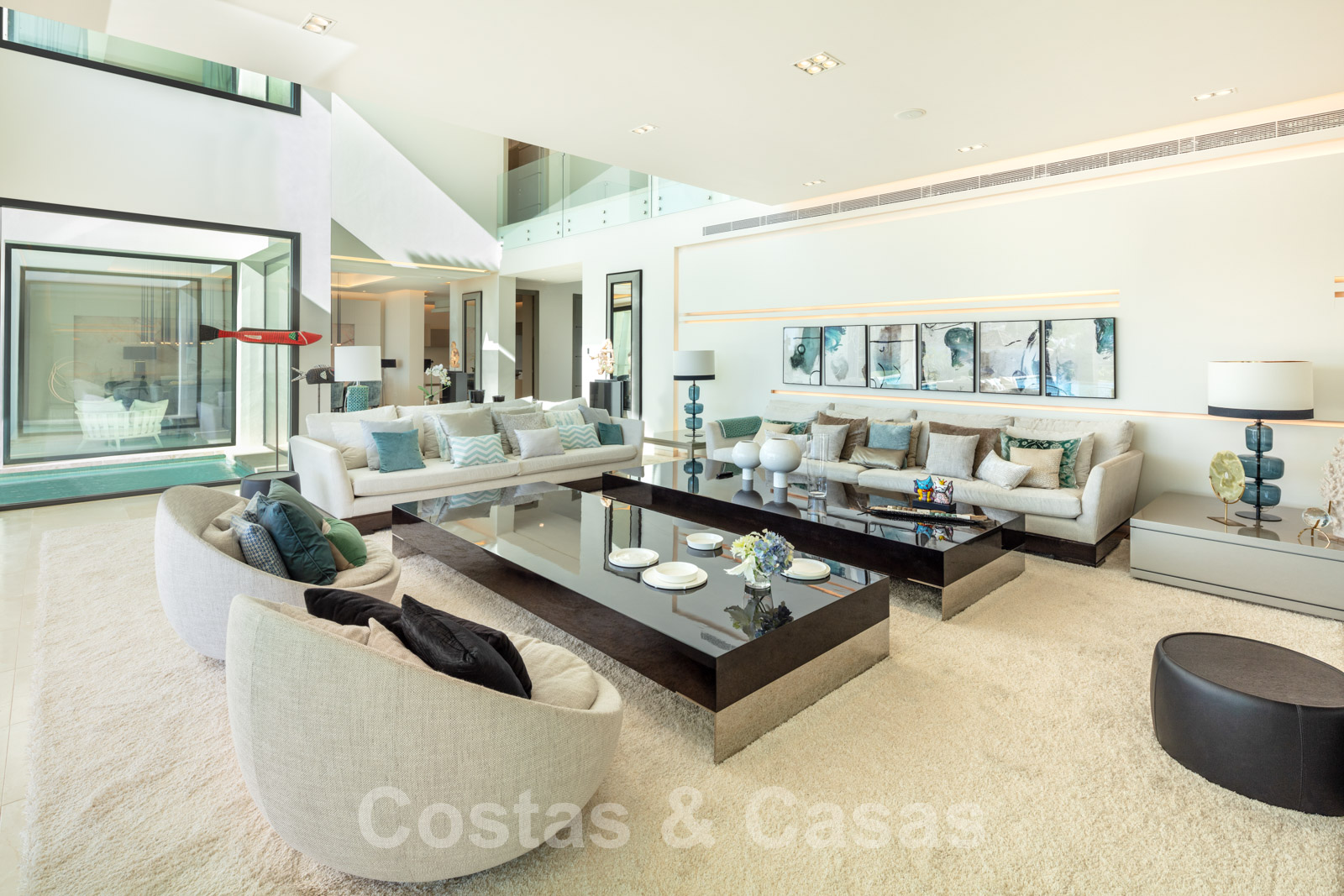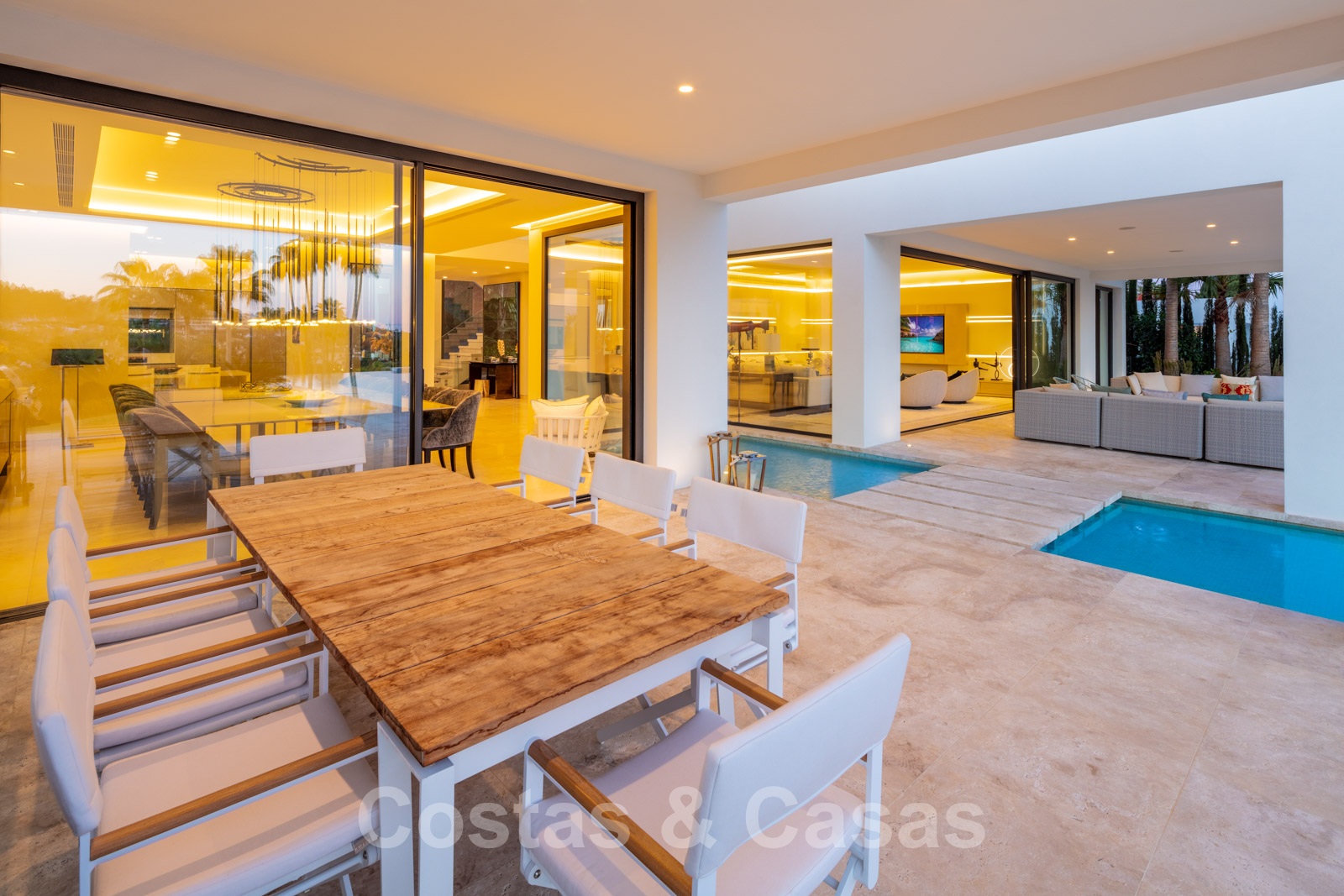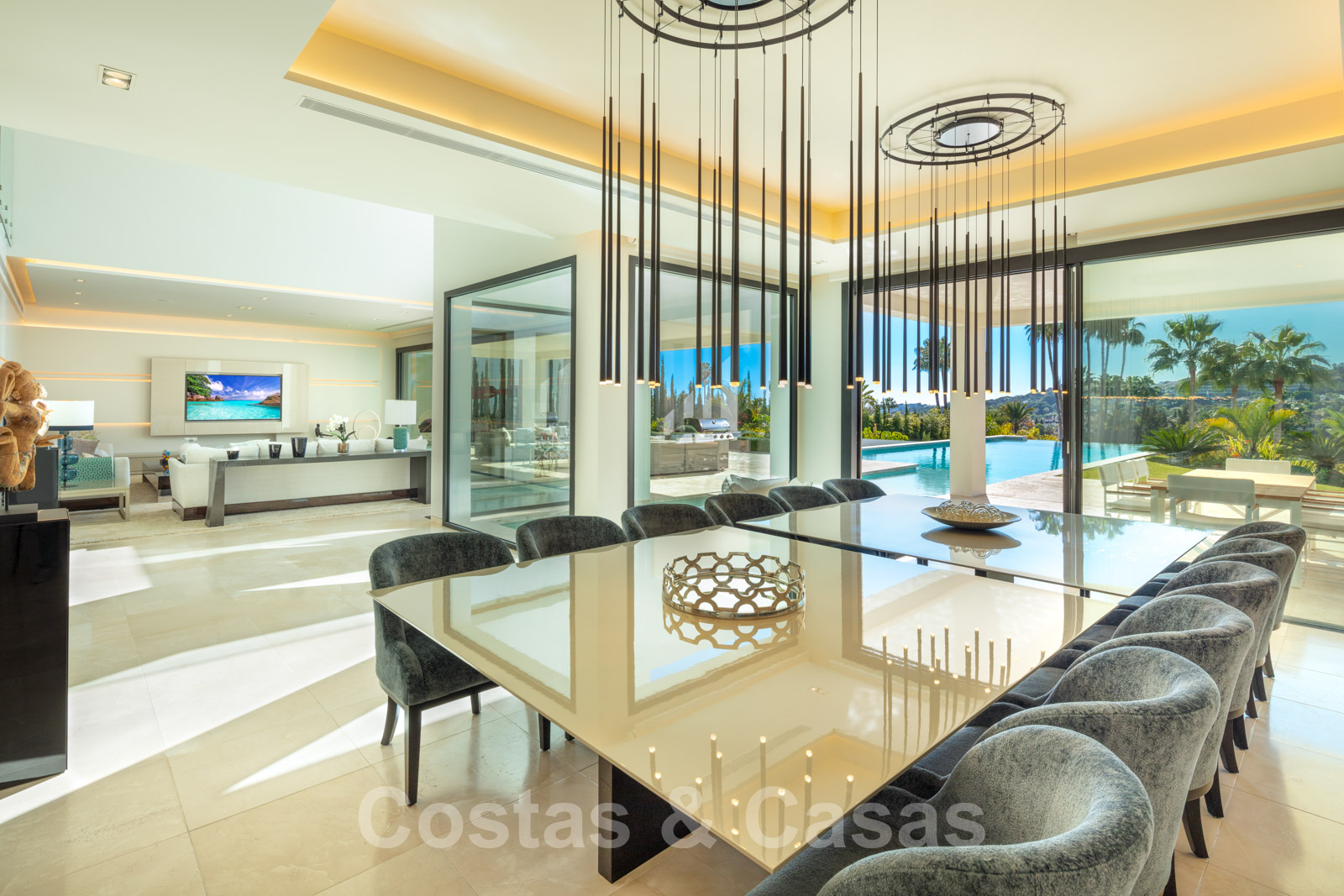 Un séjour ouvert avec un accès direct aux grandes terrasses couvertes et ouvertes et à l'extraordinaire piscine.