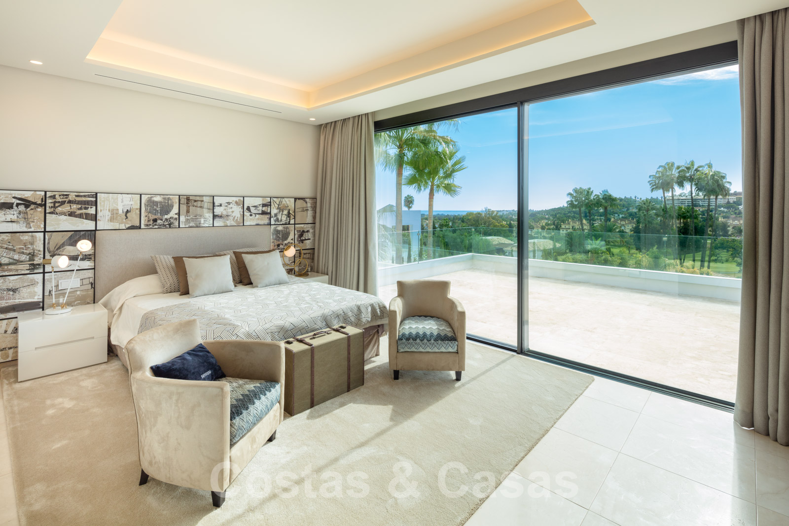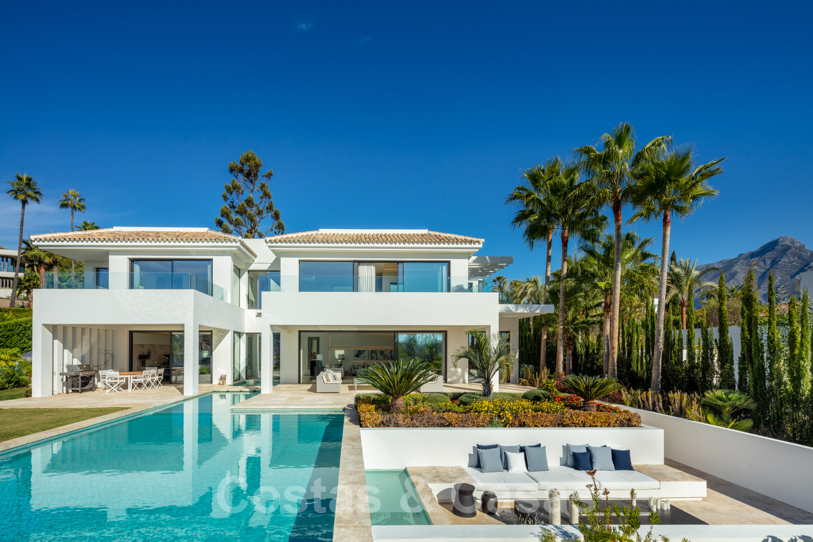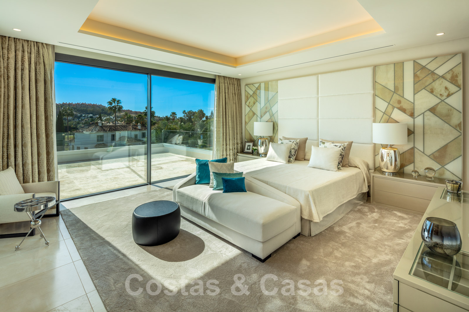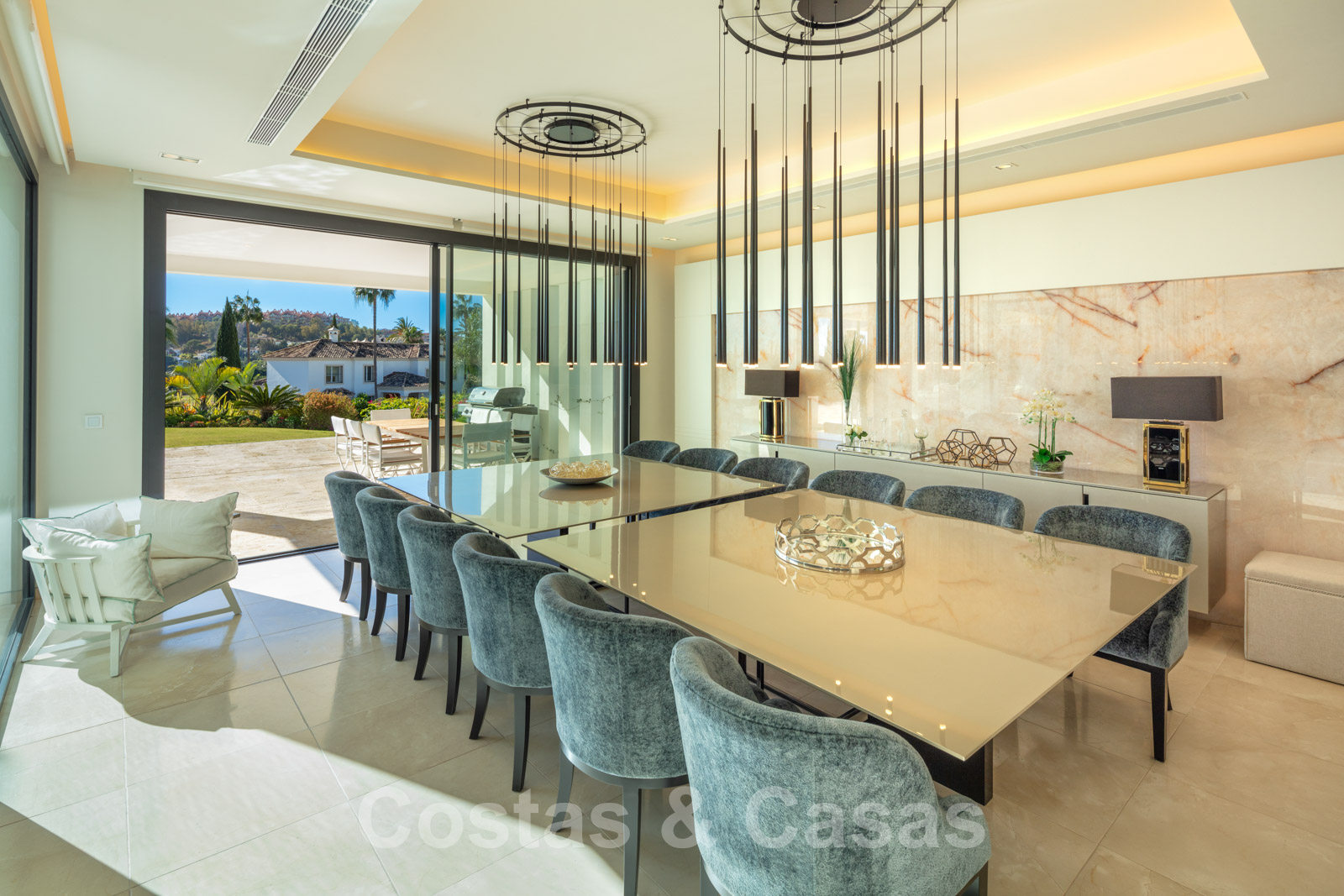 Elle est meublée de façon magistrale avec des éléments de haute qualité et offre un accès direct aux terrasses couvertes et ouvertes.