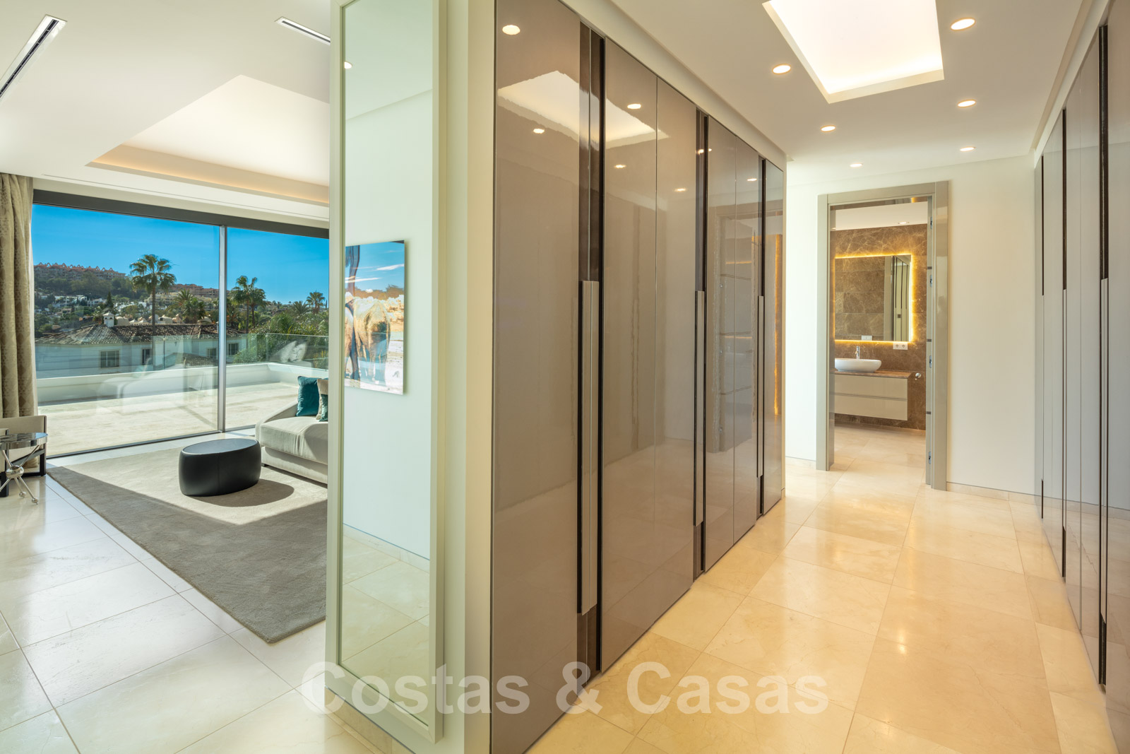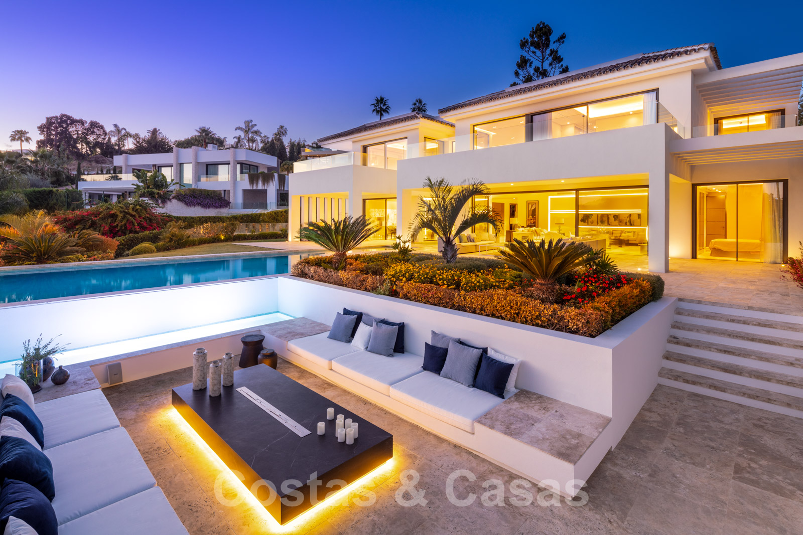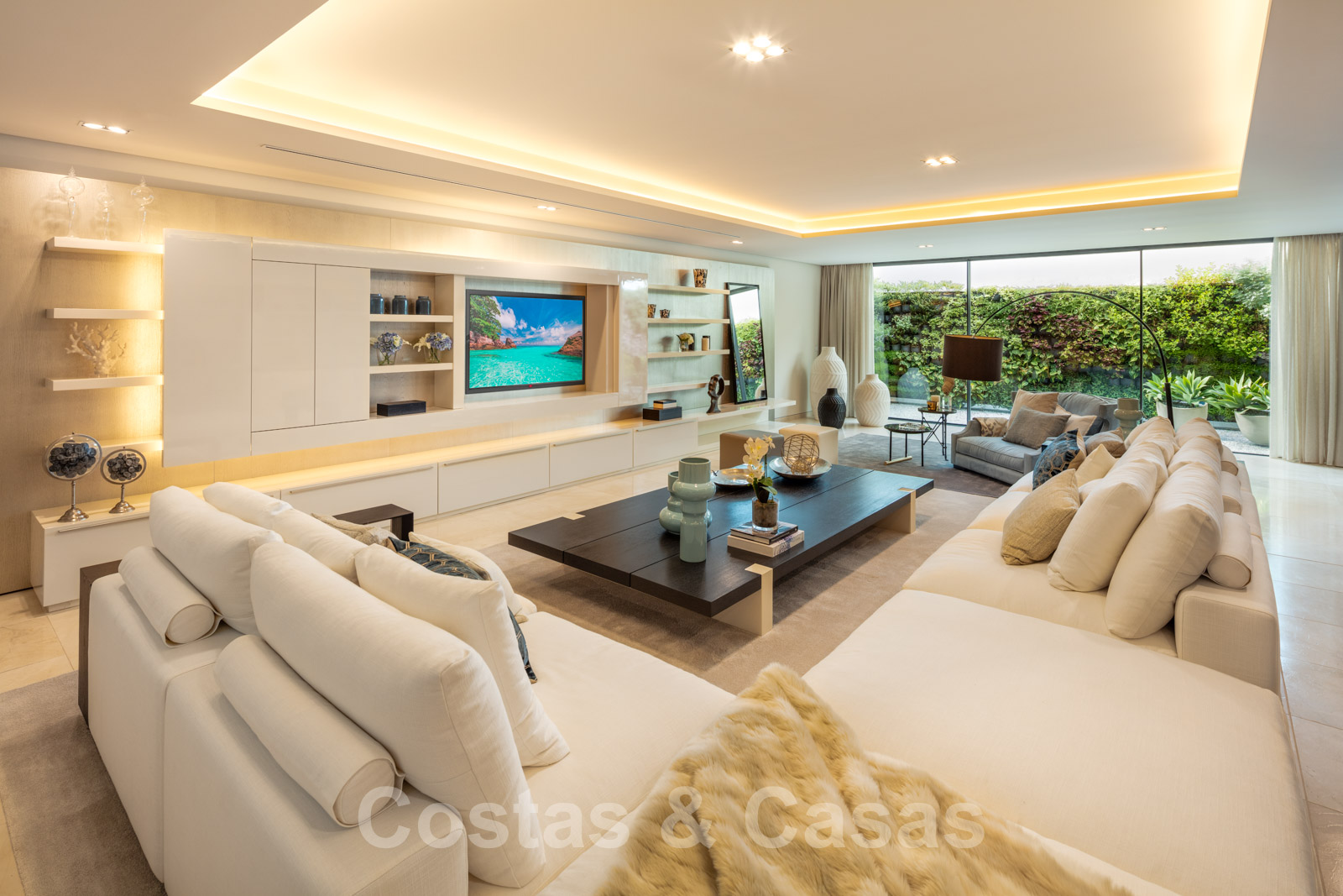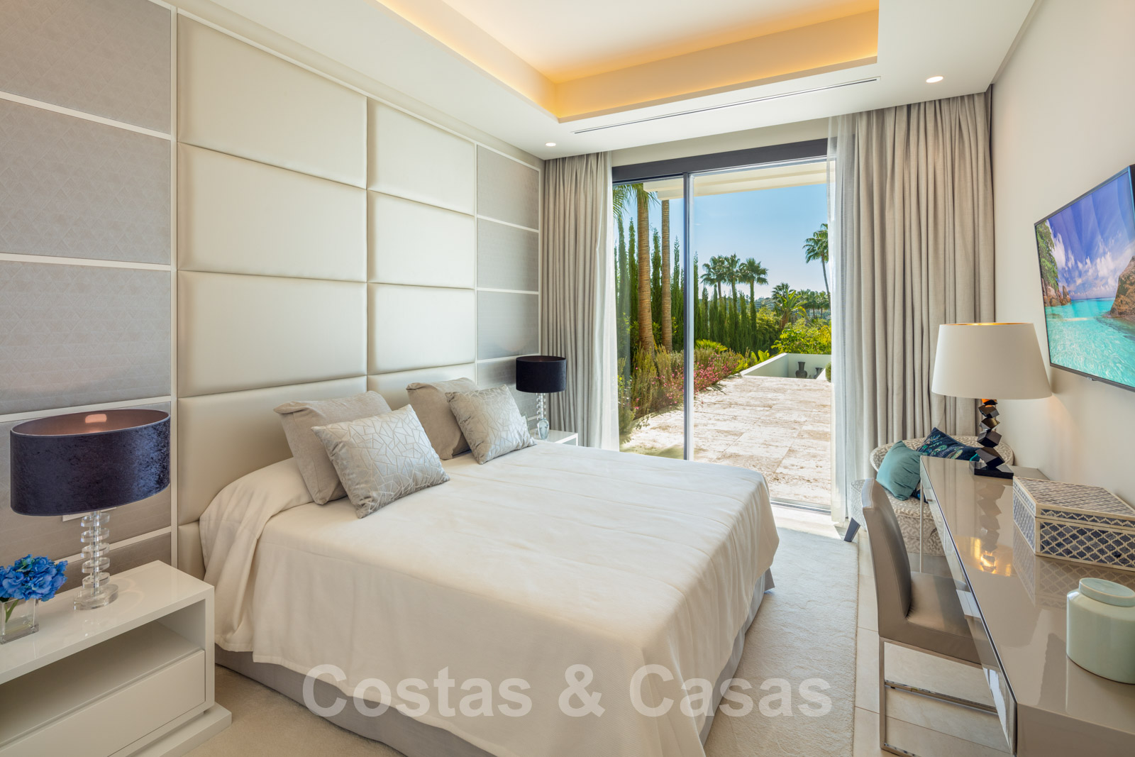 Elle est meublée de façon magistrale avec des éléments de haute qualité et offre un accès direct aux terrasses couvertes et ouvertes.