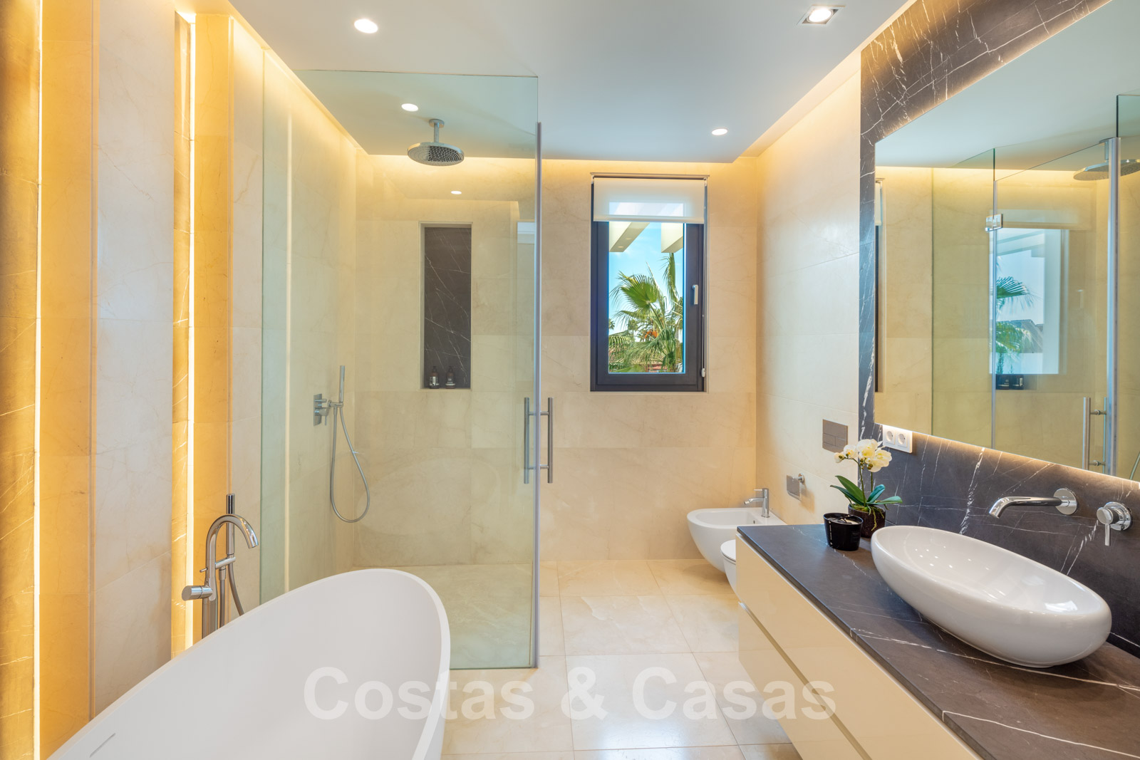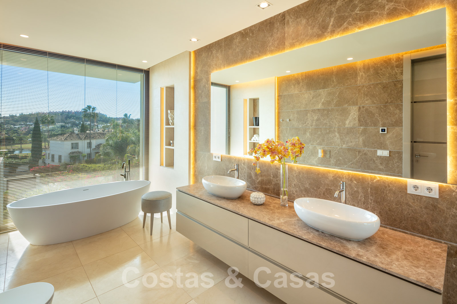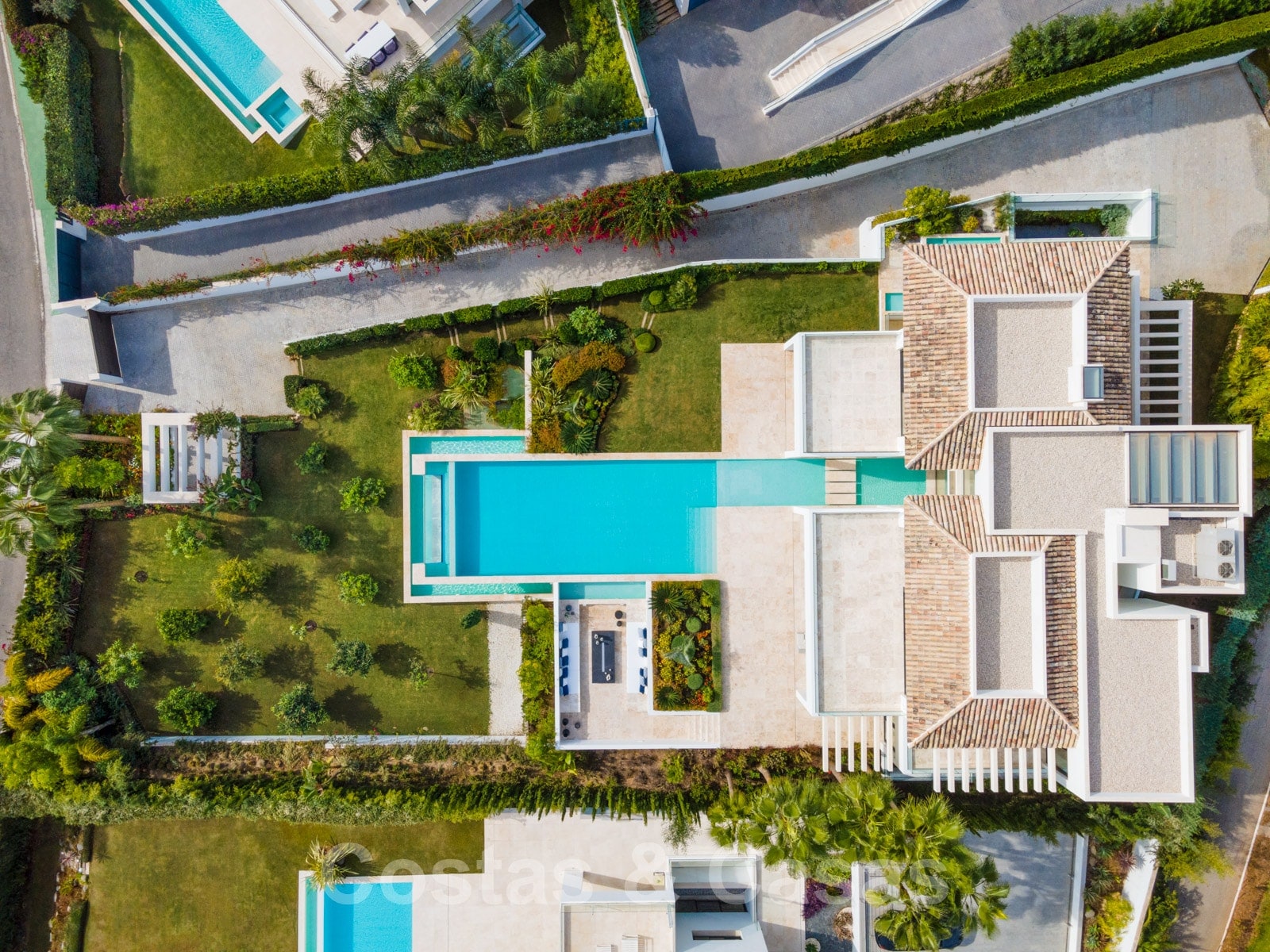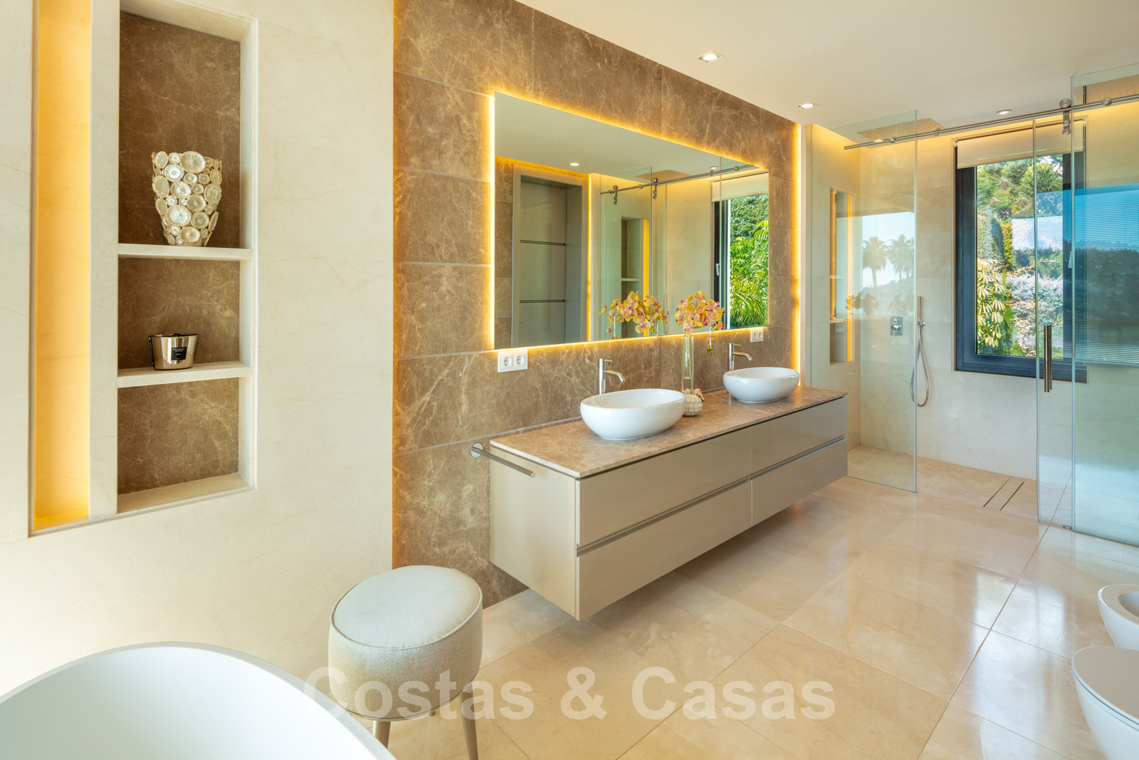 Elle est meublée de façon magistrale avec des éléments de haute qualité et offre un accès direct aux terrasses couvertes et ouvertes.