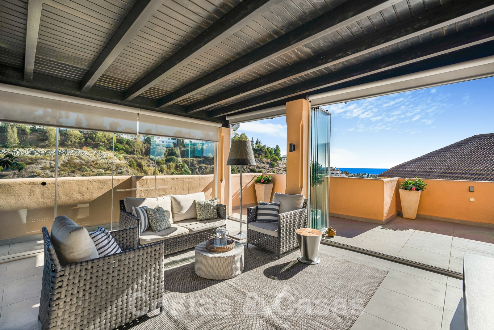 Spacieux penthouse dans un complexe cinq étoiles. Orientation sud avec vue panoramique sur la mer. Décoration élégante dans des tons doux. Terrasse couverte équipée d'une cuisine extérieure avec barbecue, d'un coin repas et d'un espace de détente. Cette spacieuse terrasse couverte peut être entièrement fermée par des rideaux de verre. Plusieurs terrasses ouvertes. Espace de vie aéré avec un agencement ouvert. Cuisine ouverte, entièrement équipée, avec un îlot central et un bar à petit-déjeuner. De grandes fenêtres coulissantes apportent beaucoup de lumière naturelle à l'intérieur. Sols en marbre. Débarras et garage intérieur inclus.