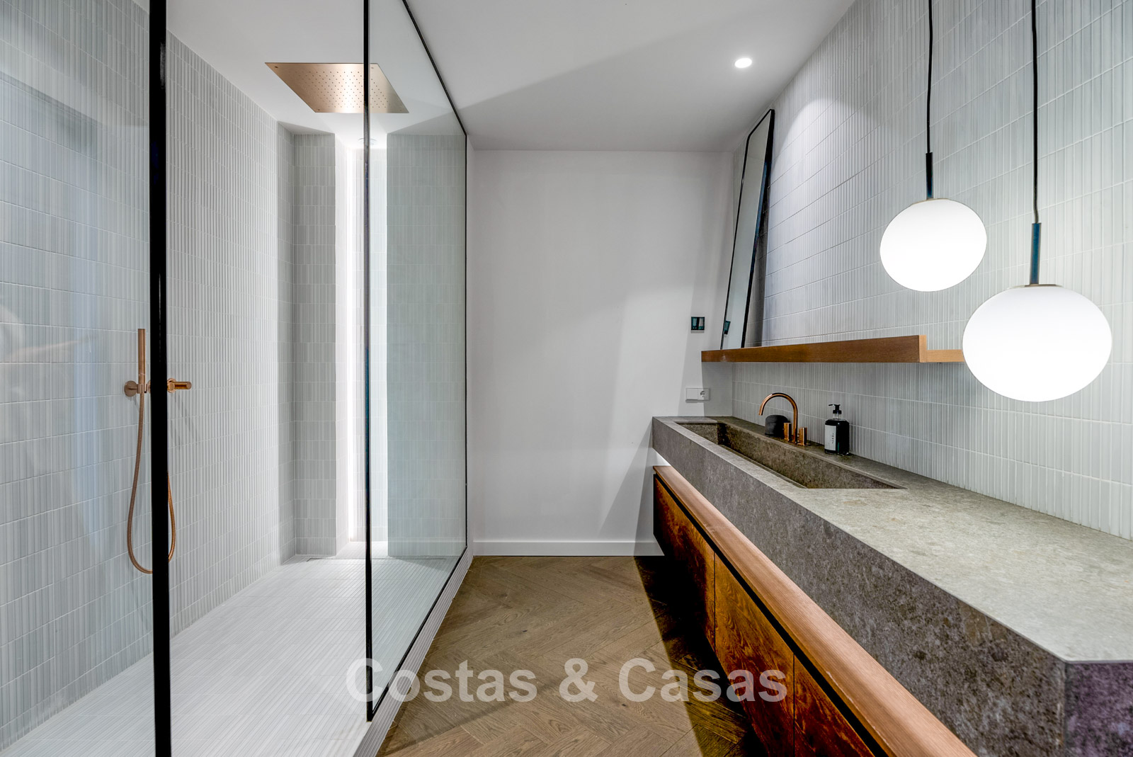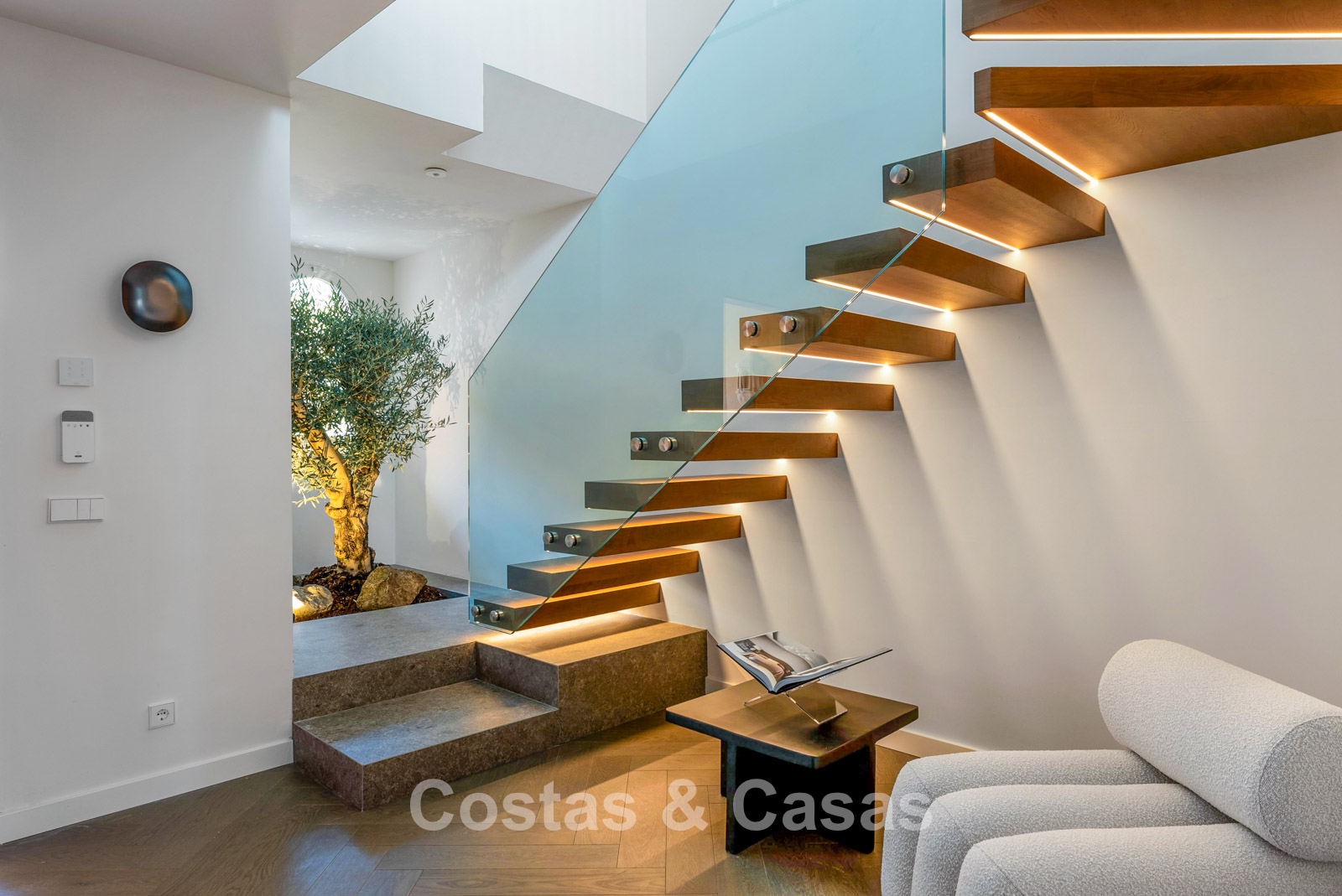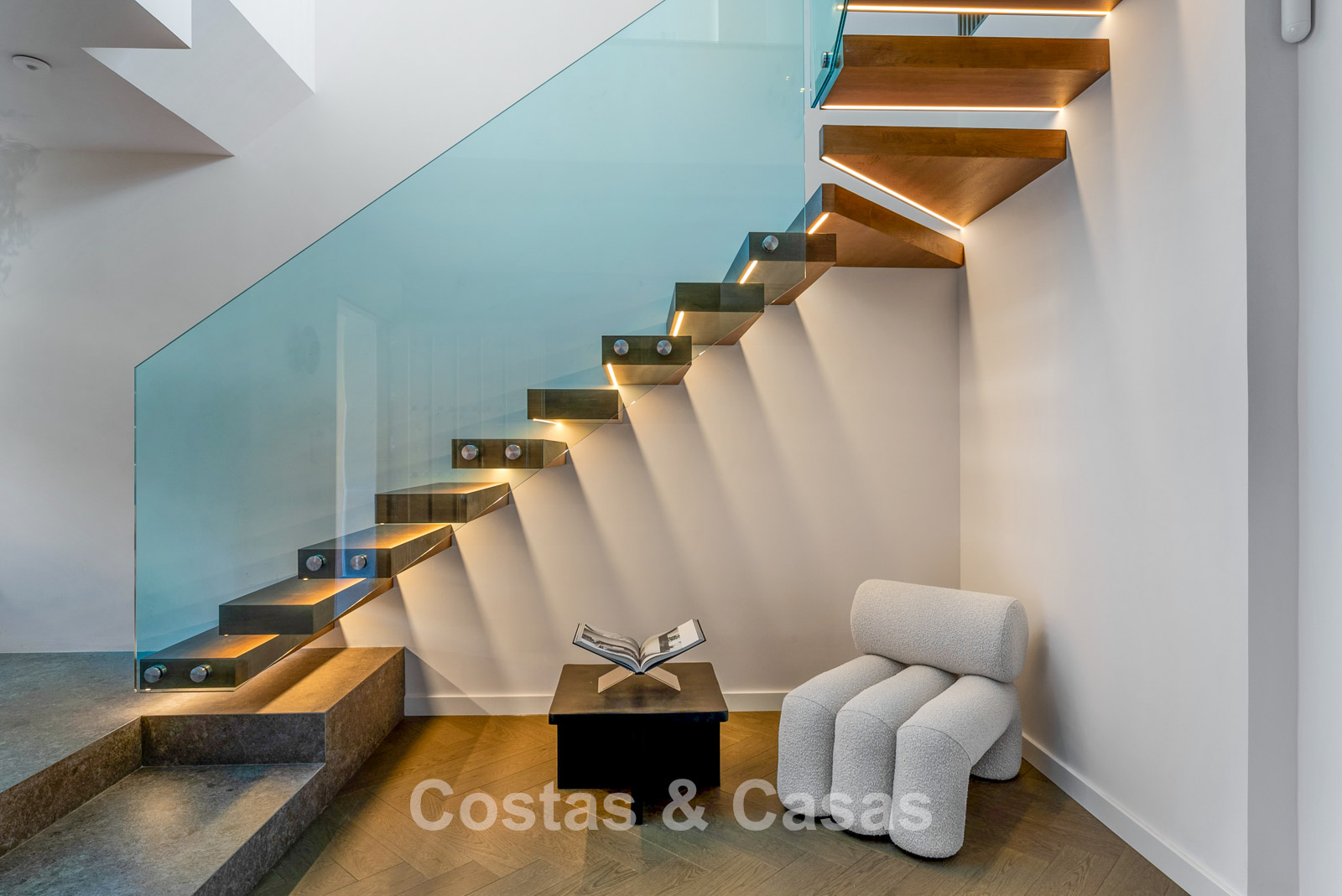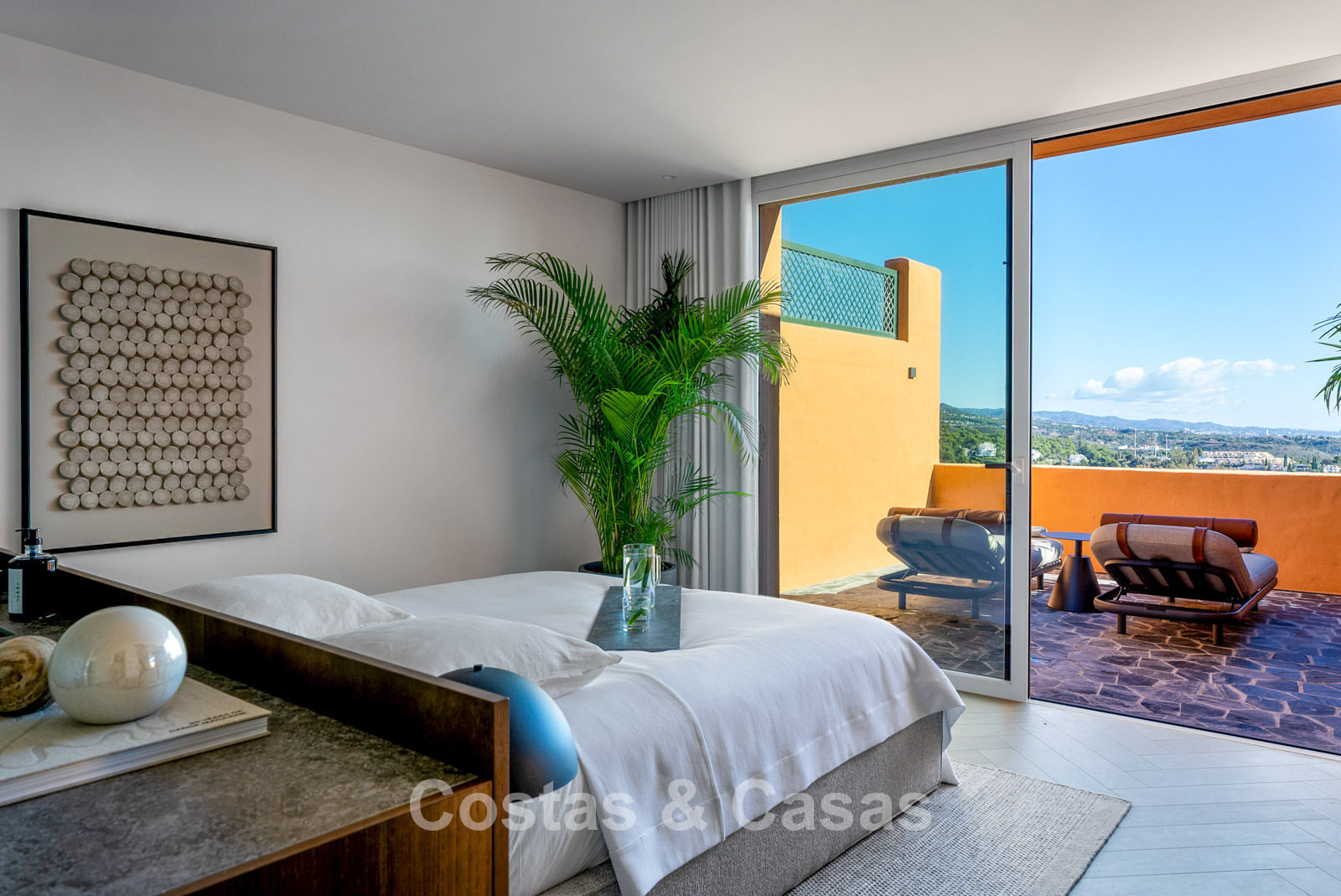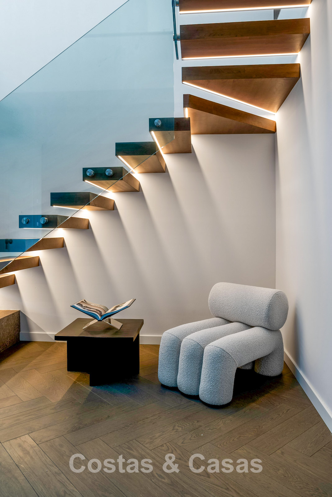 Spacieux penthouse en duplex dans un complexe à l'architecture méditerranéenne contemporaine. Entièrement rénové aux normes les plus élevées, avec un oeil pour le luxe, le confort et le raffinement. Utilisant des matériaux de qualité, notamment de la pierre, des menuiseries en chêne foncé et des tuiles nervurées. Orienté plein sud. Vue sur la mer Méditerranée et le paysage montagneux. La vaste terrasse principale, avec une partie couverte, sera équipée d'une cuisine extérieure et d'un espace détente. L'intérieur respire le luxe moderne et le minimalisme, avec une forte concentration sur des lignes épurées, des matériaux naturels et une palette de couleurs chaudes et neutres. De hautes fenêtres coulissantes offrent un intérieur aéré et très lumineux. Espace de vie ouvert avec un salon TV élégant avec cheminée. La cuisine personnalisée a un style minimaliste moderne et luxueux avec des accents chaleureux et naturels. Espace repas intégré. Un escalier flottant avec des rampes monte à l'étage supérieur. 4 chambres, 4 salles de bains et une toilette séparée. La suite parentale dispose d'une salle de bain ouverte, d'un dressing et d'un accès à une élégante terrasse privée. Un espace entièrement dédié à la détente sera équipé d'un home cinéma et d'un bar à vin design. Parquets en structure à chevrons. Buanderie. Débarras. Garage intérieur pour 1 voiture.