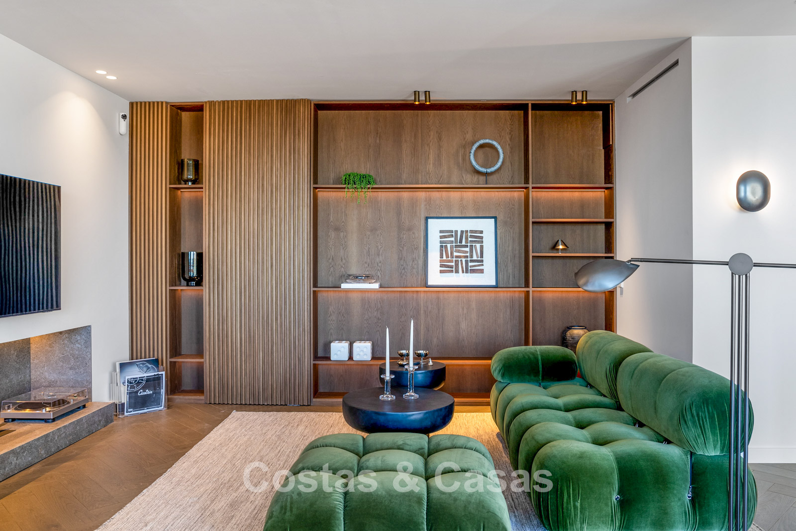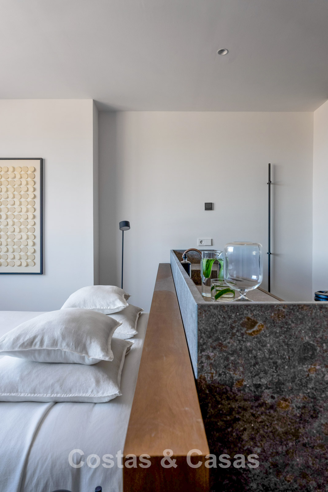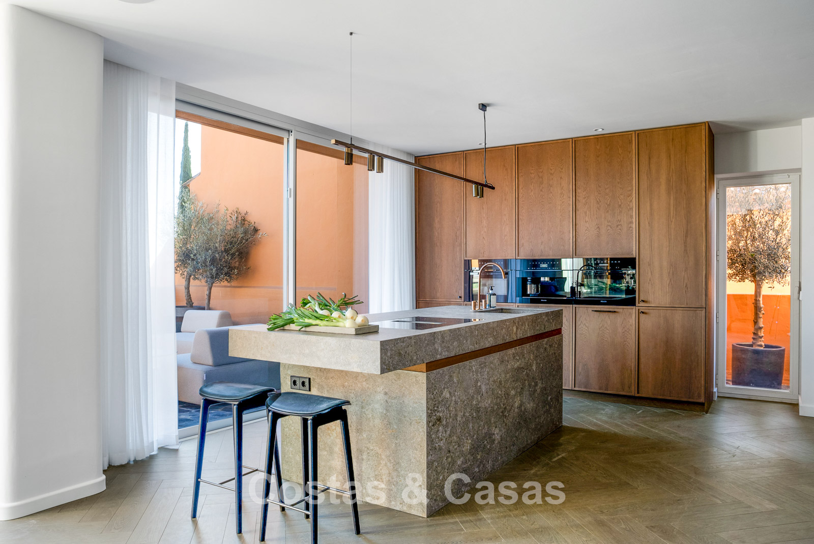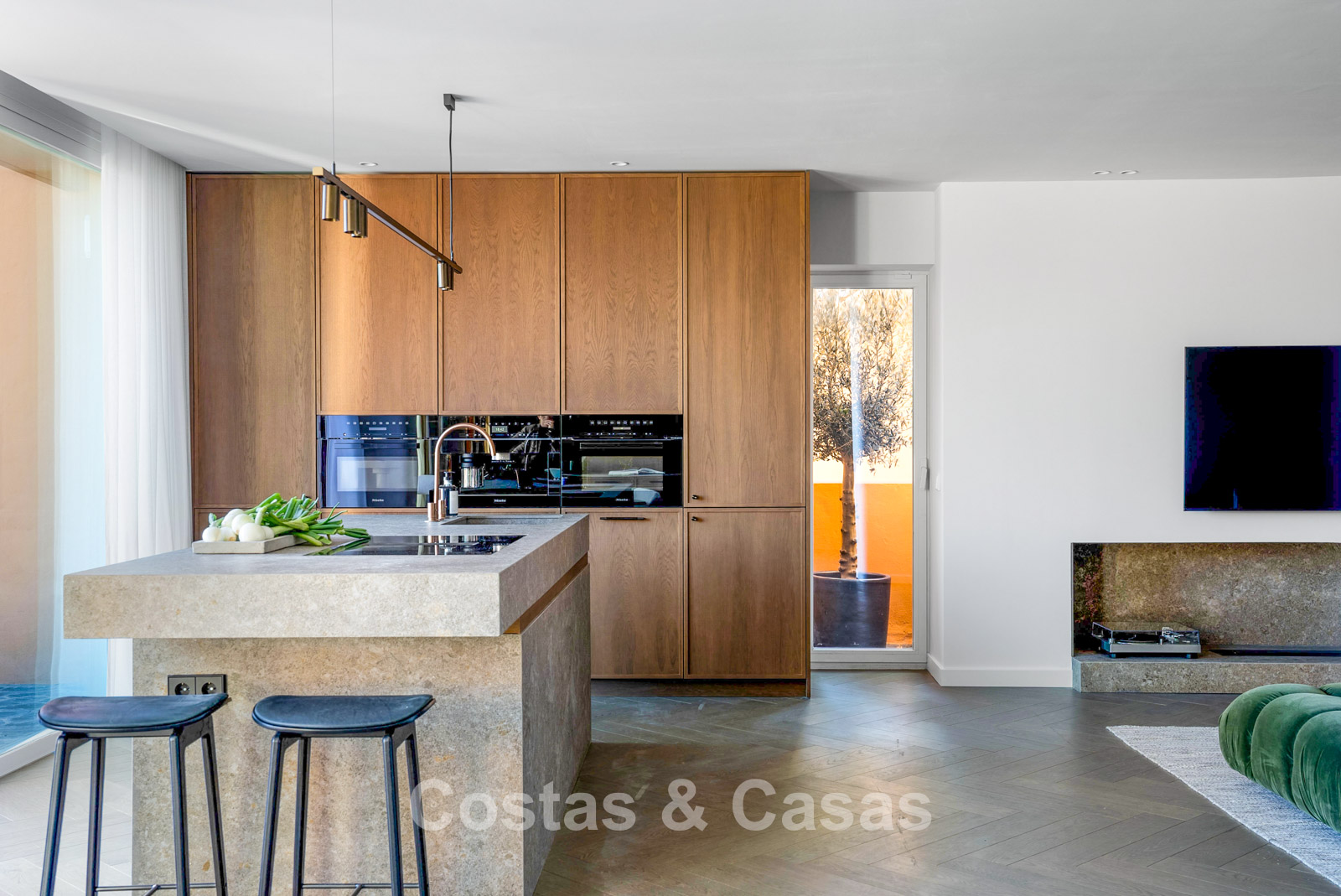Spacieux penthouse en duplex dans un complexe à l'architecture méditerranéenne contemporaine. Entièrement rénové aux normes les plus élevées, avec un oeil pour le luxe, le confort et le raffinement. Utilisant des matériaux de qualité, notamment de la pierre, des menuiseries en chêne foncé et des tuiles nervurées. Orienté plein sud. Vue sur la mer Méditerranée et le paysage montagneux. La vaste terrasse principale, avec une partie couverte, sera équipée d'une cuisine extérieure et d'un espace détente. L'intérieur respire le luxe moderne et le minimalisme, avec une forte concentration sur des lignes épurées, des matériaux naturels et une palette de couleurs chaudes et neutres. De hautes fenêtres coulissantes offrent un intérieur aéré et très lumineux. Espace de vie ouvert avec un salon TV élégant avec cheminée. La cuisine personnalisée a un style minimaliste moderne et luxueux avec des accents chaleureux et naturels. Espace repas intégré. Un escalier flottant avec des rampes monte à l'étage supérieur. 4 chambres, 4 salles de bains et une toilette séparée. La suite parentale dispose d'une salle de bain ouverte, d'un dressing et d'un accès à une élégante terrasse privée. Un espace entièrement dédié à la détente sera équipé d'un home cinéma et d'un bar à vin design. Parquets en structure à chevrons. Buanderie. Débarras. Garage intérieur pour 1 voiture.