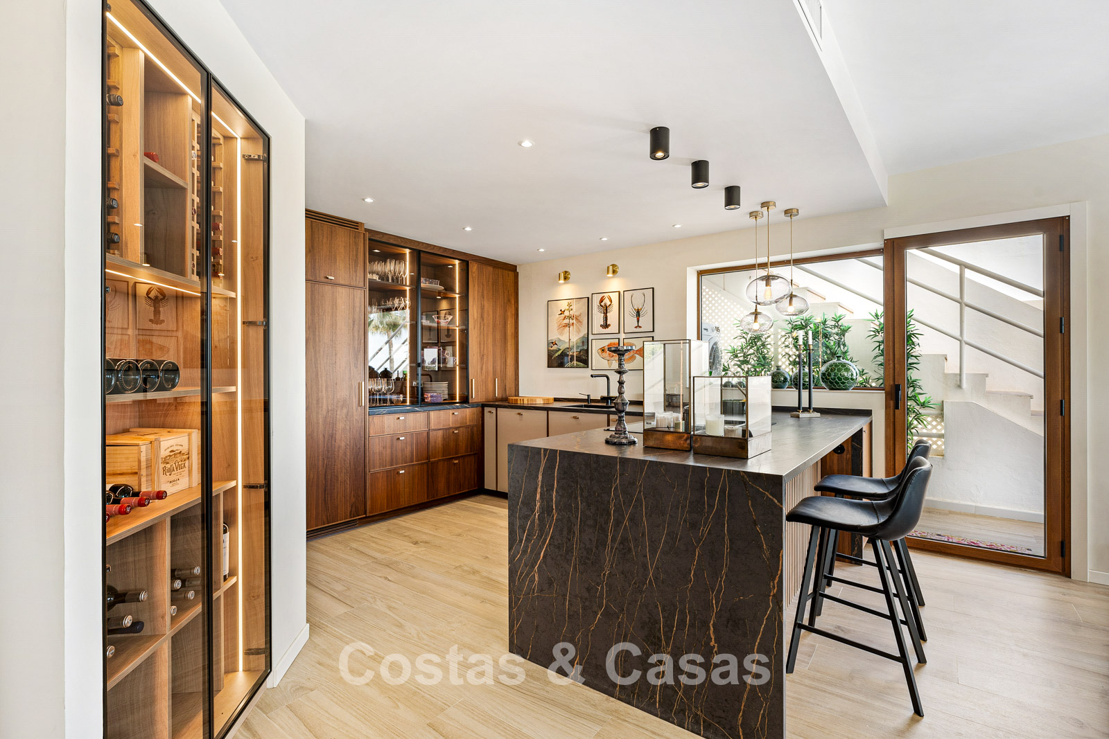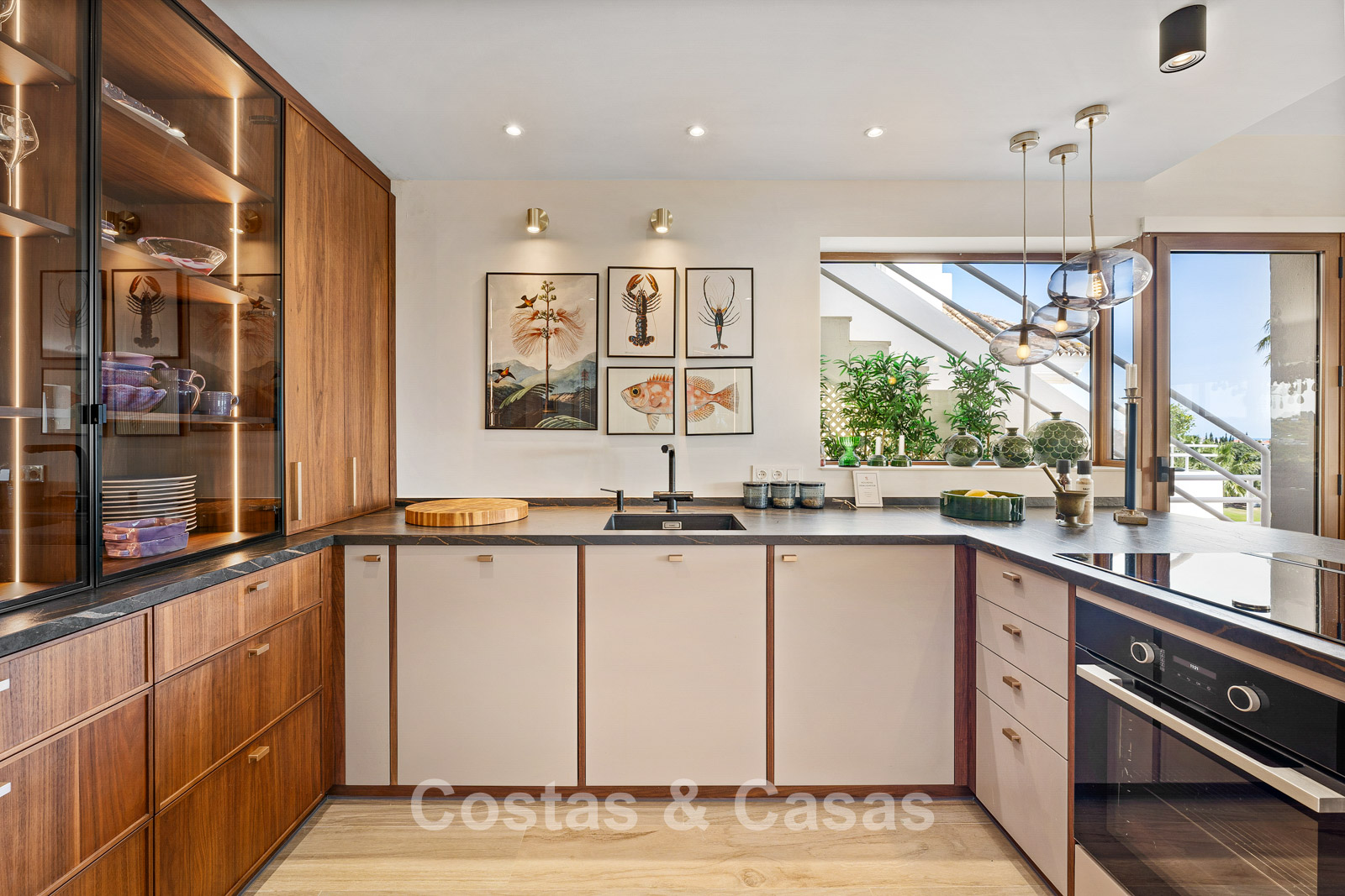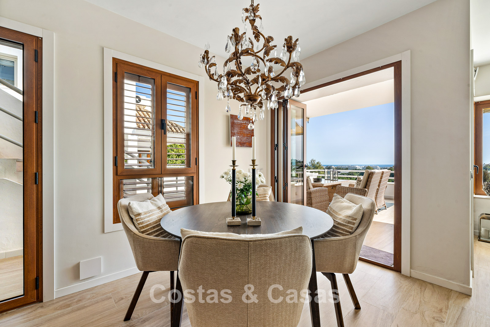 Duplex penthouse rénové avec des matériaux de qualité. En utilisant du matériel de haute qualité et avec un souci de finition. Vues imprenables sur la mer, parcours de golf luxuriants et piscines tranquilles. Plusieurs terrasses offrent un espace de détente. Une terrasse ombragée avec une grande cuisine extérieure avec coin barbecue et un coin repas extérieur. L'intérieur est caractérisé par de généreuses fenêtres qui laissent entrer une abondance de lumière naturelle et créent une atmosphère lumineuse et aérée. Espace de vie lumineux à aire ouverte. Cuisine ouverte sur mesure avec appareils électroménagers Miele de qualité et un bar à petit-déjeuner. Coin repas intégré. 3 chambres, 3 salles de bains et une toilette séparée. Carrelage avec structure bois pour un look chaleureux et élégant. Espace de bureau. Buanderie. Débarras. Parking.