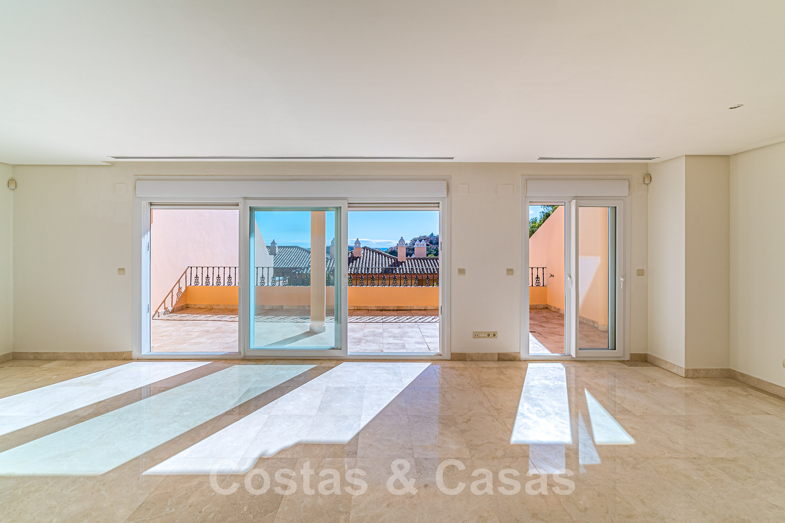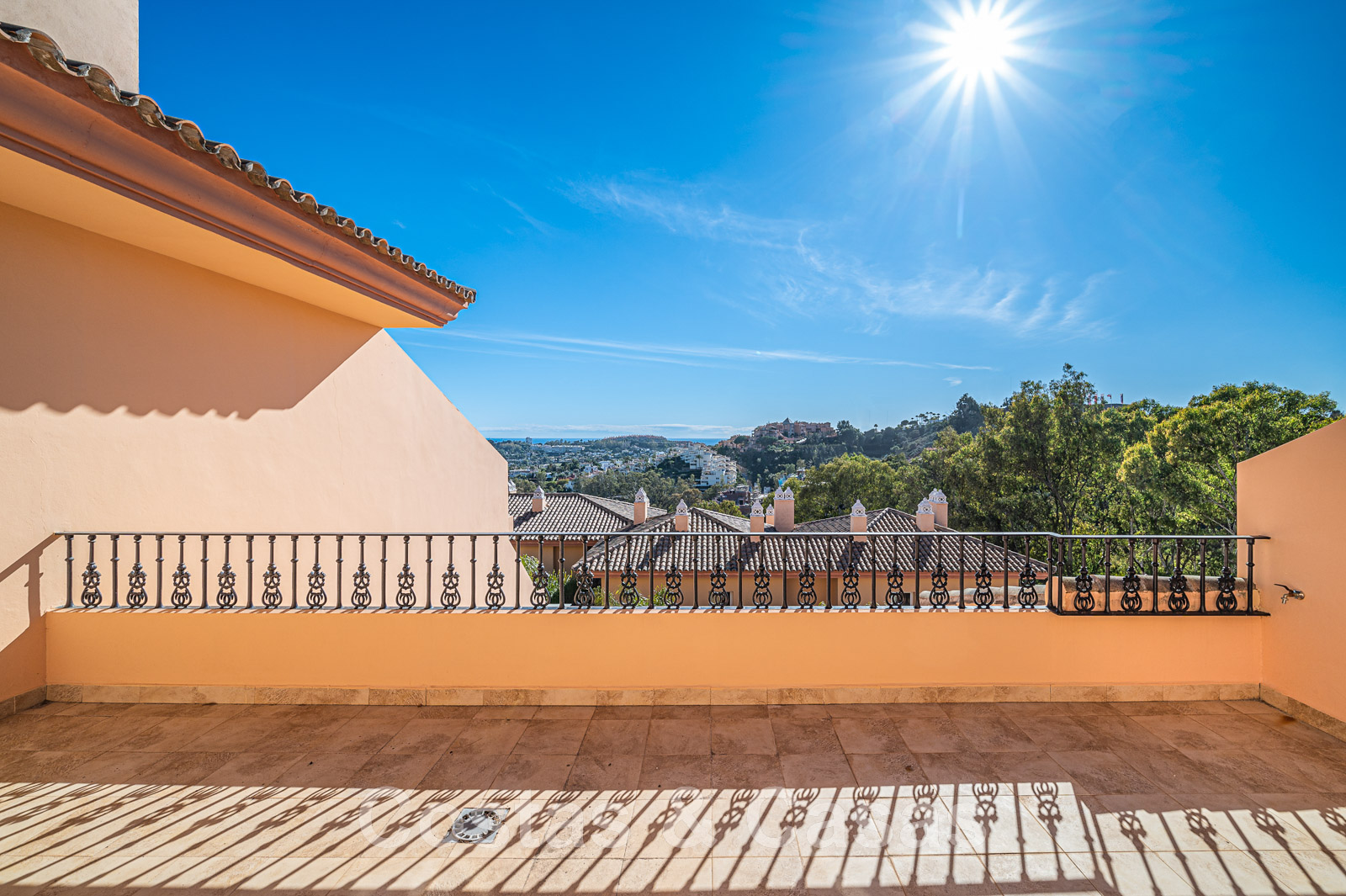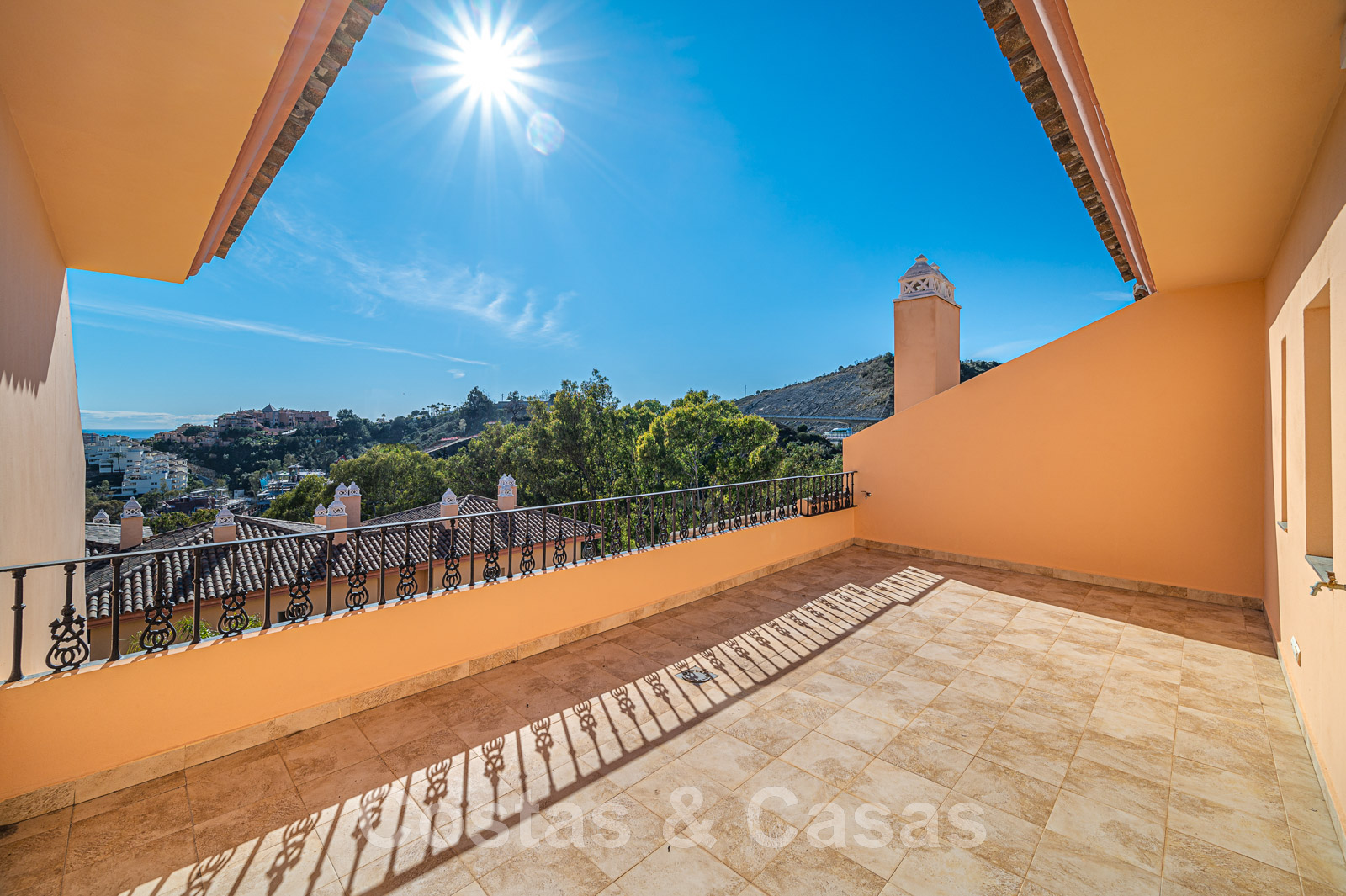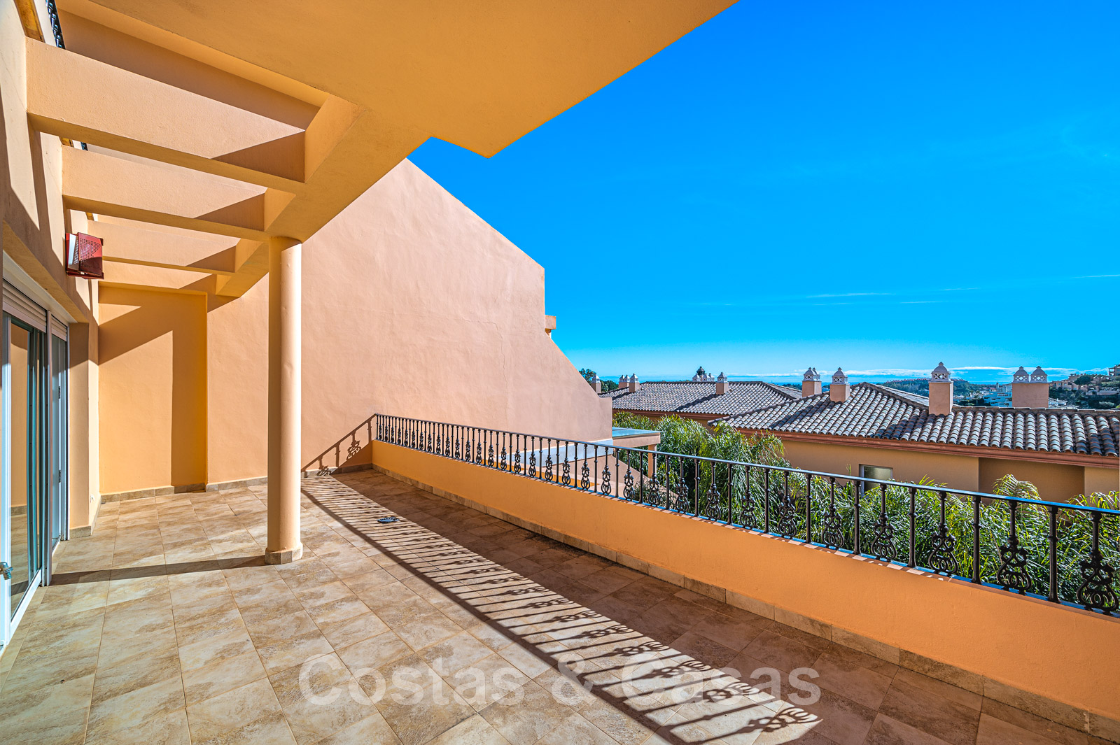 Terrasse spacieuse et ouverte avec la Méditerranée à l'horizon.