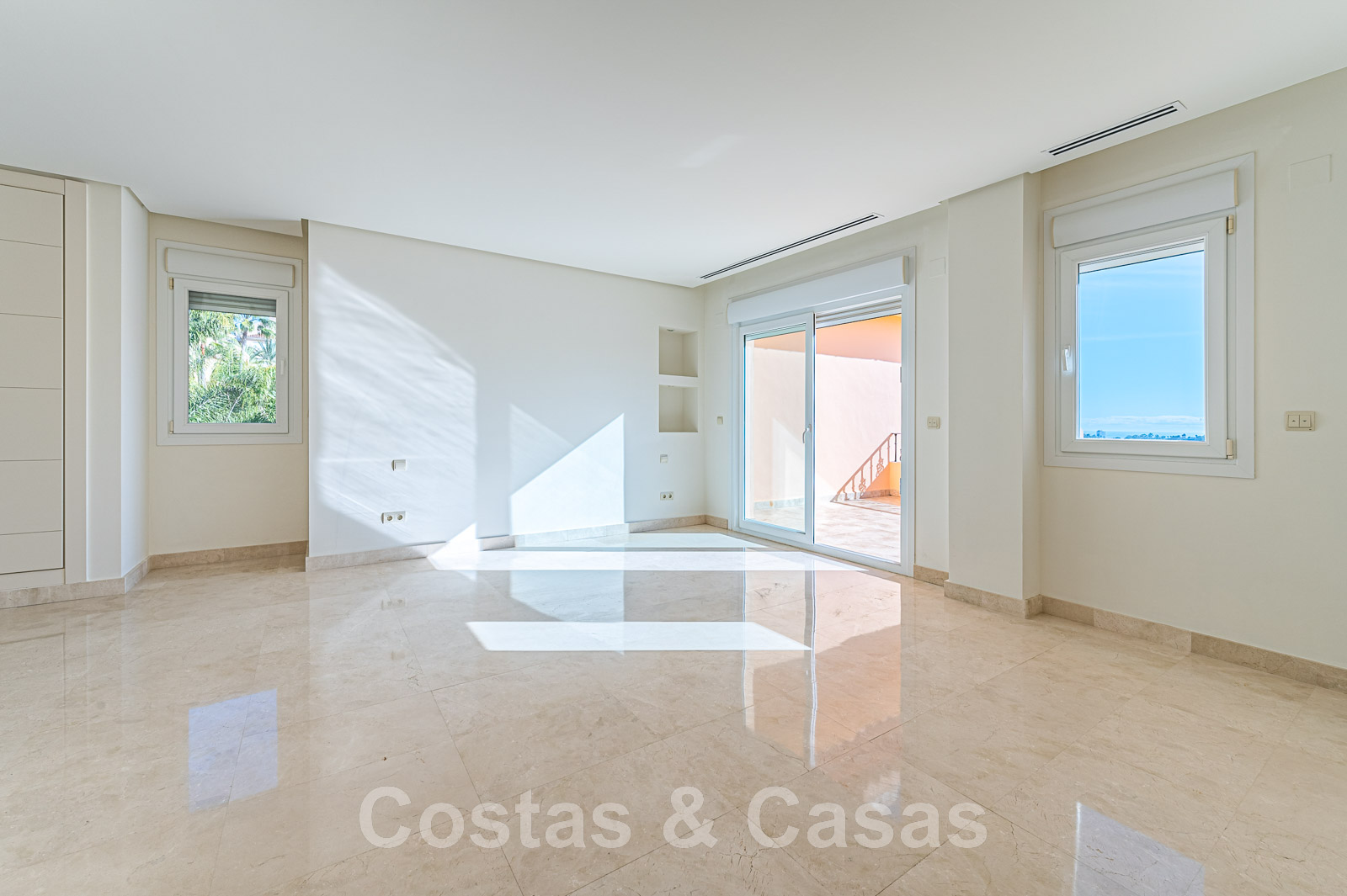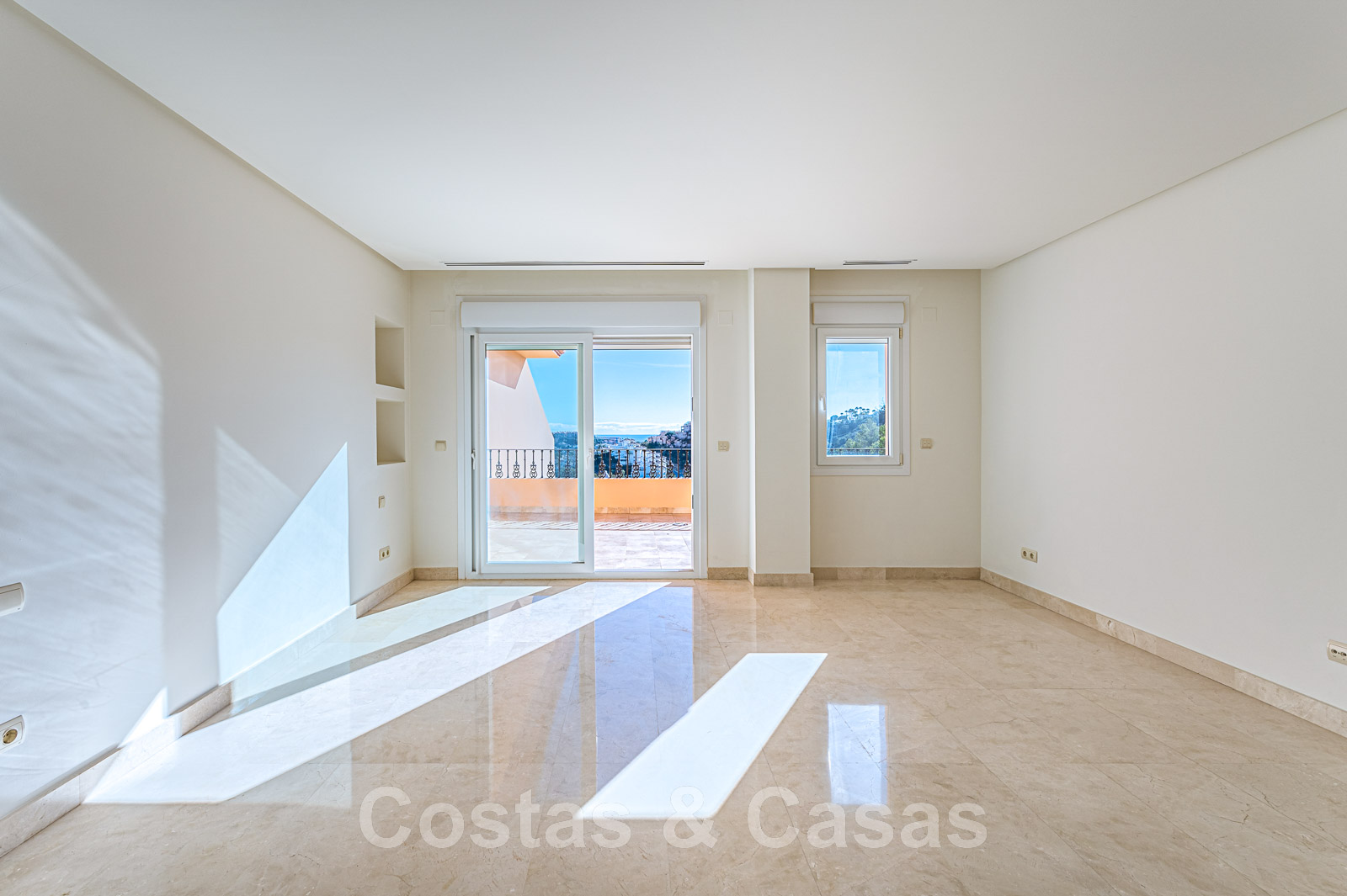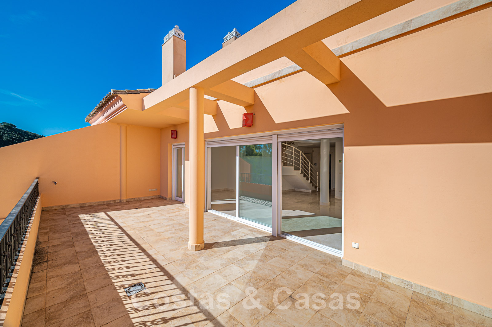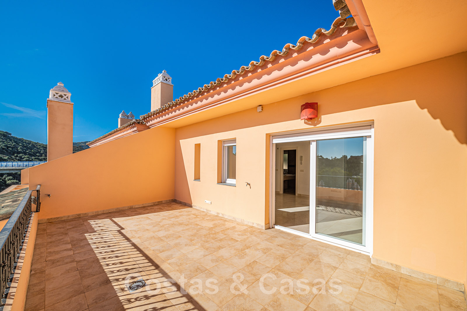 Terrasse spacieuse et ouverte avec la Méditerranée à l'horizon.
