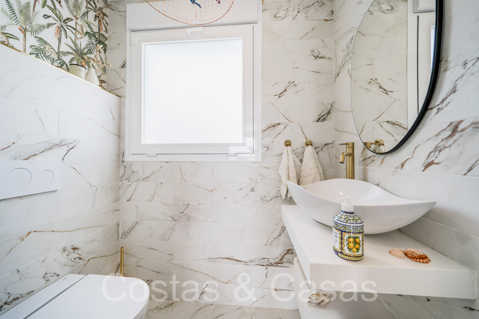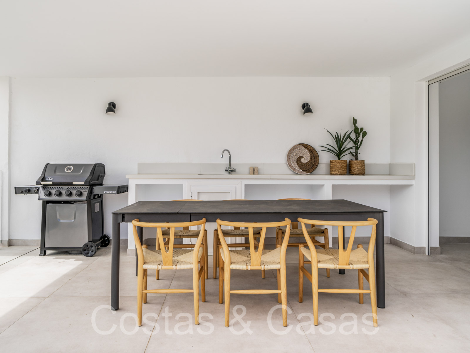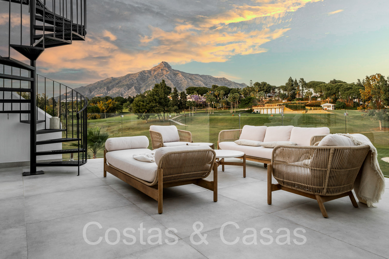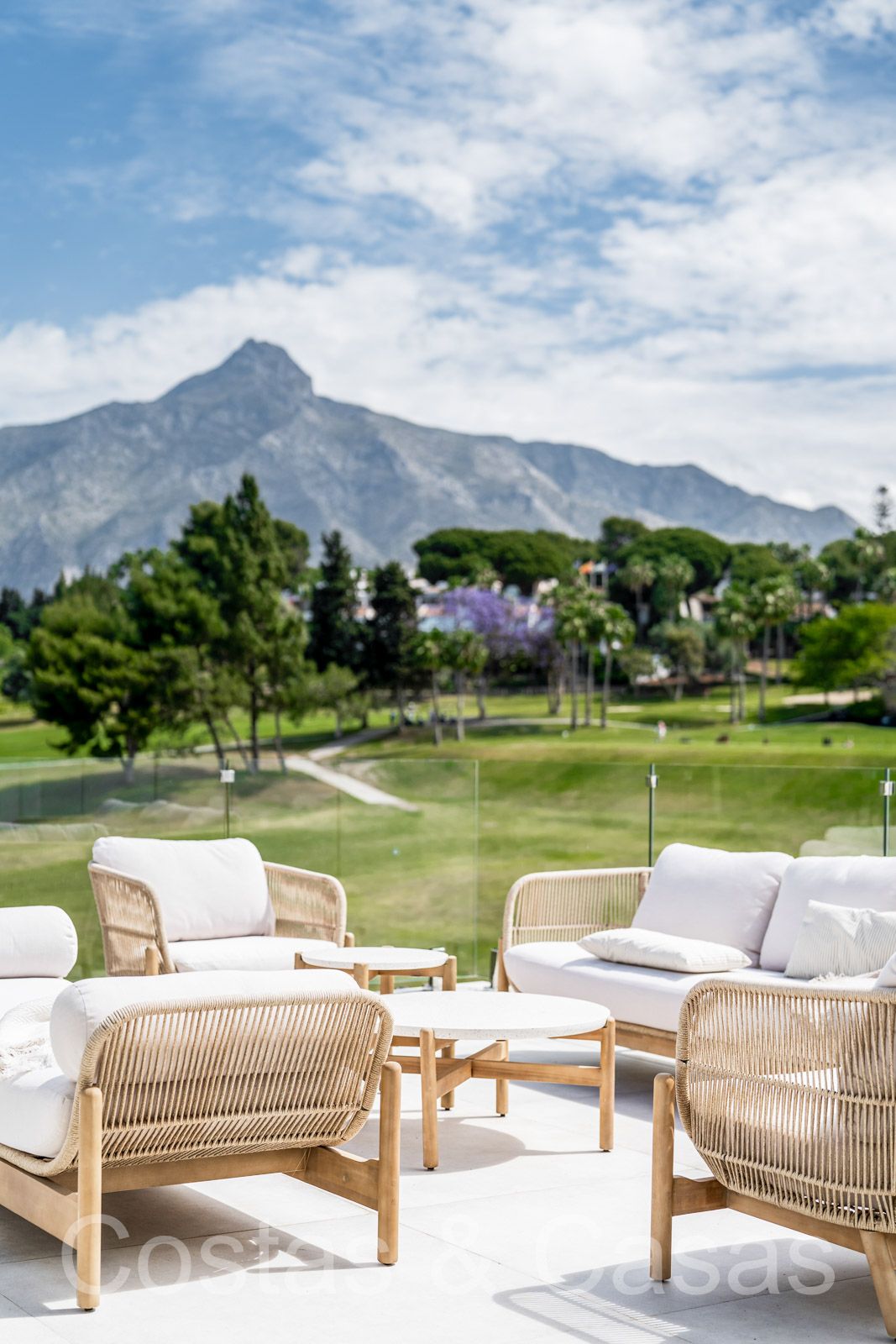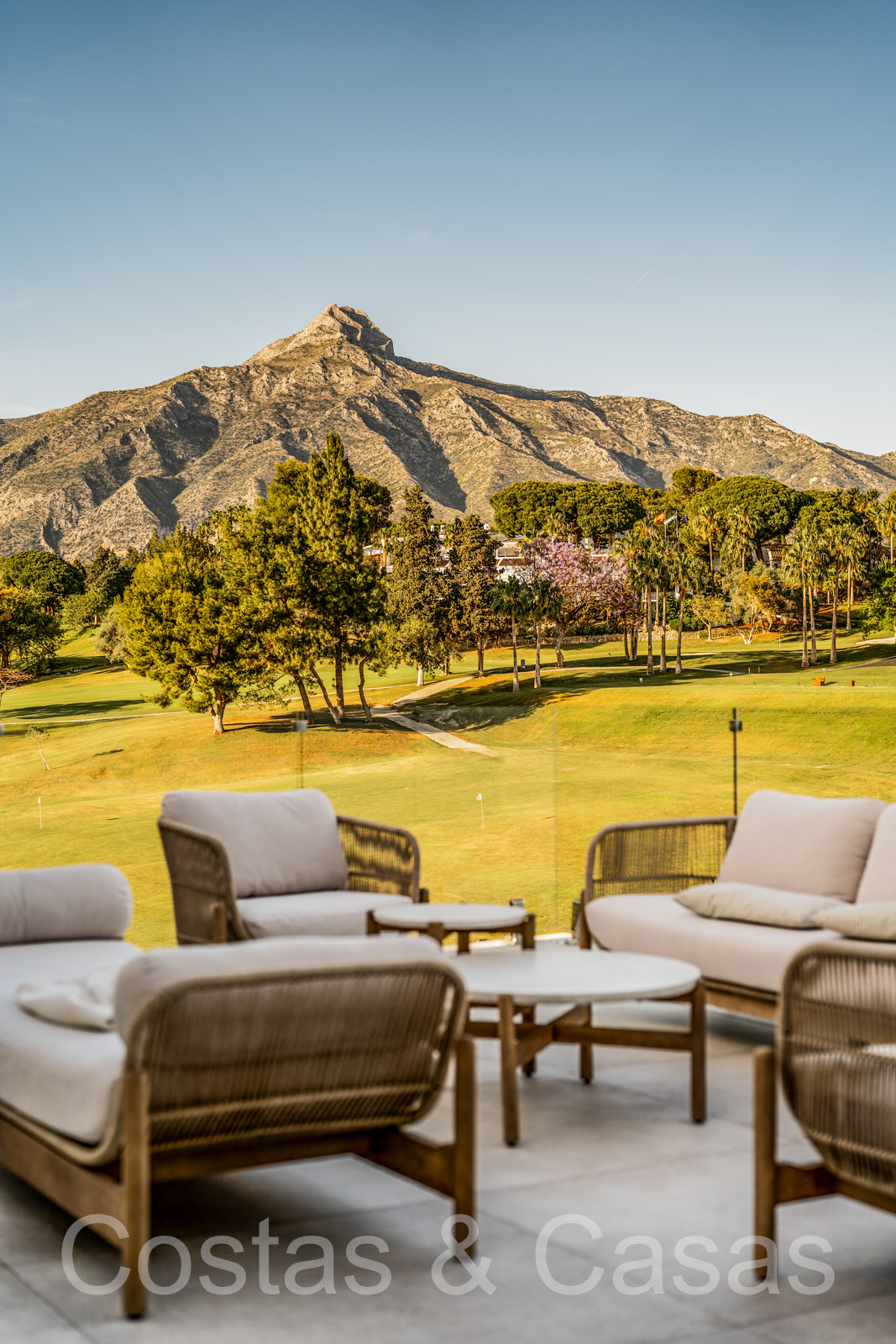 Charmante maison mitoyenne au style architectural méditerranéen et à l'aspect contemporain et stylé. Rénovée avec des matériaux et des finitions de qualité supérieure. Une terrasse couverteest équipée d'un barbecue et offre la possibilité de profiter d'un dîner convivial en plein air en famille ou entre amis. De vastes terrasses ensoleillées offrent un espace pour installer des installations de détente. Un escalier en colimaçon vous mène de la terrasse principale au spacieux solarium où vous pourrez profiter de plus d'espace de détente. Vous bénéficiez d'une belle vue sur les fairways verts et la montagne de La Concha. Un intérieur dynamique avec un agencement ouvert et de hautes fenêtres coulissantes optimise la lumière naturelle. Le séjour est divisé en un salon et un coin repas intégré. Cuisine ouverte, entièrement équipée avec appareils Siemens et bar pour le petit-déjeuner. En plus de 3 chambres et 3 salles de bains, il y a un logement d'amis exclusif avec sa propre kitchenette, salon et salle de bain. Sols en carrelage de couleur claire de haute qualité.
