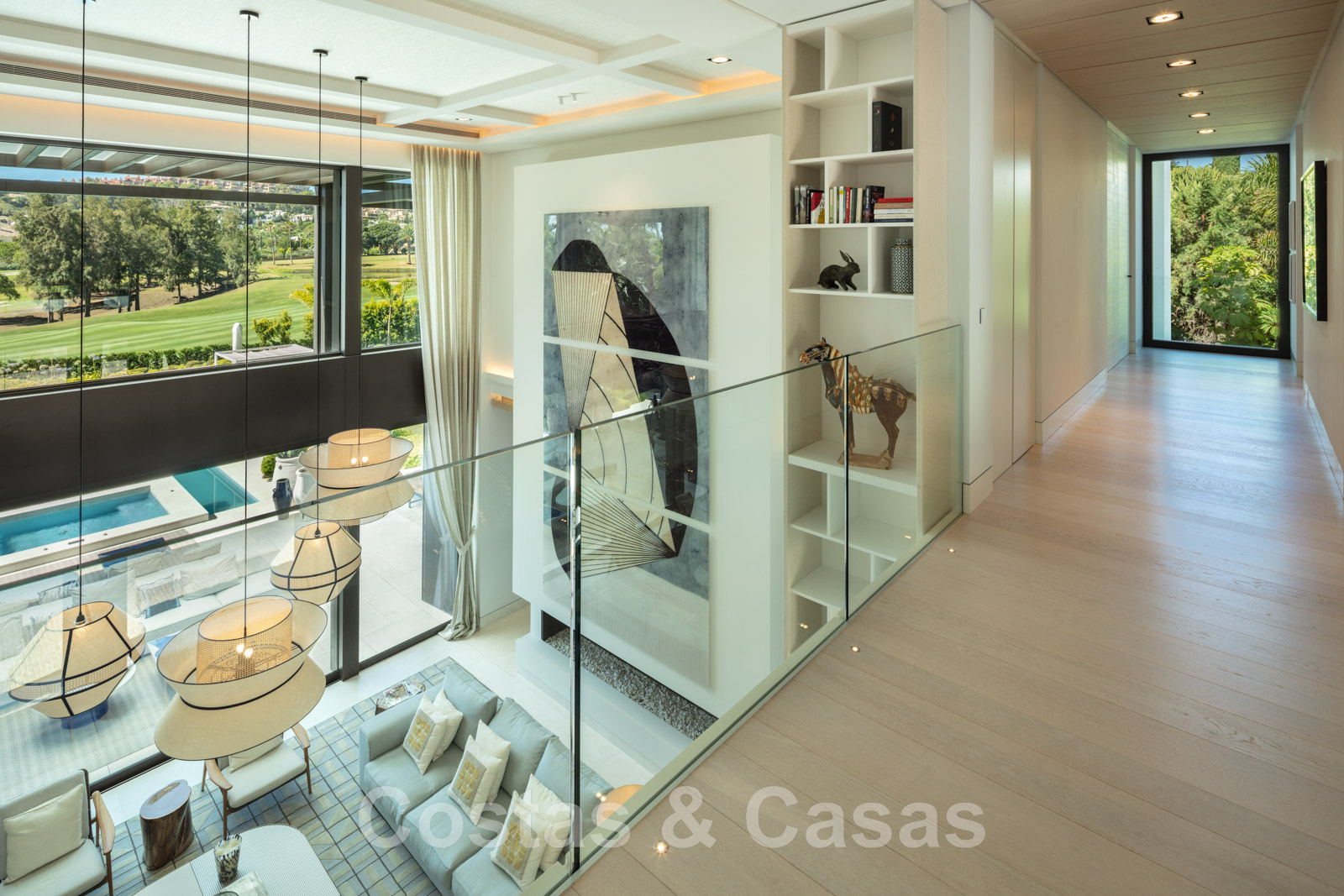 Le palier supérieur, protégé par des rampes en verre, relie les deux ailes et donne sur le grand salon.