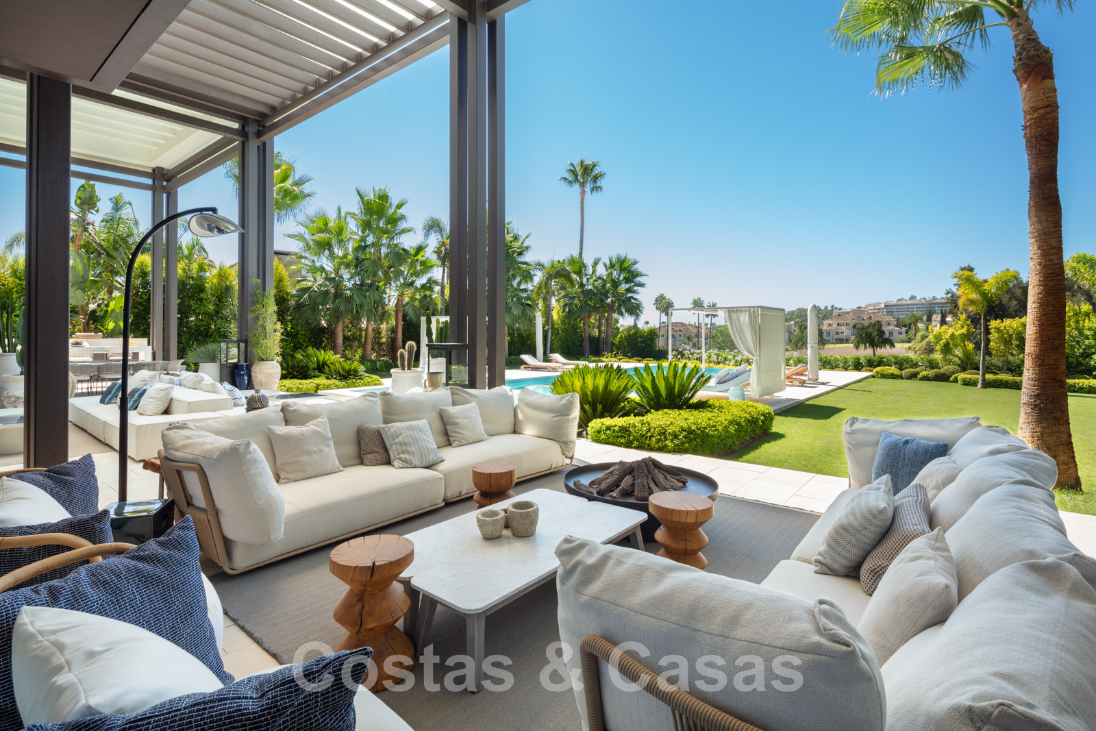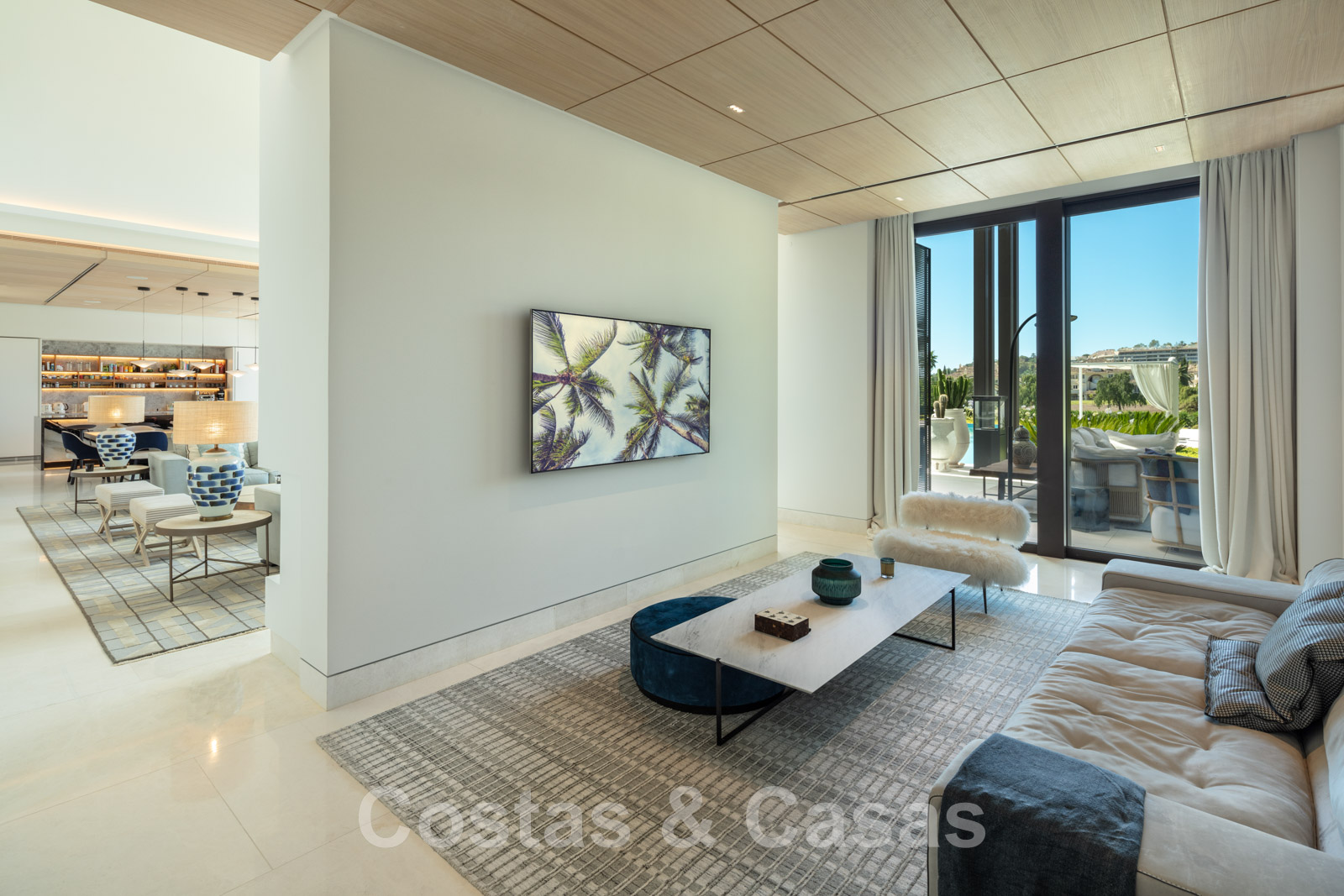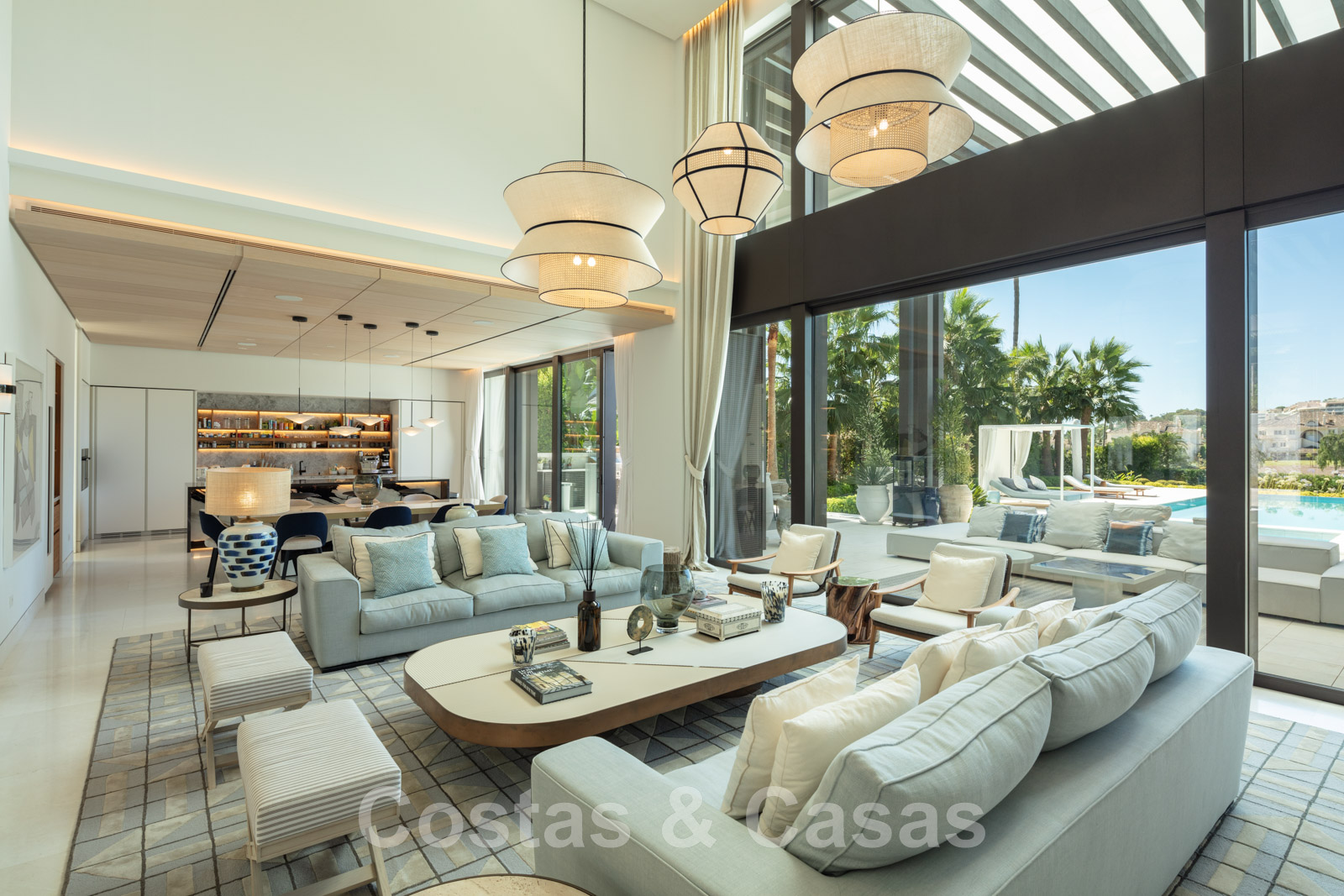 À côté du salon se trouve un lounge extérieur dont la hauteur de plafond est la même partout.