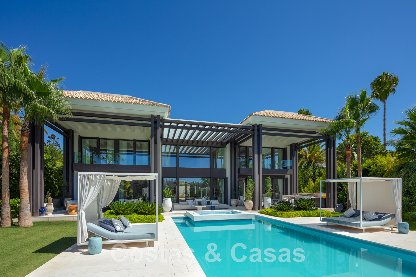 Piscine chauffée avec jacuzzi, entourée d'une terrasse agrémentée de chaises longues balinaises.