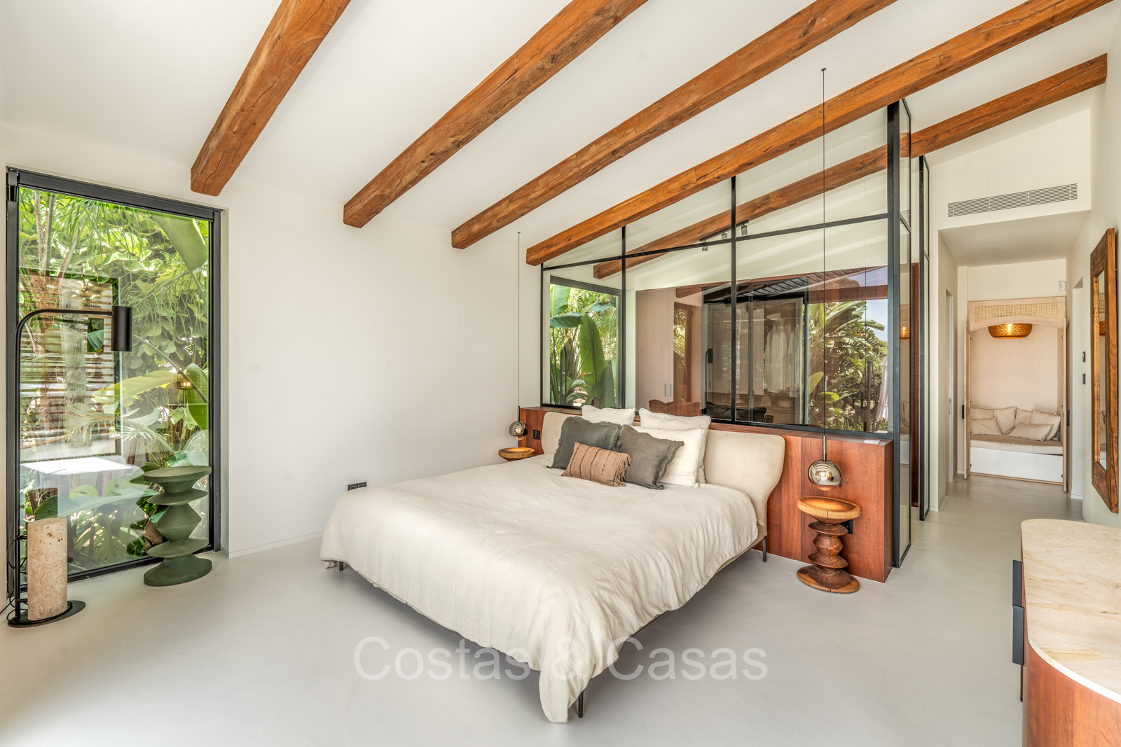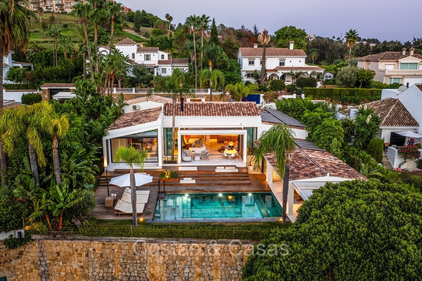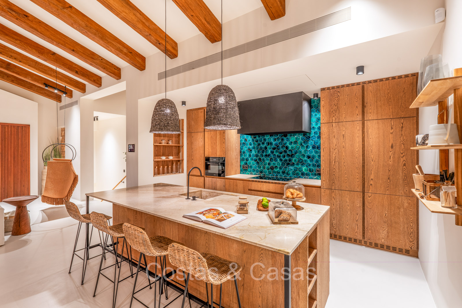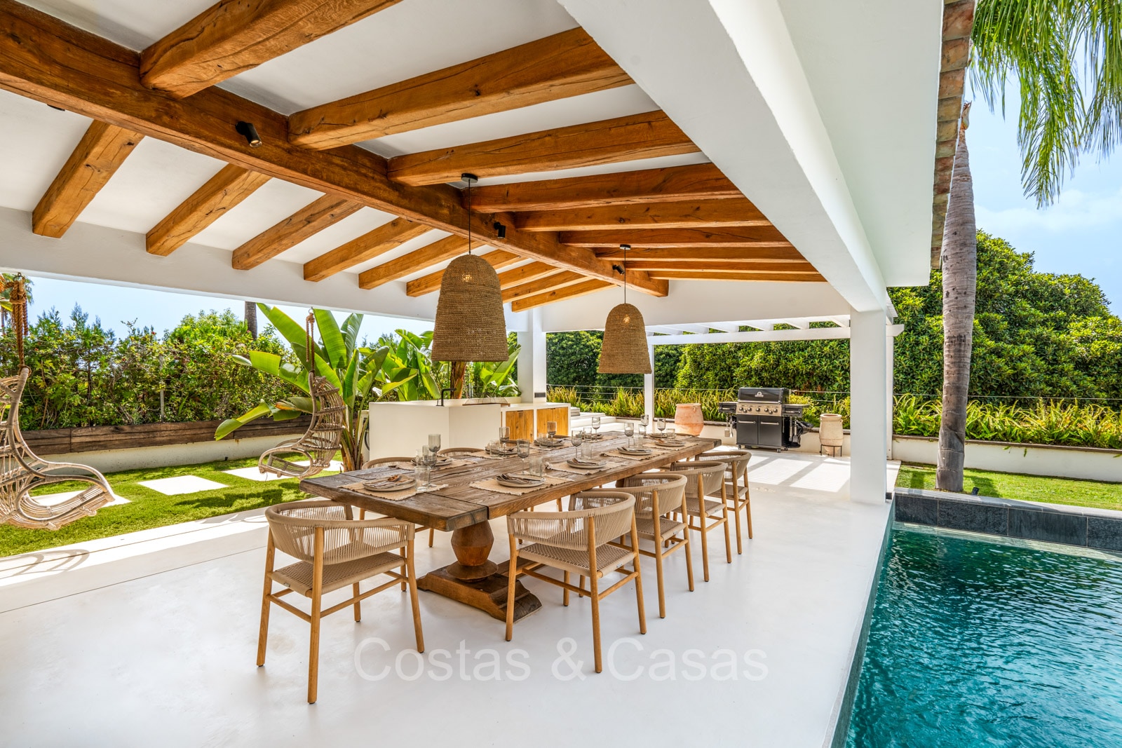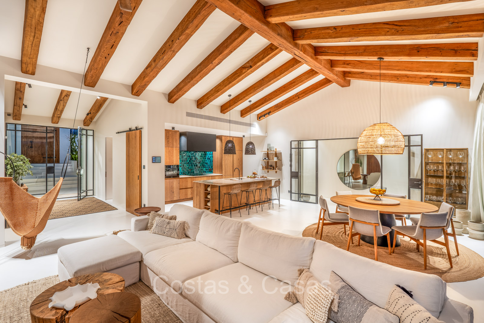 La villa individuelle dégage une combinaison unique de raffinement, d'espace et de chaleur, où l'intérieur dégage une atmosphère bohème et les espaces extérieurs forment une oasis méditerranéenne. Rénovée avec une attention à une finition supérieure. En entrant, vous êtes accueilli par un aménagement spacieux et ouvert avec de hauts plafonds et de grandes fenêtres laissant entrer beaucoup de lumière naturelle. Les poutres en bois au plafond et les tissus doux créent une ambiance accueillante et relaxante. Portes intérieures vitrées du sol au plafond. Le salon confortable comprend des éléments ludiques, notamment un hamac et une cheminée flottante. Coin repas intégré. Cuisine/salle à manger pratique, entièrement équipée avec des appareils électroménagers haut de gamme et un îlot où vous pouvez vous asseoir. 5 chambres, 6 salles de bains et une toilette séparée. La suite principale dispose d'une salle de bains spacieuse avec baignoire, douche et dressing en verre. Un sol en béton blanc poli et sans joint. Home cinéma style loft. Buanderie. Abri voiture pour 2 voitures.
