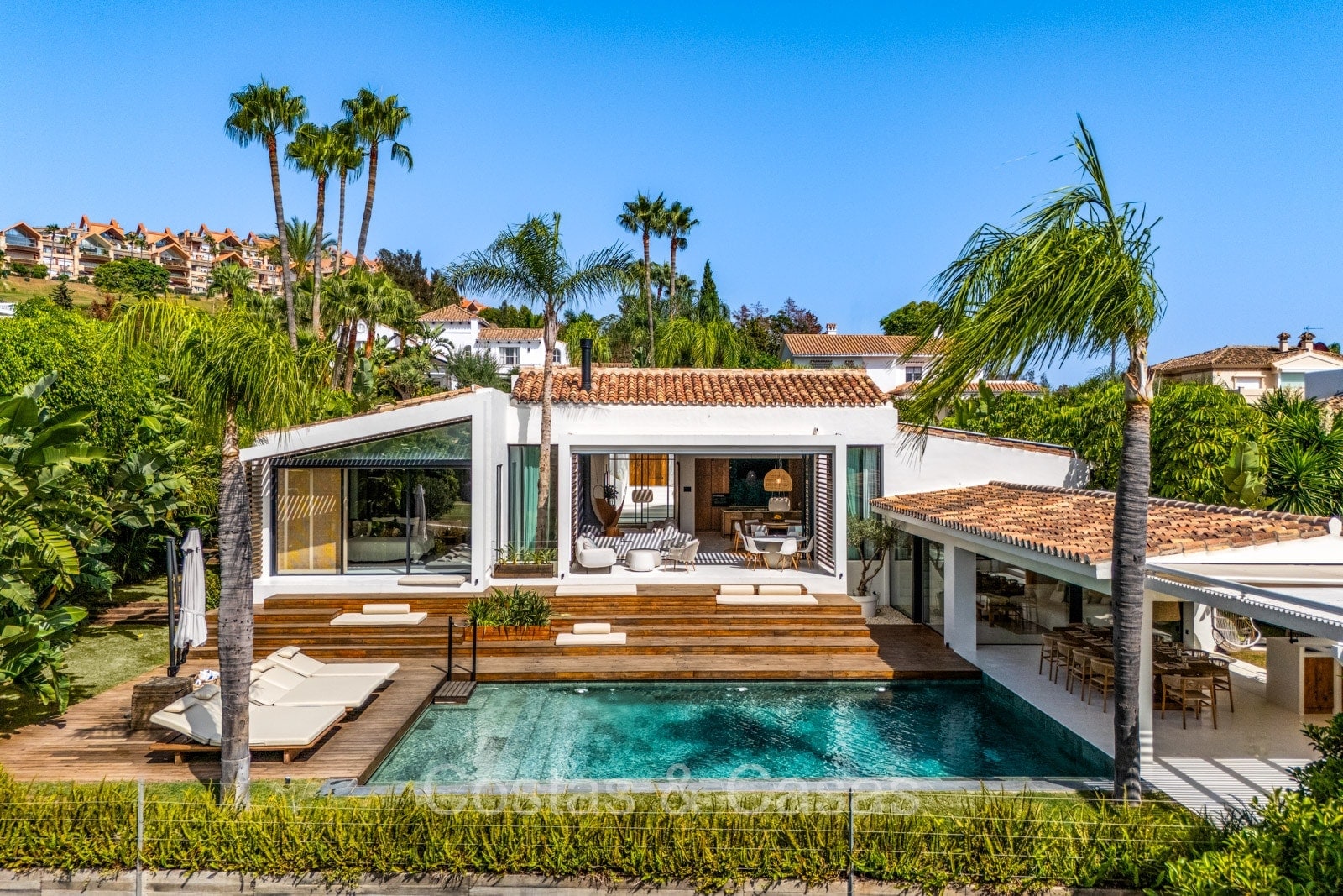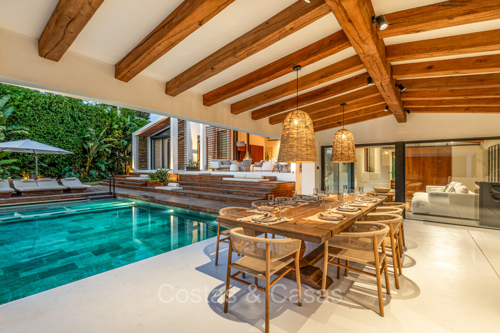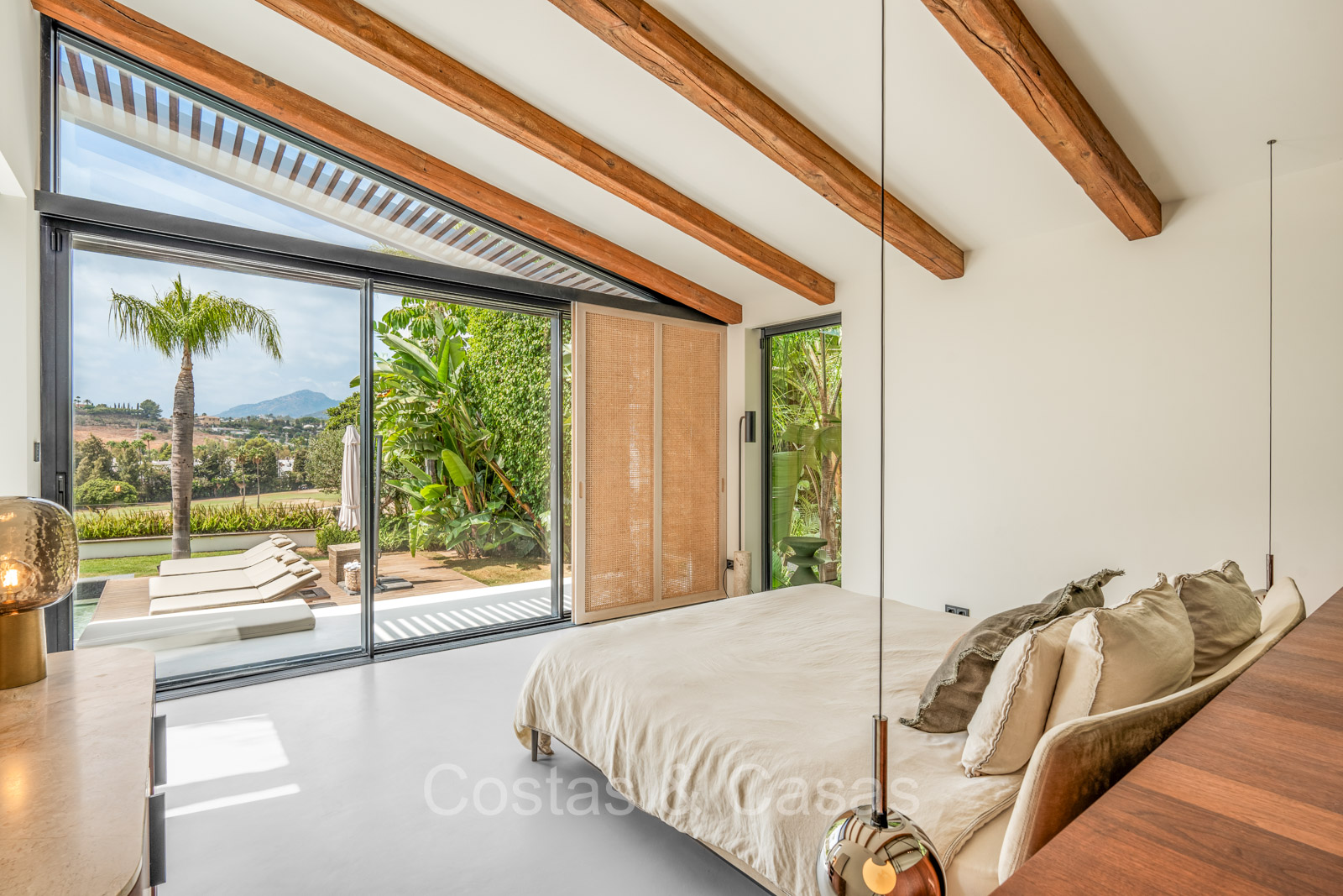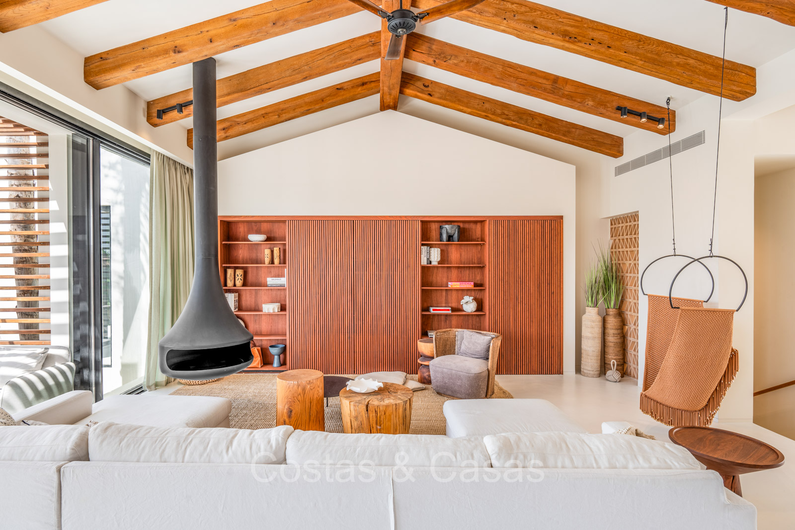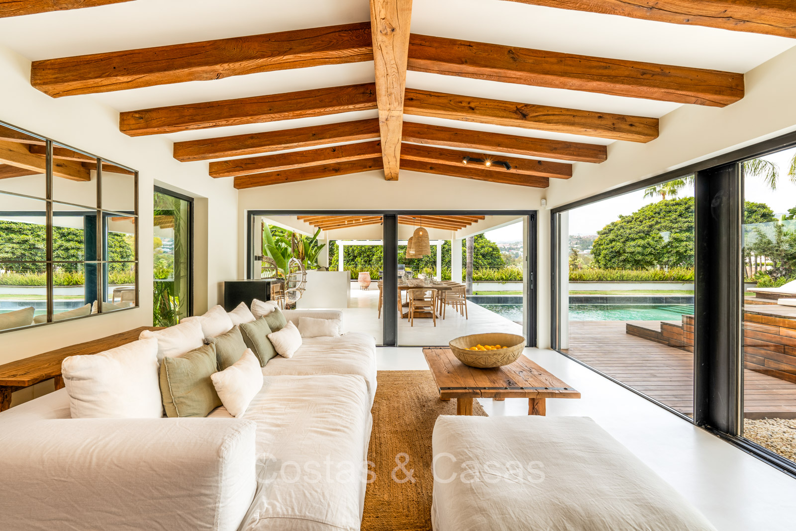 La villa individuelle dégage une combinaison unique de raffinement, d'espace et de chaleur, où l'intérieur dégage une atmosphère bohème et les espaces extérieurs forment une oasis méditerranéenne. Rénovée avec une attention à une finition supérieure. En entrant, vous êtes accueilli par un aménagement spacieux et ouvert avec de hauts plafonds et de grandes fenêtres laissant entrer beaucoup de lumière naturelle. Les poutres en bois au plafond et les tissus doux créent une ambiance accueillante et relaxante. Portes intérieures vitrées du sol au plafond. Le salon confortable comprend des éléments ludiques, notamment un hamac et une cheminée flottante. Coin repas intégré. Cuisine/salle à manger pratique, entièrement équipée avec des appareils électroménagers haut de gamme et un îlot où vous pouvez vous asseoir. 5 chambres, 6 salles de bains et une toilette séparée. La suite principale dispose d'une salle de bains spacieuse avec baignoire, douche et dressing en verre. Un sol en béton blanc poli et sans joint. Home cinéma style loft. Buanderie. Abri voiture pour 2 voitures.