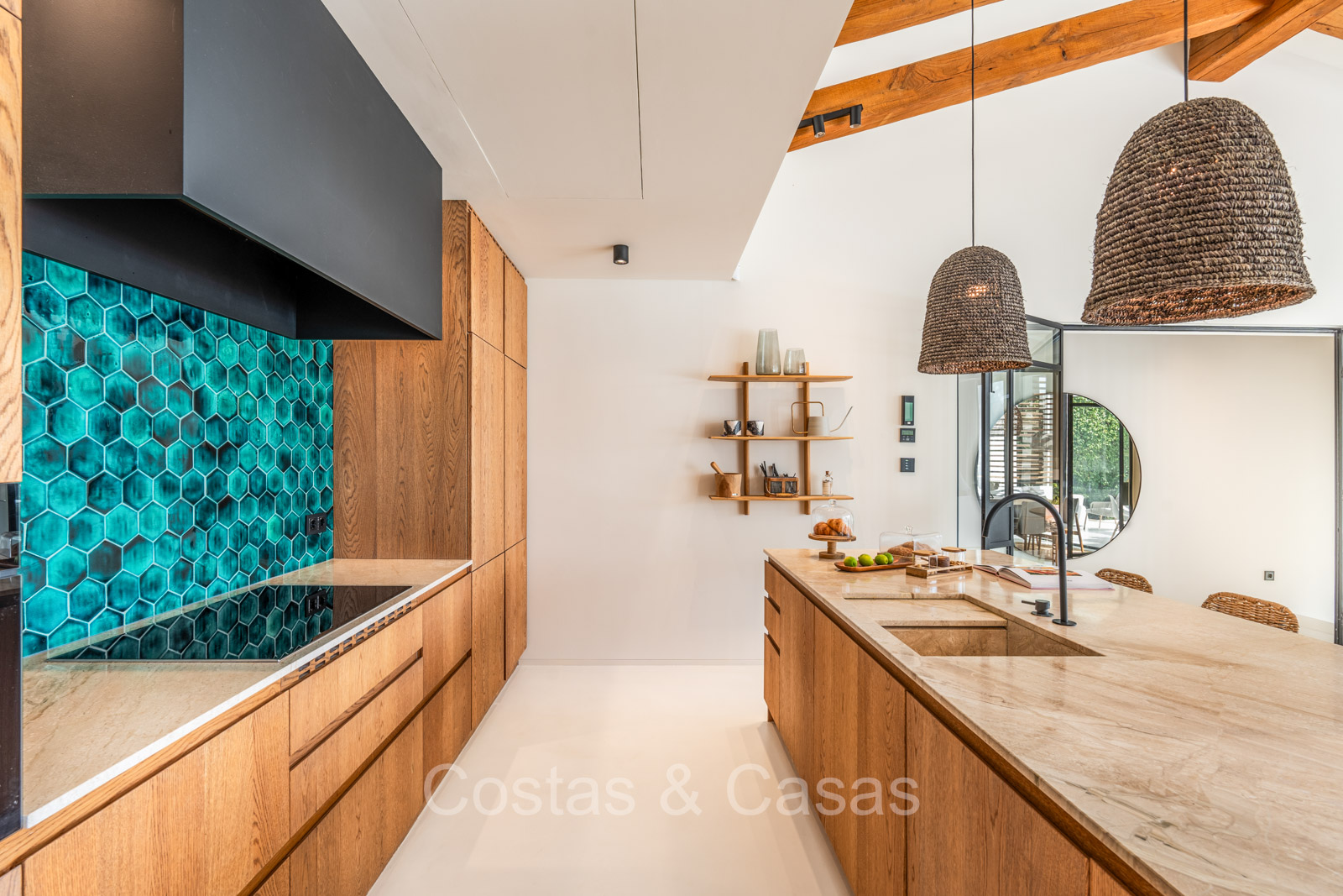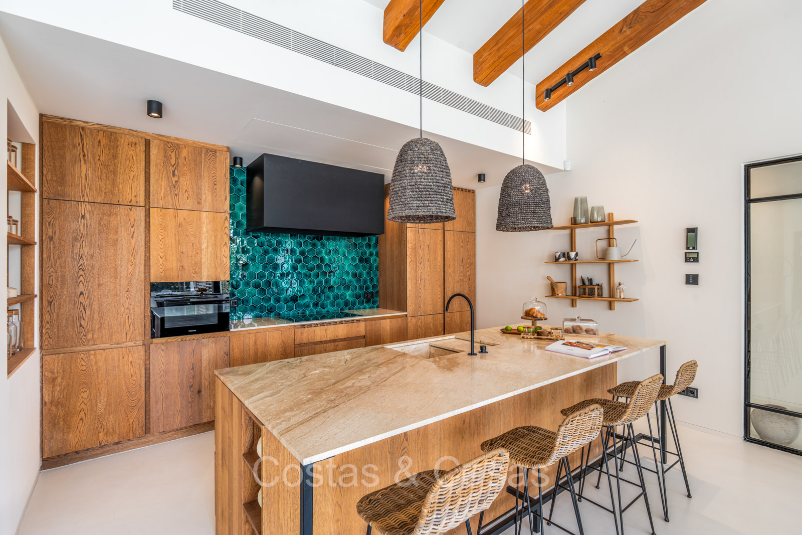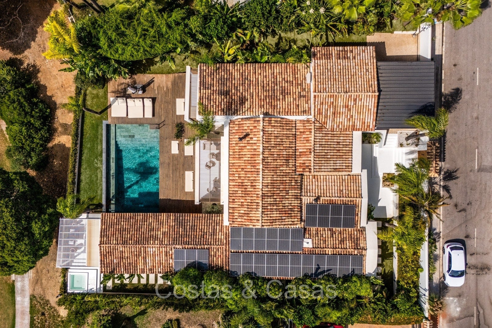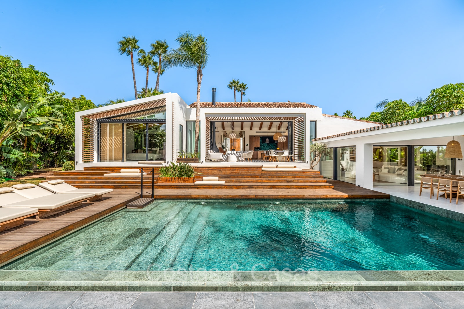 La villa individuelle dégage une combinaison unique de raffinement, d'espace et de chaleur, où l'intérieur dégage une atmosphère bohème et les espaces extérieurs forment une oasis méditerranéenne. Rénovée avec une attention à une finition supérieure. En entrant, vous êtes accueilli par un aménagement spacieux et ouvert avec de hauts plafonds et de grandes fenêtres laissant entrer beaucoup de lumière naturelle. Les poutres en bois au plafond et les tissus doux créent une ambiance accueillante et relaxante. Portes intérieures vitrées du sol au plafond. Le salon confortable comprend des éléments ludiques, notamment un hamac et une cheminée flottante. Coin repas intégré. Cuisine/salle à manger pratique, entièrement équipée avec des appareils électroménagers haut de gamme et un îlot où vous pouvez vous asseoir. 5 chambres, 6 salles de bains et une toilette séparée. La suite principale dispose d'une salle de bains spacieuse avec baignoire, douche et dressing en verre. Un sol en béton blanc poli et sans joint. Home cinéma style loft. Buanderie. Abri voiture pour 2 voitures.