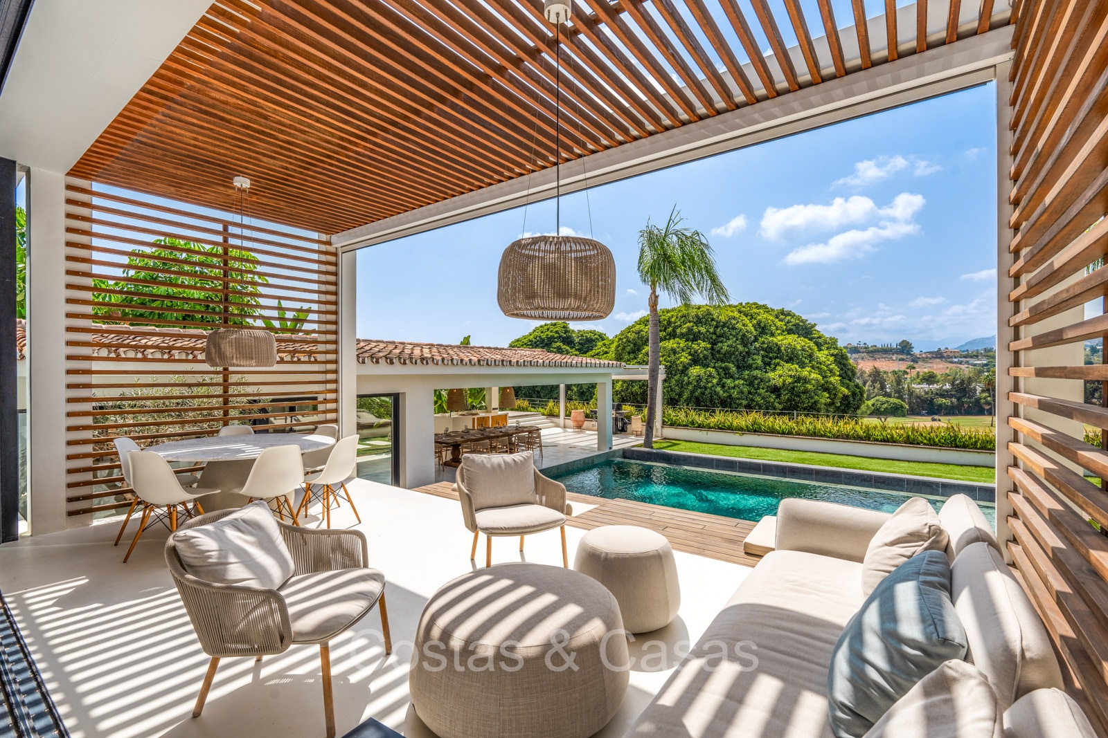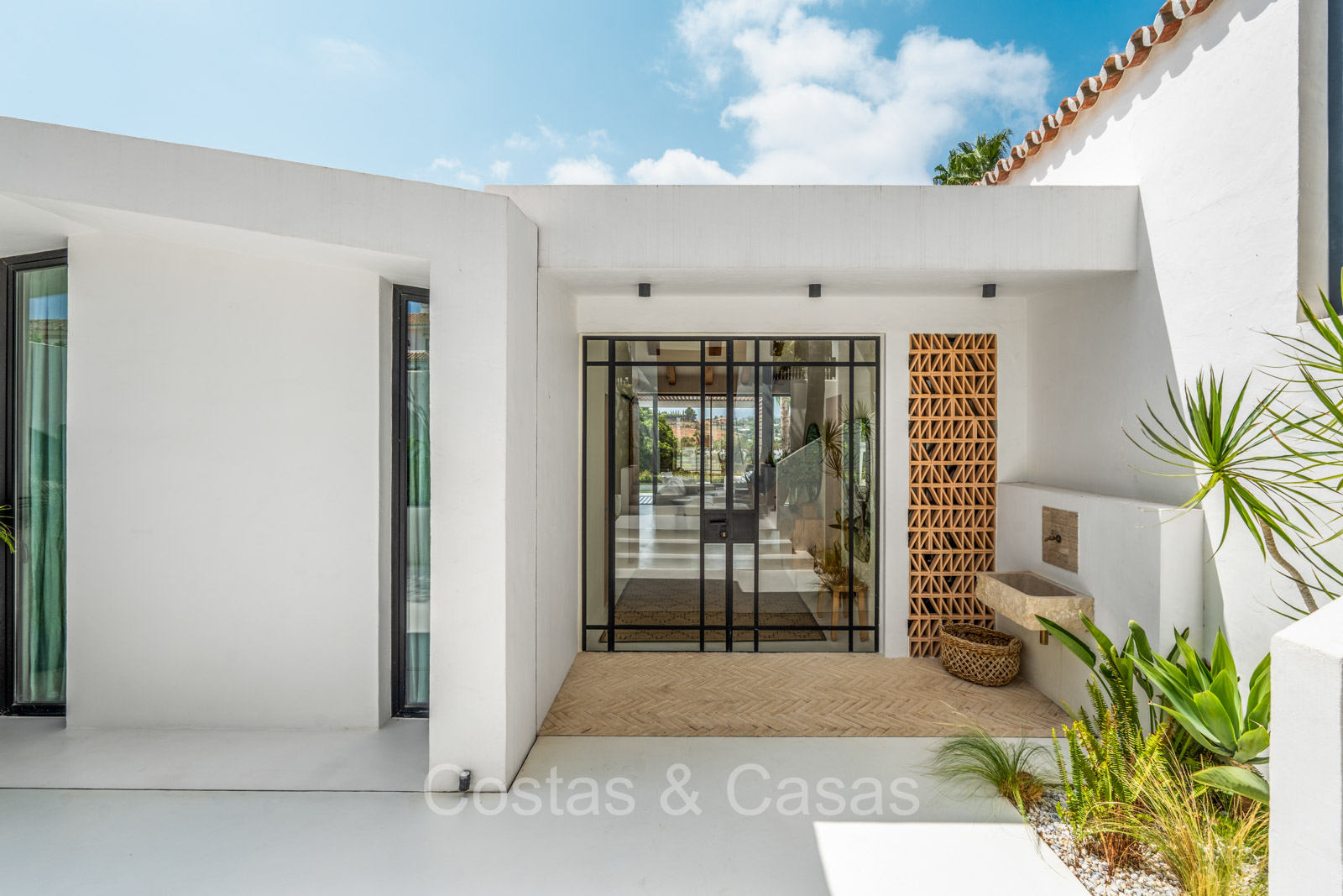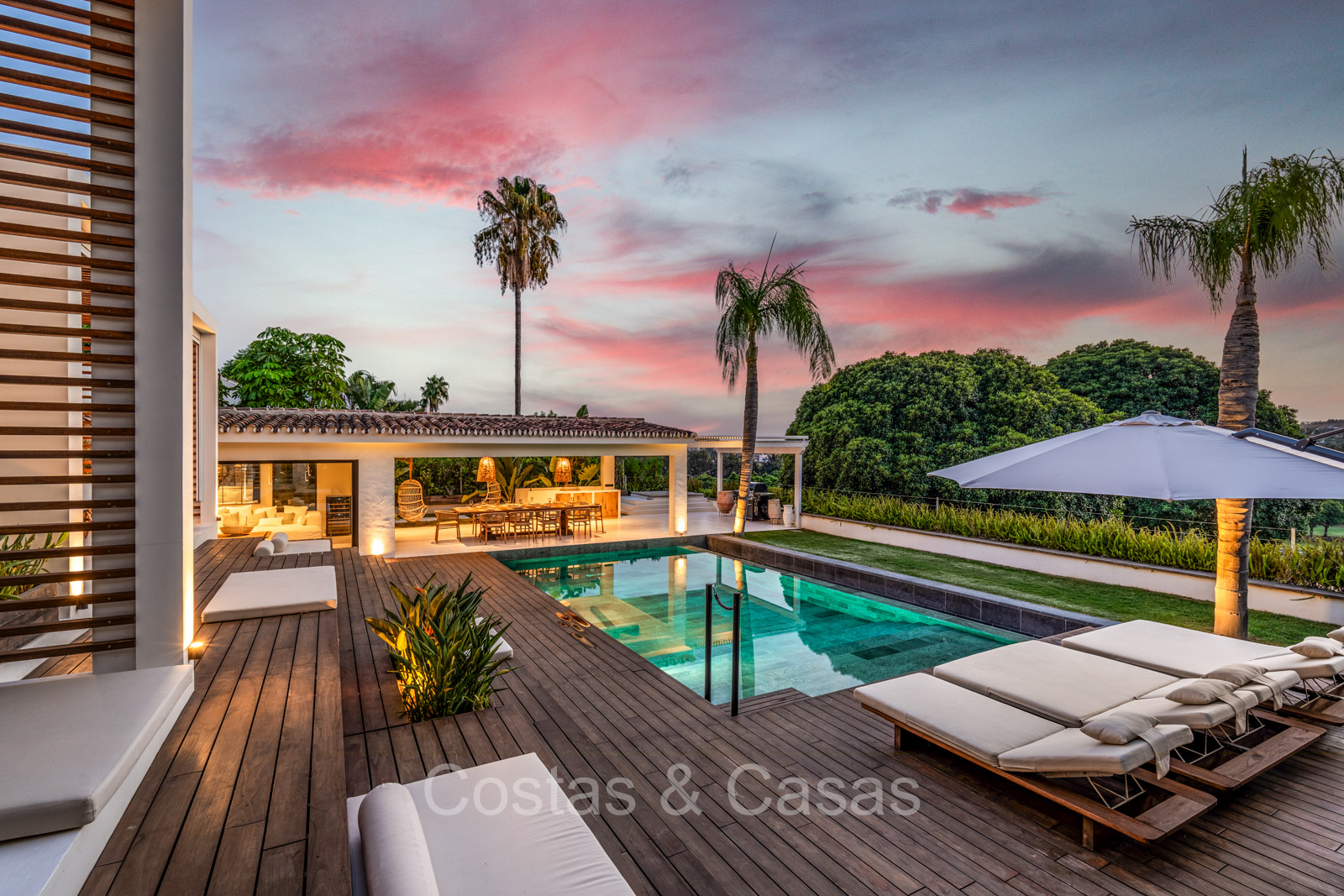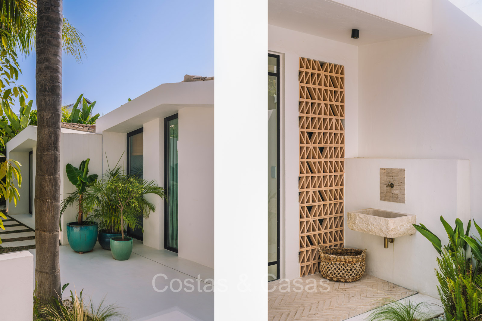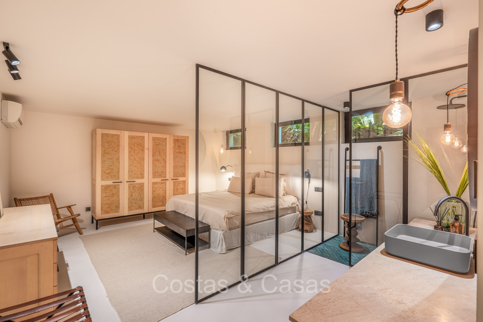 La villa individuelle dégage une combinaison unique de raffinement, d'espace et de chaleur, où l'intérieur dégage une atmosphère bohème et les espaces extérieurs forment une oasis méditerranéenne. Rénovée avec une attention à une finition supérieure. En entrant, vous êtes accueilli par un aménagement spacieux et ouvert avec de hauts plafonds et de grandes fenêtres laissant entrer beaucoup de lumière naturelle. Les poutres en bois au plafond et les tissus doux créent une ambiance accueillante et relaxante. Portes intérieures vitrées du sol au plafond. Le salon confortable comprend des éléments ludiques, notamment un hamac et une cheminée flottante. Coin repas intégré. Cuisine/salle à manger pratique, entièrement équipée avec des appareils électroménagers haut de gamme et un îlot où vous pouvez vous asseoir. 5 chambres, 6 salles de bains et une toilette séparée. La suite principale dispose d'une salle de bains spacieuse avec baignoire, douche et dressing en verre. Un sol en béton blanc poli et sans joint. Home cinéma style loft. Buanderie. Abri voiture pour 2 voitures.