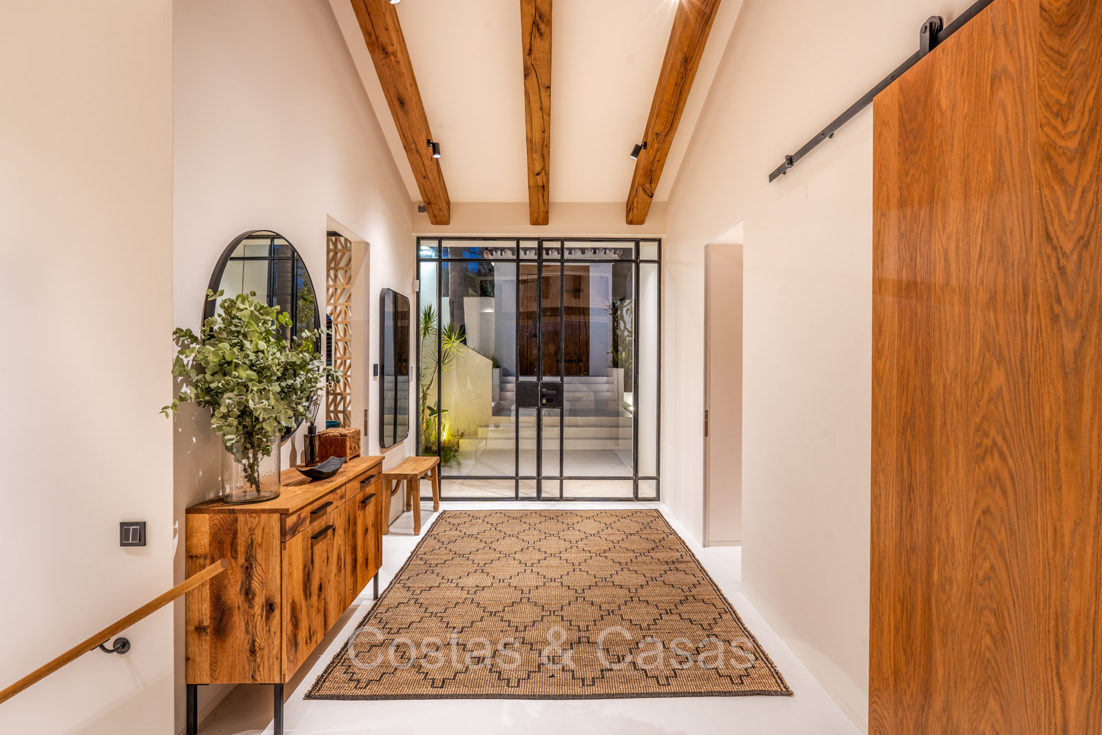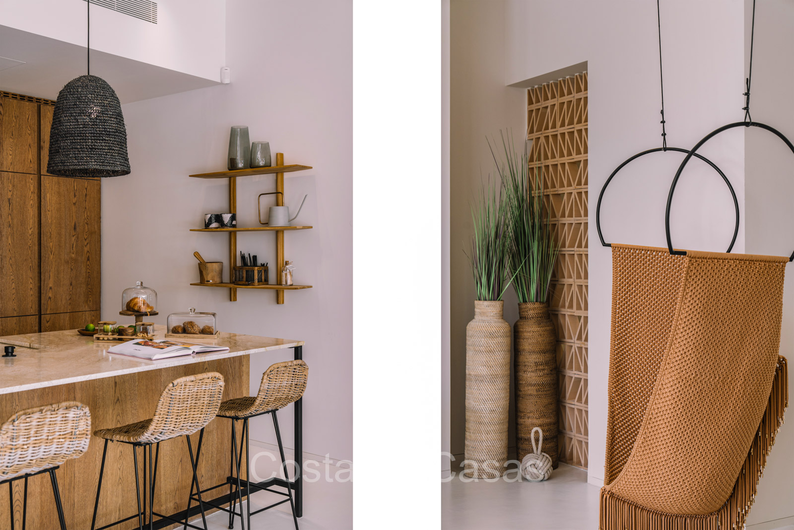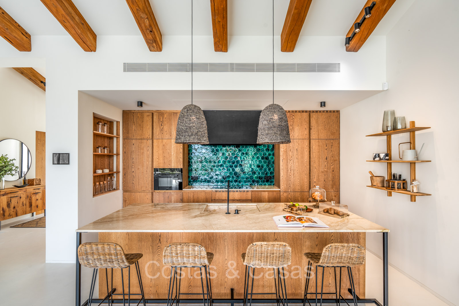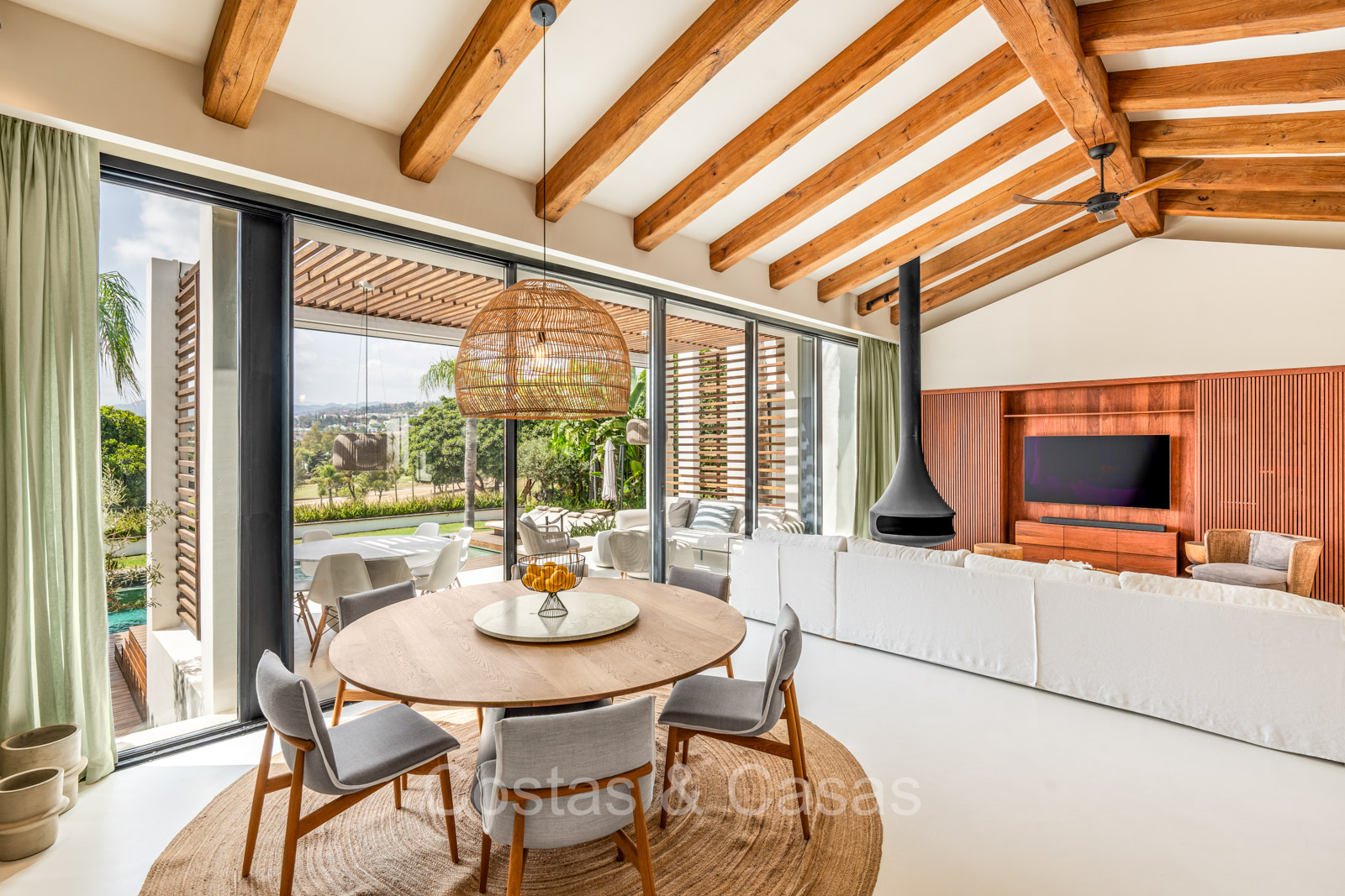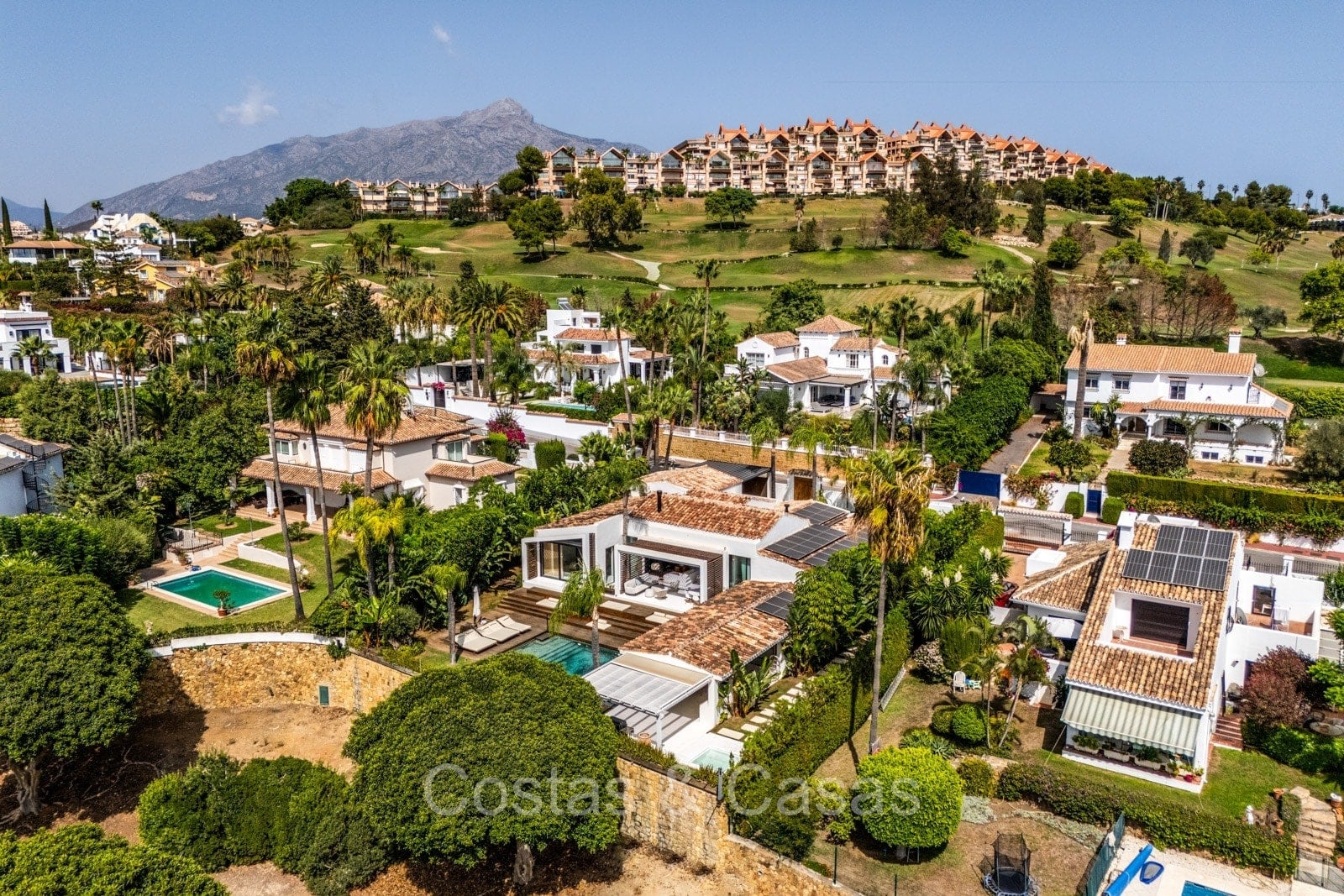 La villa individuelle dégage une combinaison unique de raffinement, d'espace et de chaleur, où l'intérieur dégage une atmosphère bohème et les espaces extérieurs forment une oasis méditerranéenne. Rénovée avec une attention à une finition supérieure. En entrant, vous êtes accueilli par un aménagement spacieux et ouvert avec de hauts plafonds et de grandes fenêtres laissant entrer beaucoup de lumière naturelle. Les poutres en bois au plafond et les tissus doux créent une ambiance accueillante et relaxante. Portes intérieures vitrées du sol au plafond. Le salon confortable comprend des éléments ludiques, notamment un hamac et une cheminée flottante. Coin repas intégré. Cuisine/salle à manger pratique, entièrement équipée avec des appareils électroménagers haut de gamme et un îlot où vous pouvez vous asseoir. 5 chambres, 6 salles de bains et une toilette séparée. La suite principale dispose d'une salle de bains spacieuse avec baignoire, douche et dressing en verre. Un sol en béton blanc poli et sans joint. Home cinéma style loft. Buanderie. Abri voiture pour 2 voitures.