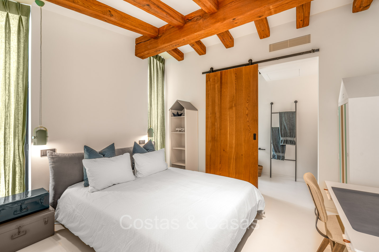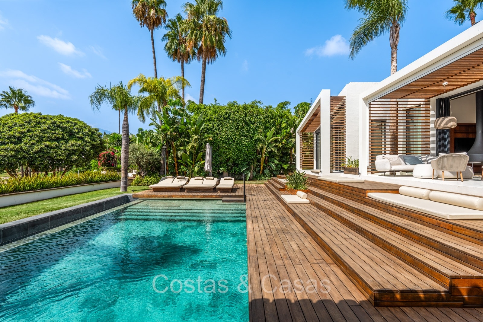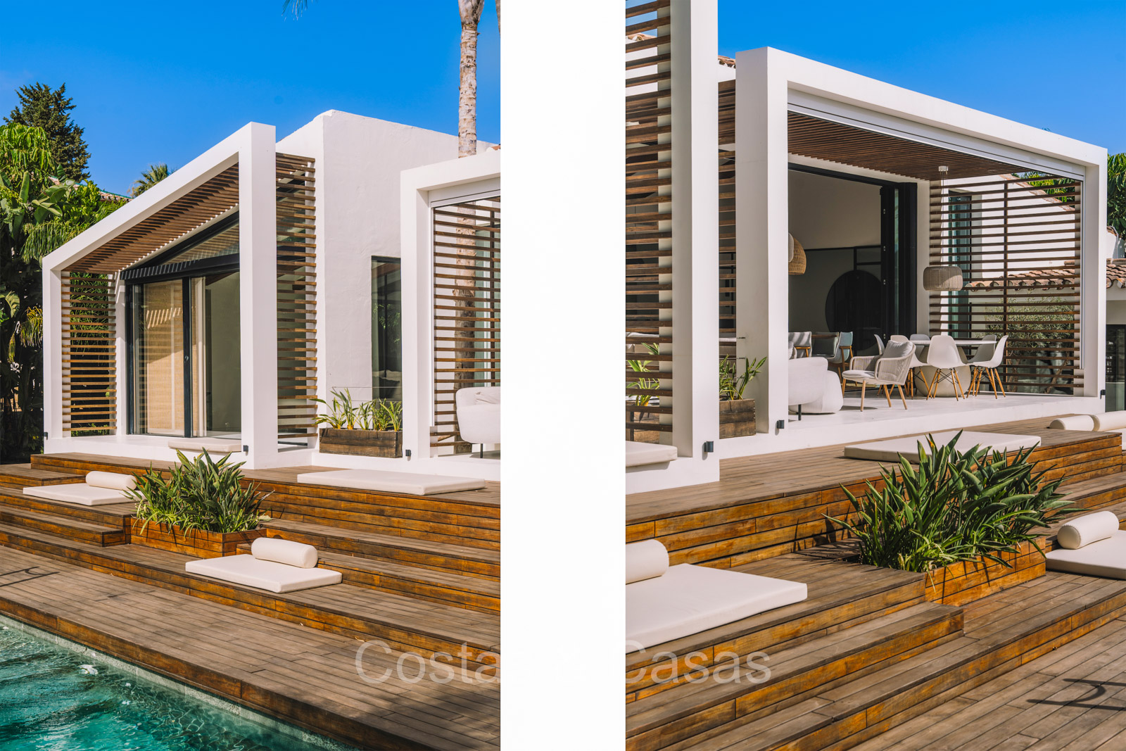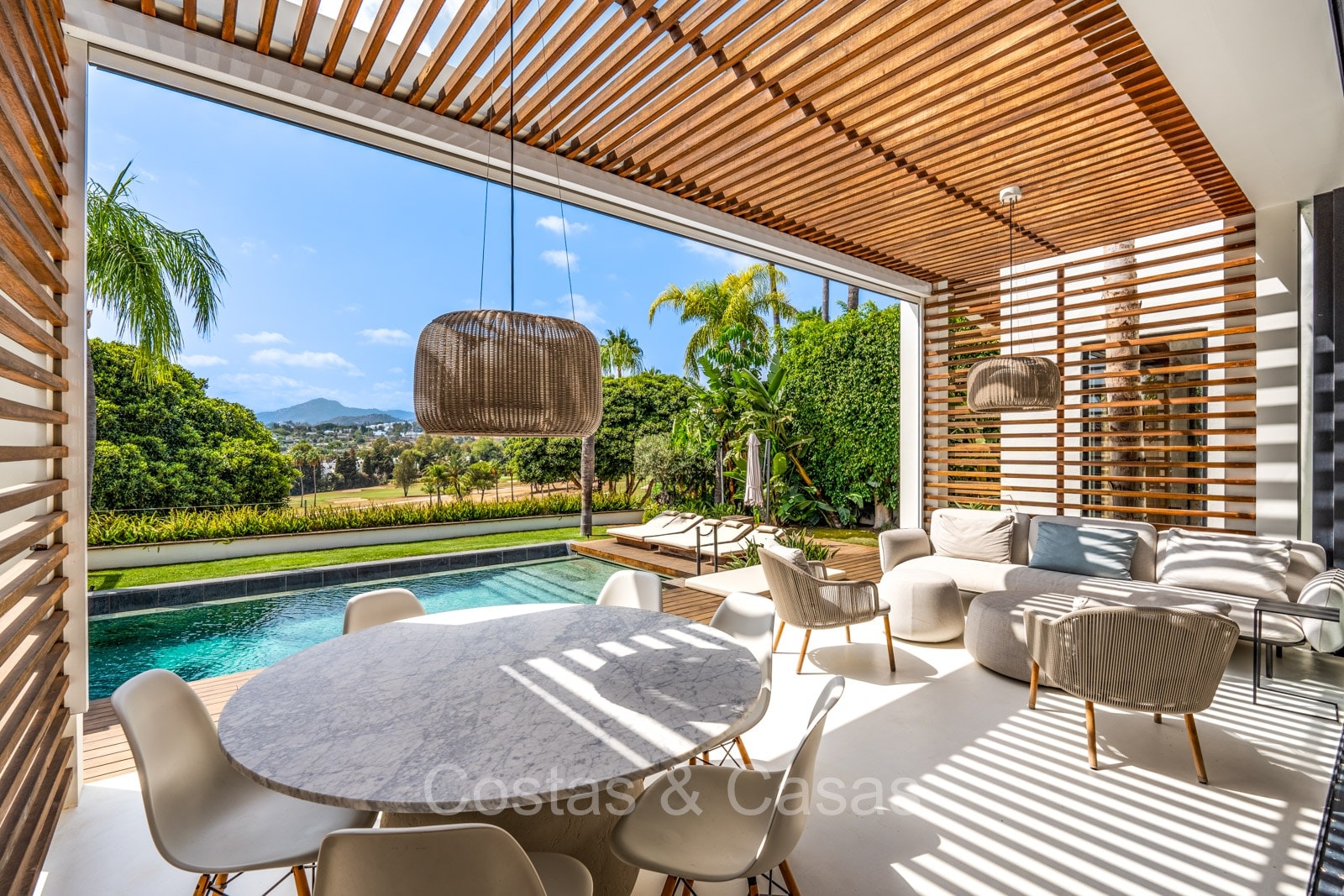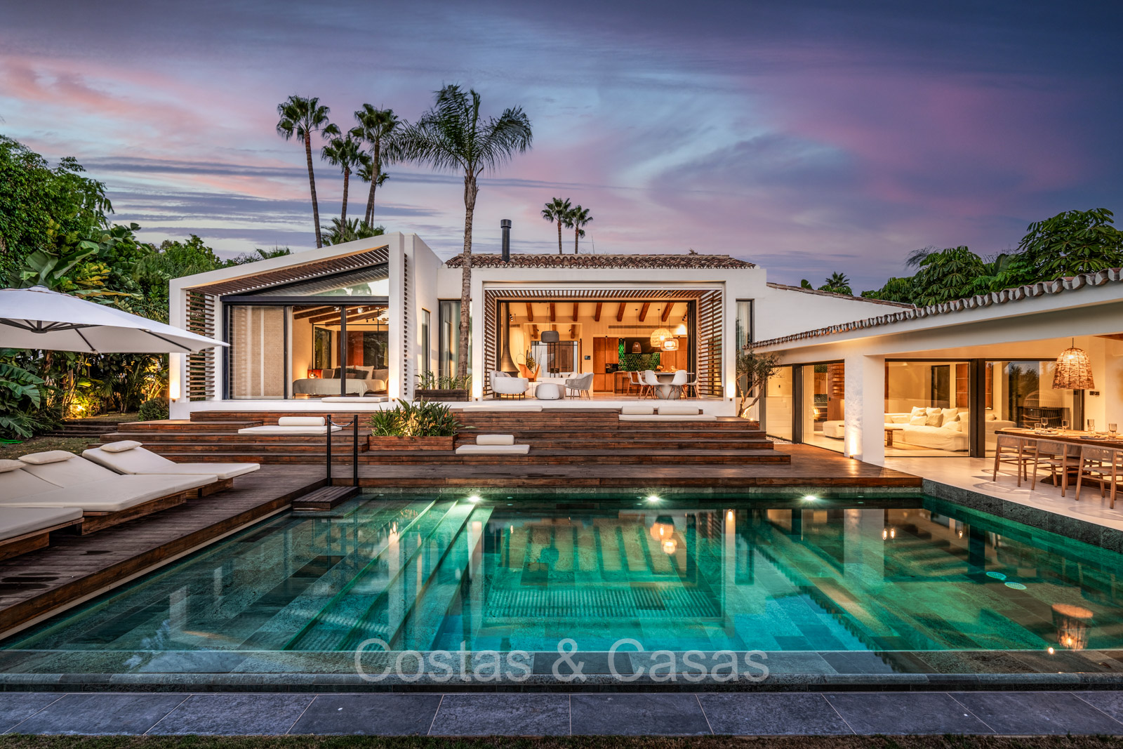 La villa individuelle dégage une combinaison unique de raffinement, d'espace et de chaleur, où l'intérieur dégage une atmosphère bohème et les espaces extérieurs forment une oasis méditerranéenne. Rénovée avec une attention à une finition supérieure. En entrant, vous êtes accueilli par un aménagement spacieux et ouvert avec de hauts plafonds et de grandes fenêtres laissant entrer beaucoup de lumière naturelle. Les poutres en bois au plafond et les tissus doux créent une ambiance accueillante et relaxante. Portes intérieures vitrées du sol au plafond. Le salon confortable comprend des éléments ludiques, notamment un hamac et une cheminée flottante. Coin repas intégré. Cuisine/salle à manger pratique, entièrement équipée avec des appareils électroménagers haut de gamme et un îlot où vous pouvez vous asseoir. 5 chambres, 6 salles de bains et une toilette séparée. La suite principale dispose d'une salle de bains spacieuse avec baignoire, douche et dressing en verre. Un sol en béton blanc poli et sans joint. Home cinéma style loft. Buanderie. Abri voiture pour 2 voitures.