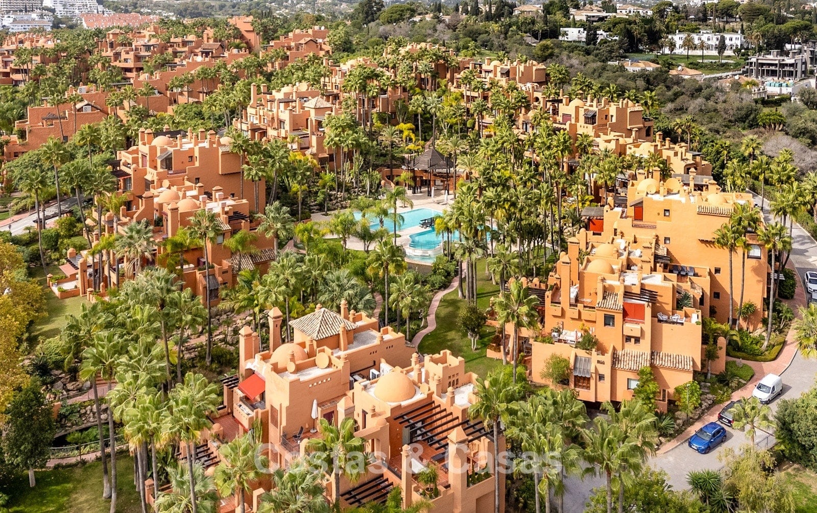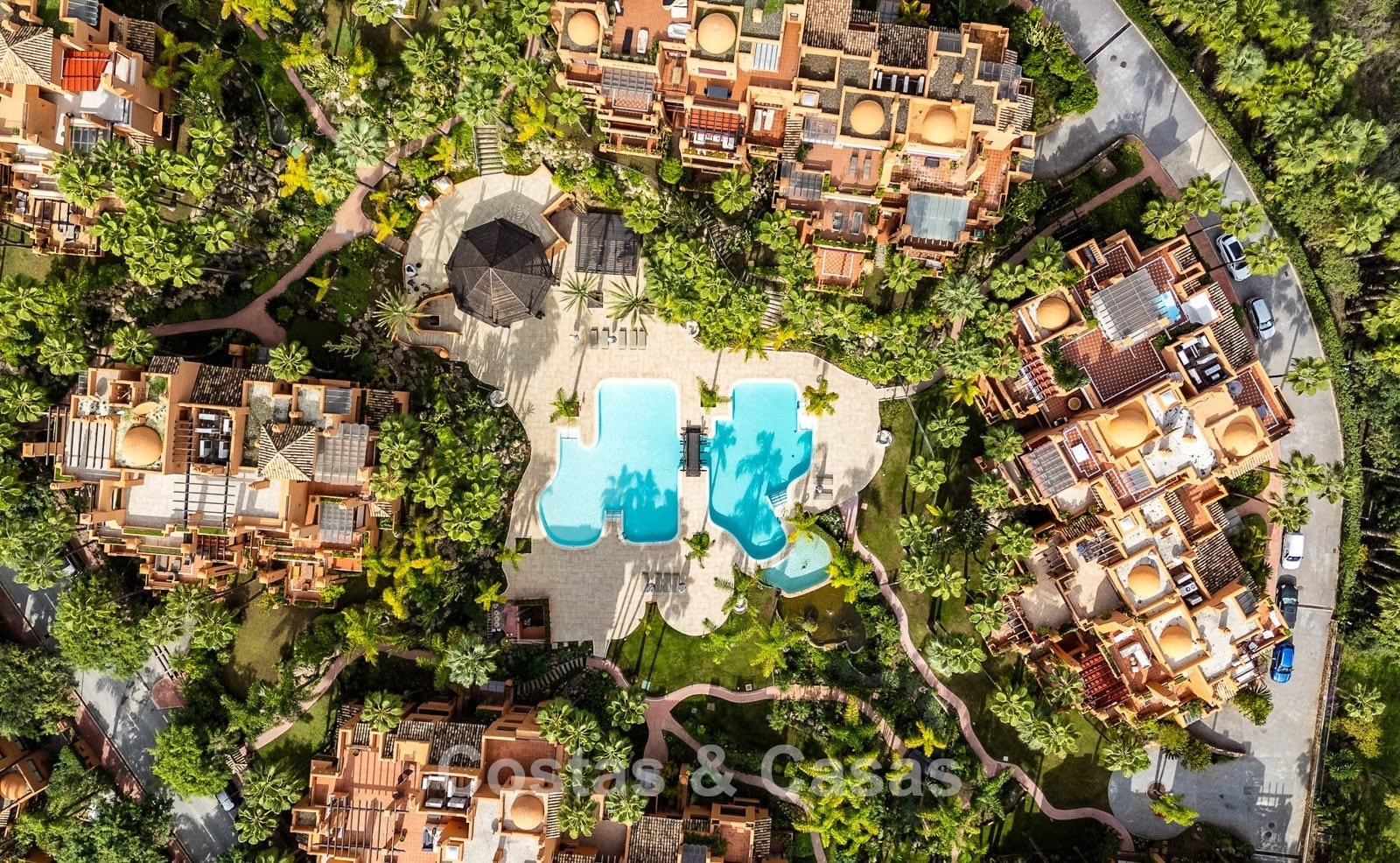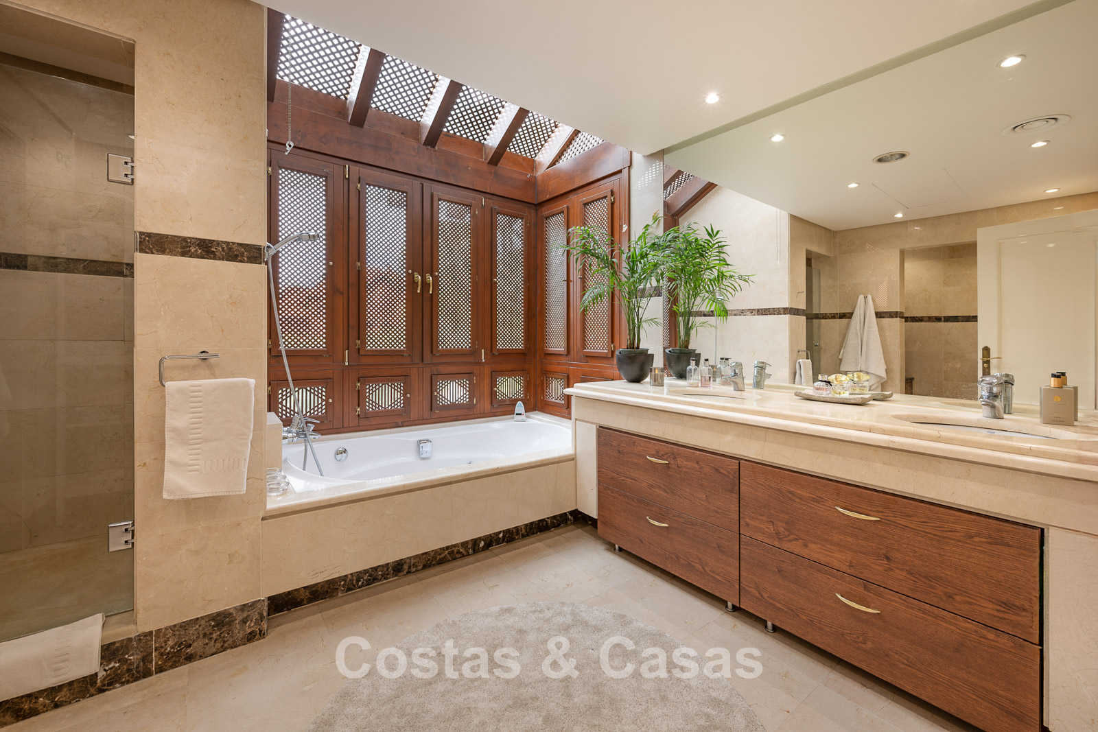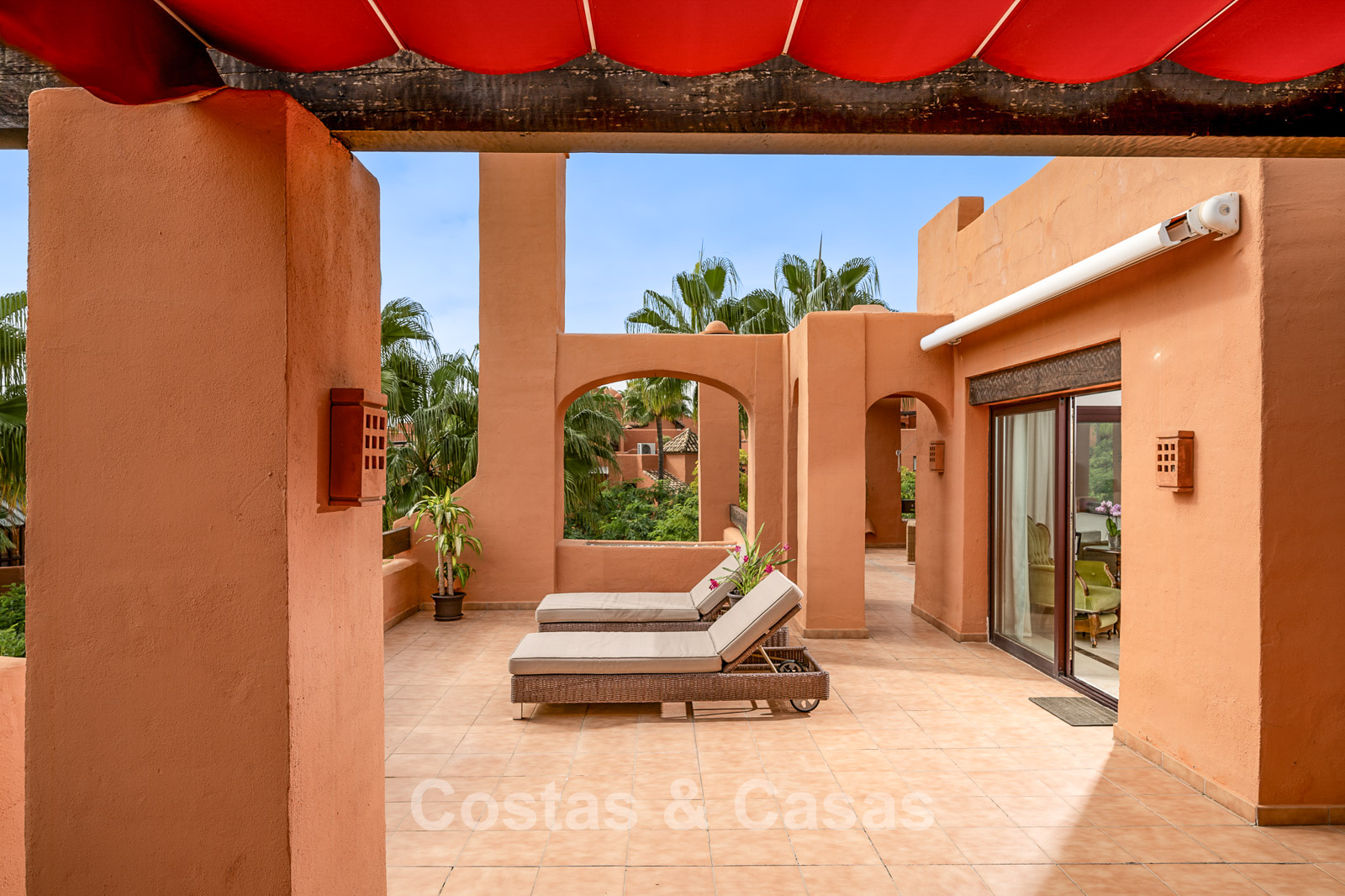 Spacieux penthouse en duplex dans un complexe réputé pour son architecture raffinée aux influences mauresques et andalouses. Le mélange unique d'éléments arabes et du sud de l'Espagne s'exprime magnifiquement dans les arches, les colonnes gracieuses, les couleurs terre cuite et les tons chauds de la terre. Des matériaux de haute qualité sont utilisés avec un souci du détail méticuleux. Plusieurs équipements ont été récemment modernisés ou remplacés. De spacieuses terrasses offrent des espaces ensoleillés et ombragés, parfaits pour un style de vie décontracté, avec des espaces salon, des chaises longues et un coin repas extérieur convivial. Orientation sud. Vue sur la mer Méditerranée. De grandes baies vitrées coulissantes avec cadres encastrés dans l'appartement offrent une lumière naturelle abondante. Séjour lumineux avec un coin TV confortable et un coin repas intégré. Cuisine séparée entièrement équipée avec appareils électroménagers haut de gamme et bar. 3 chambres, 3 salles de bains et une toilette séparée. L'étage supérieur a été conçu comme une luxueuse suite parentale, avec de superbes hauts plafonds, de nombreux rangements et une élégante salle de bains attenante avec baignoire et douche séparée. Sols en marbre couleur crème. Buanderie fonctionnelle équipée d'un lave-linge et d'un sèche-linge. Débarras d'environ 40 m², idéalement située à côté de l'ascenseur. Garage intégré pour deux voitures avec borne de recharge pour voitures électriques.