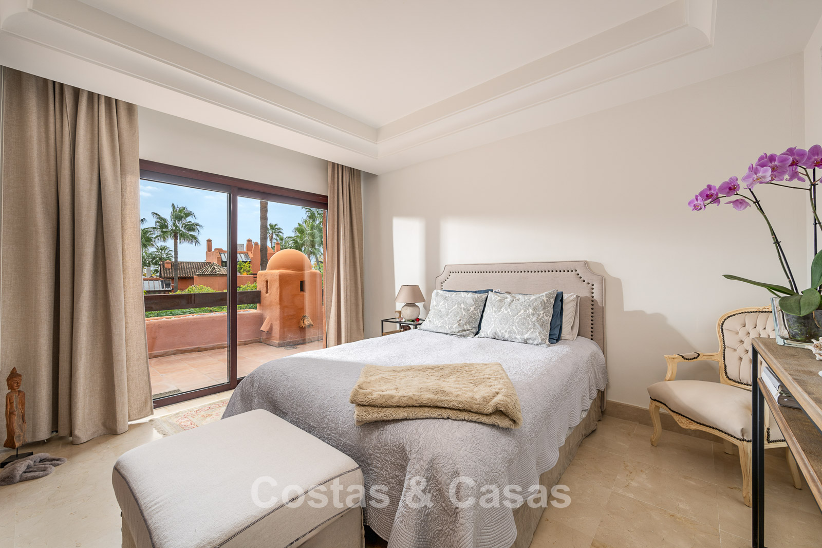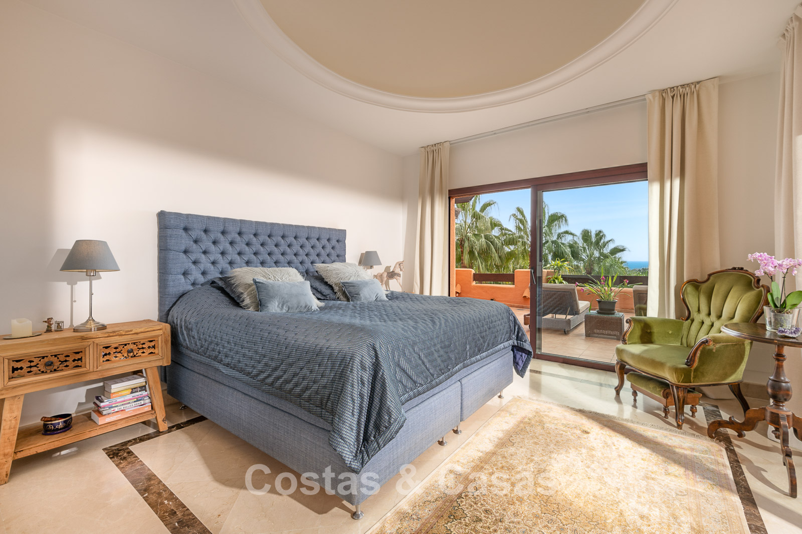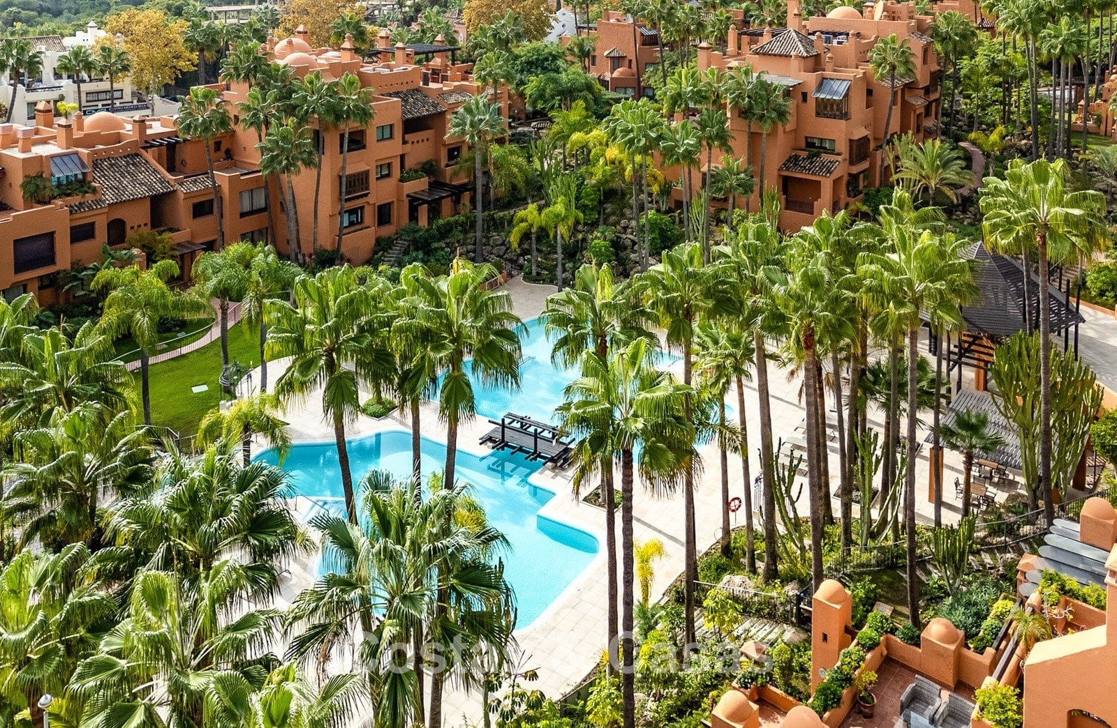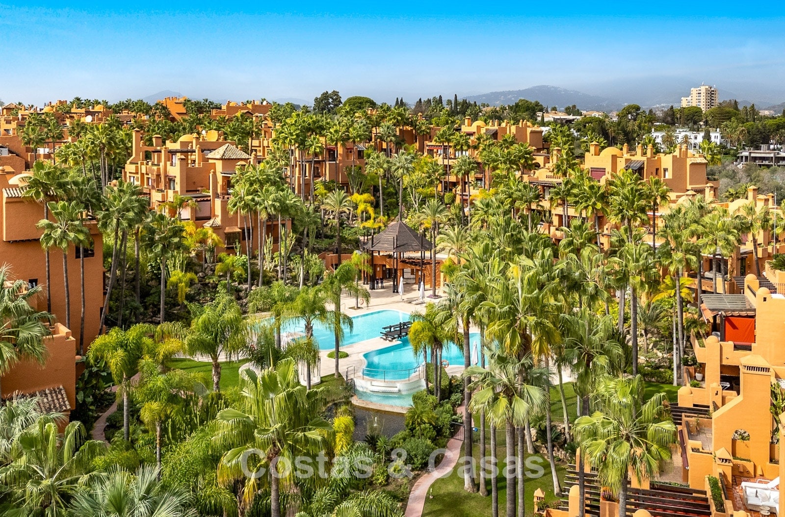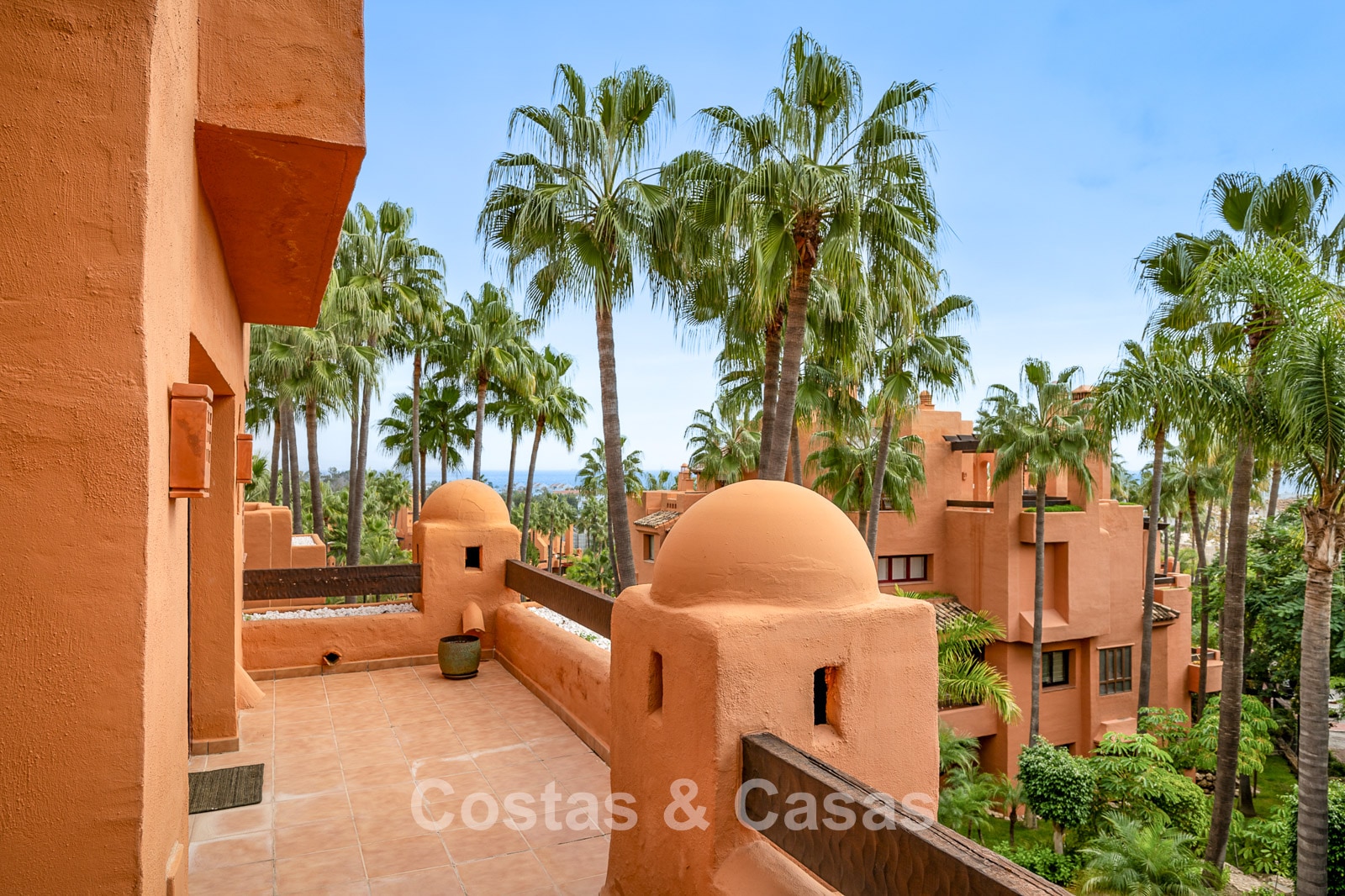 Spacieux penthouse en duplex dans un complexe réputé pour son architecture raffinée aux influences mauresques et andalouses. Le mélange unique d'éléments arabes et du sud de l'Espagne s'exprime magnifiquement dans les arches, les colonnes gracieuses, les couleurs terre cuite et les tons chauds de la terre. Des matériaux de haute qualité sont utilisés avec un souci du détail méticuleux. Plusieurs équipements ont été récemment modernisés ou remplacés. De spacieuses terrasses offrent des espaces ensoleillés et ombragés, parfaits pour un style de vie décontracté, avec des espaces salon, des chaises longues et un coin repas extérieur convivial. Orientation sud. Vue sur la mer Méditerranée. De grandes baies vitrées coulissantes avec cadres encastrés dans l'appartement offrent une lumière naturelle abondante. Séjour lumineux avec un coin TV confortable et un coin repas intégré. Cuisine séparée entièrement équipée avec appareils électroménagers haut de gamme et bar. 3 chambres, 3 salles de bains et une toilette séparée. L'étage supérieur a été conçu comme une luxueuse suite parentale, avec de superbes hauts plafonds, de nombreux rangements et une élégante salle de bains attenante avec baignoire et douche séparée. Sols en marbre couleur crème. Buanderie fonctionnelle équipée d'un lave-linge et d'un sèche-linge. Débarras d'environ 40 m², idéalement située à côté de l'ascenseur. Garage intégré pour deux voitures avec borne de recharge pour voitures électriques.