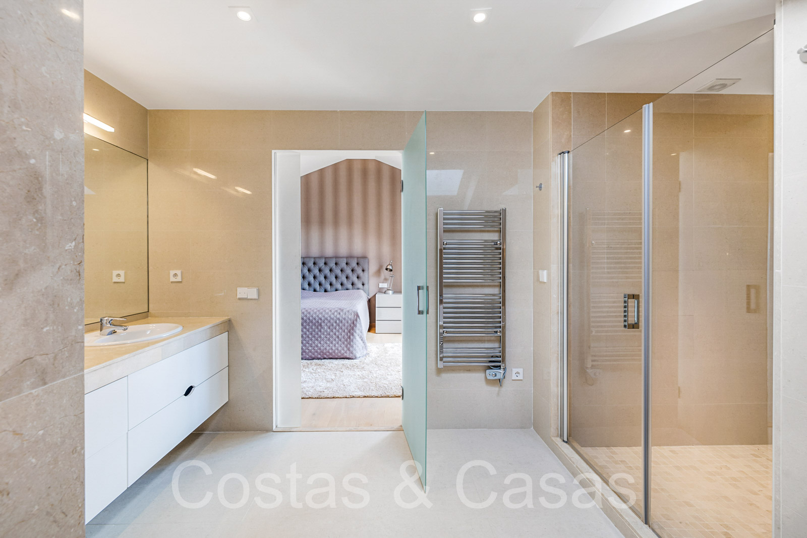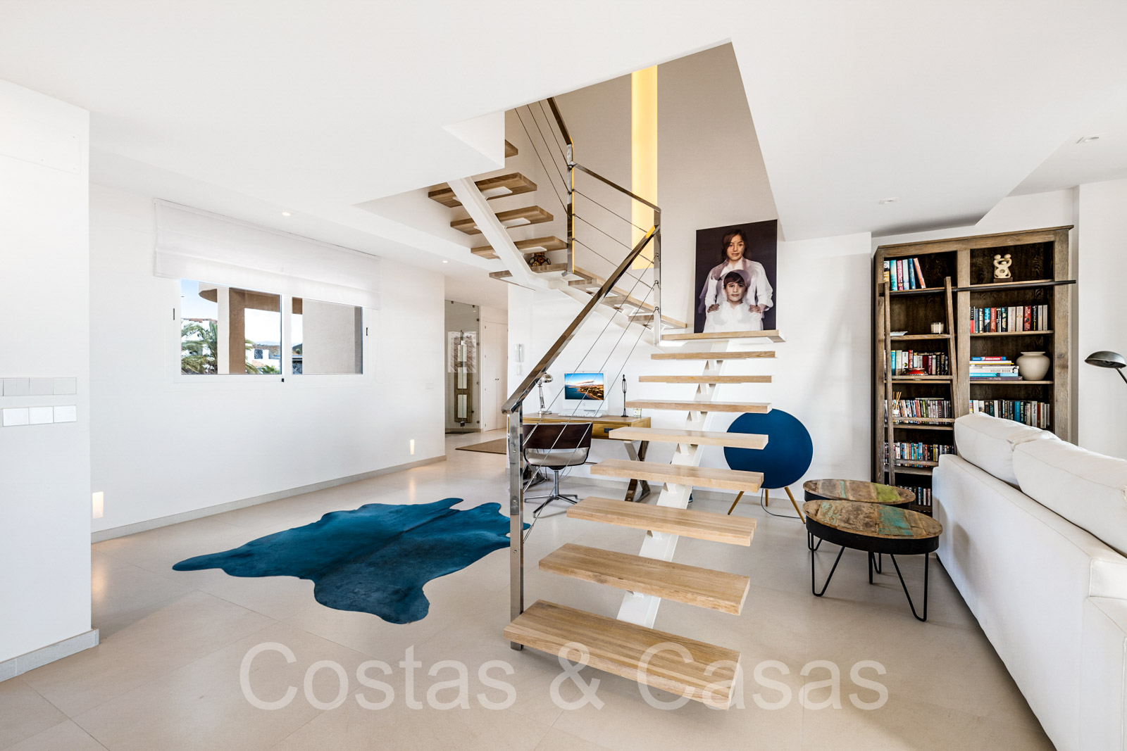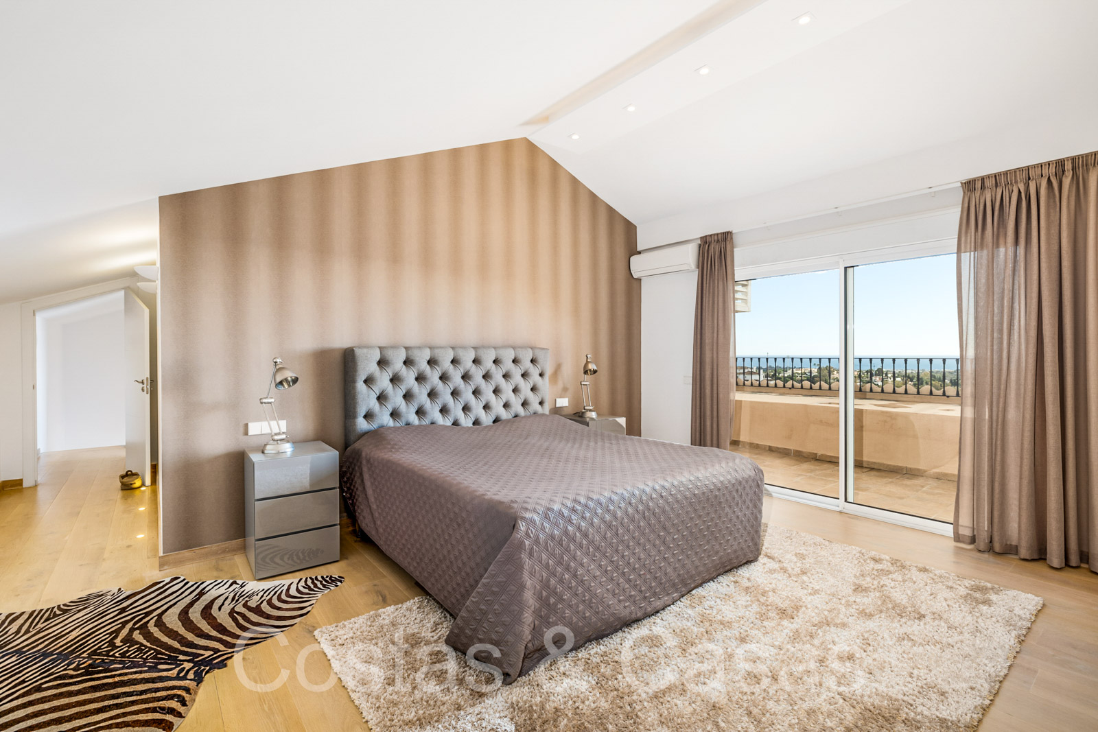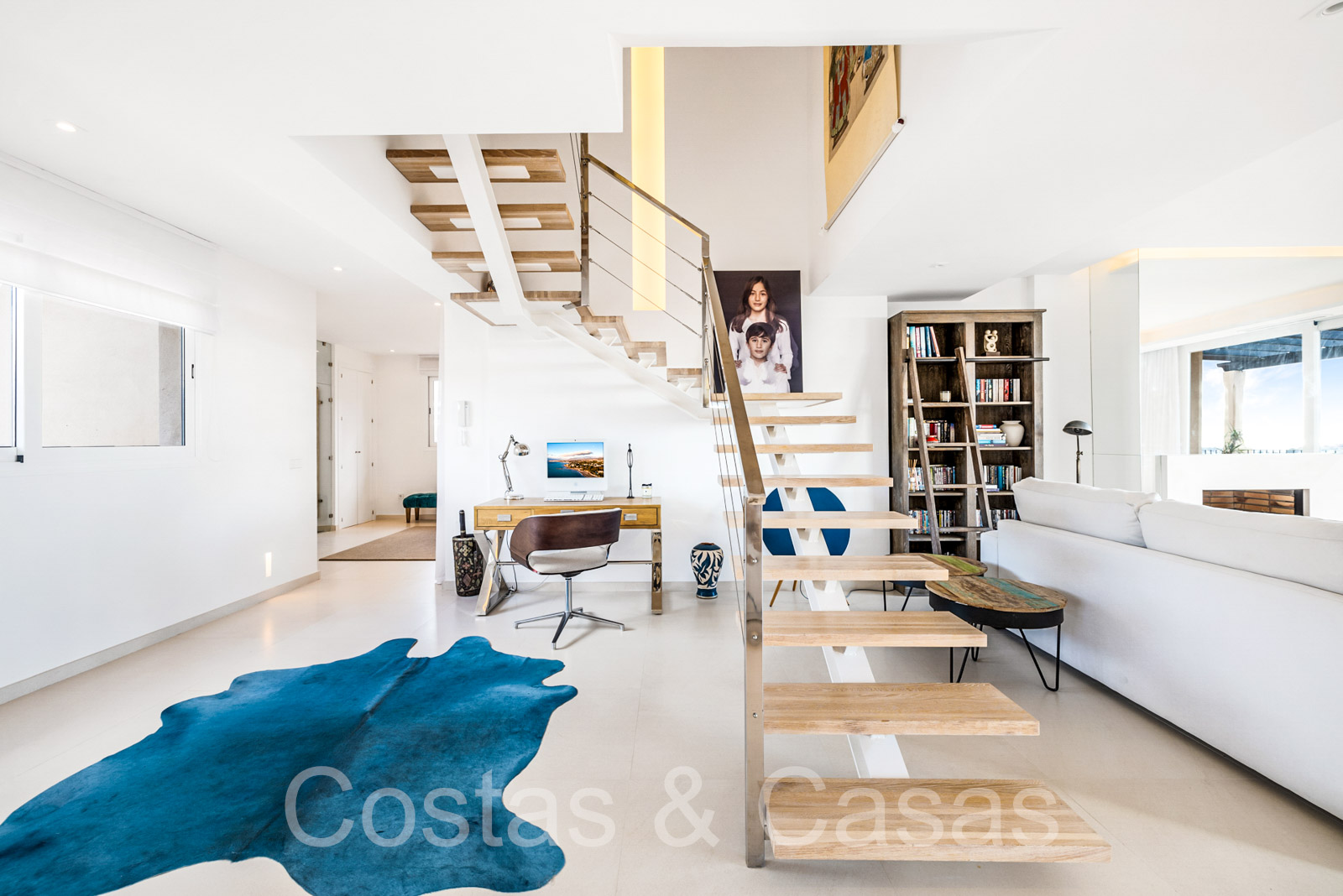 Spacieux penthouse en duplex composé de 2 unités résidentielles séparées. Orienté vers le sud-ouest. Vue panoramique vers la mer Méditerranée. Un ascenseur privé s'ouvre directement sur le penthouse. Terrasse ouverte et couverte où vous pourrez profiter de l'agréable climat méditerranéen toute l'année. Intérieur lumineux et aéré avec un agencement ouvert. Grand espace de vie ouvert avec un salon et un coin repas intégré. Cuisine entièrement équipée avec des appareils électroménagers haut de gamme et un bar pour le petit-déjeuner. 4 chambres, 4 salles de bains. 2 suites parentales à l'étage, chacune avec salle de bain privative, dressing et accès à la terrasse. Les hautes fenêtres coulissantes génèrent beaucoup de lumière naturelle et permettent d'accéder à l'espace extérieur. Sols en carrelage grand format de couleur crème. Buanderie. 2 places de parking privées incluses.