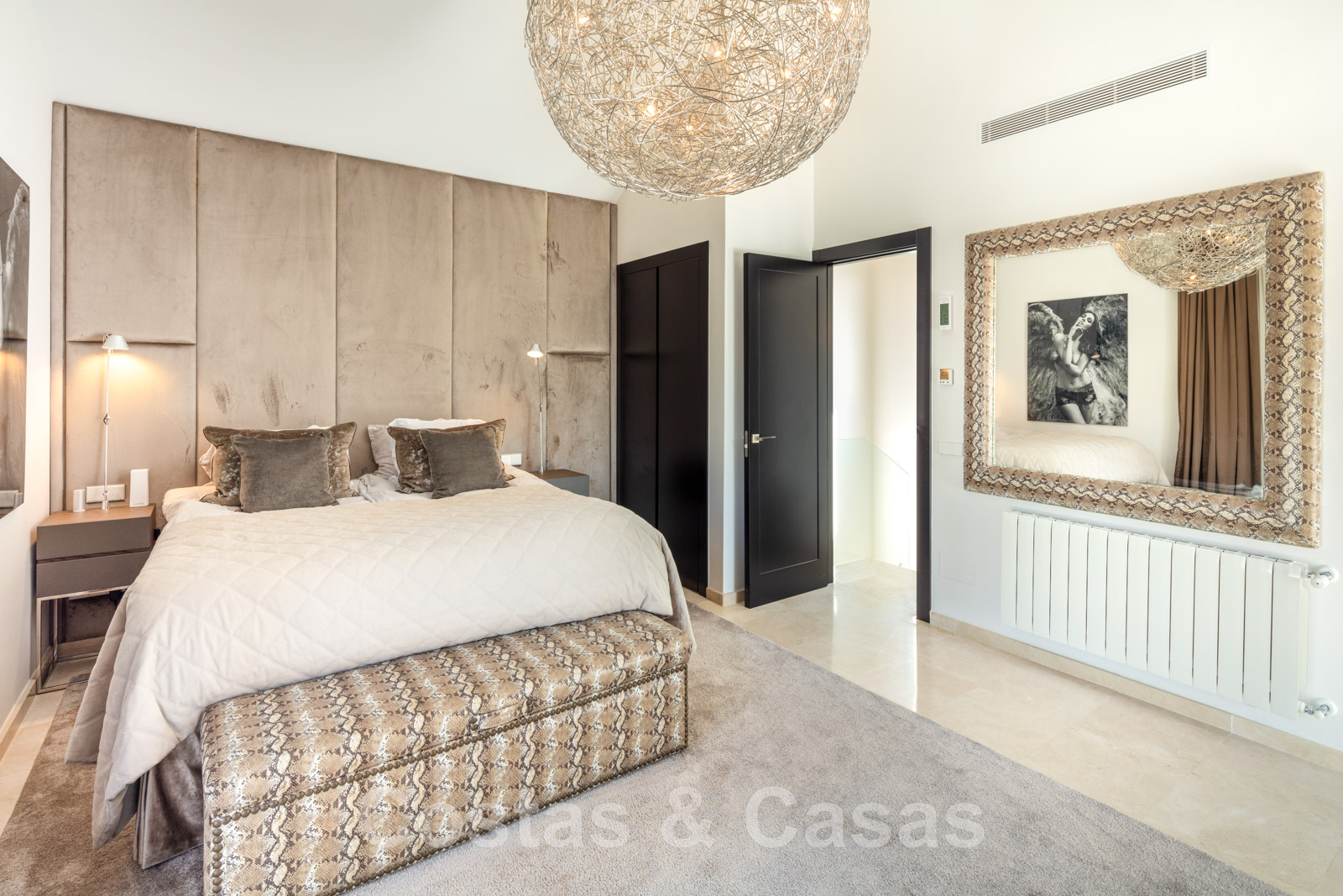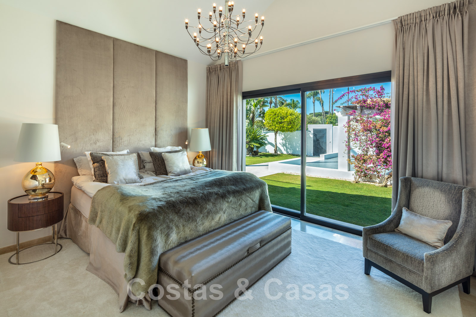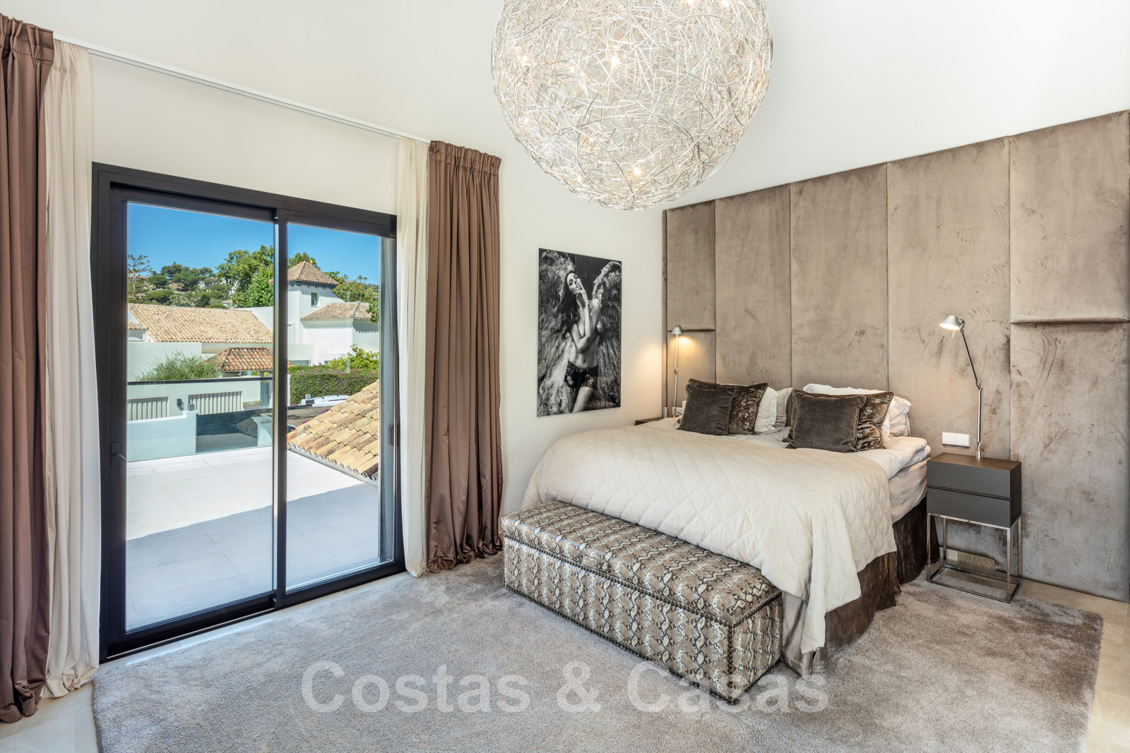Élégante chambre principale avec accès à la terrasse privée.