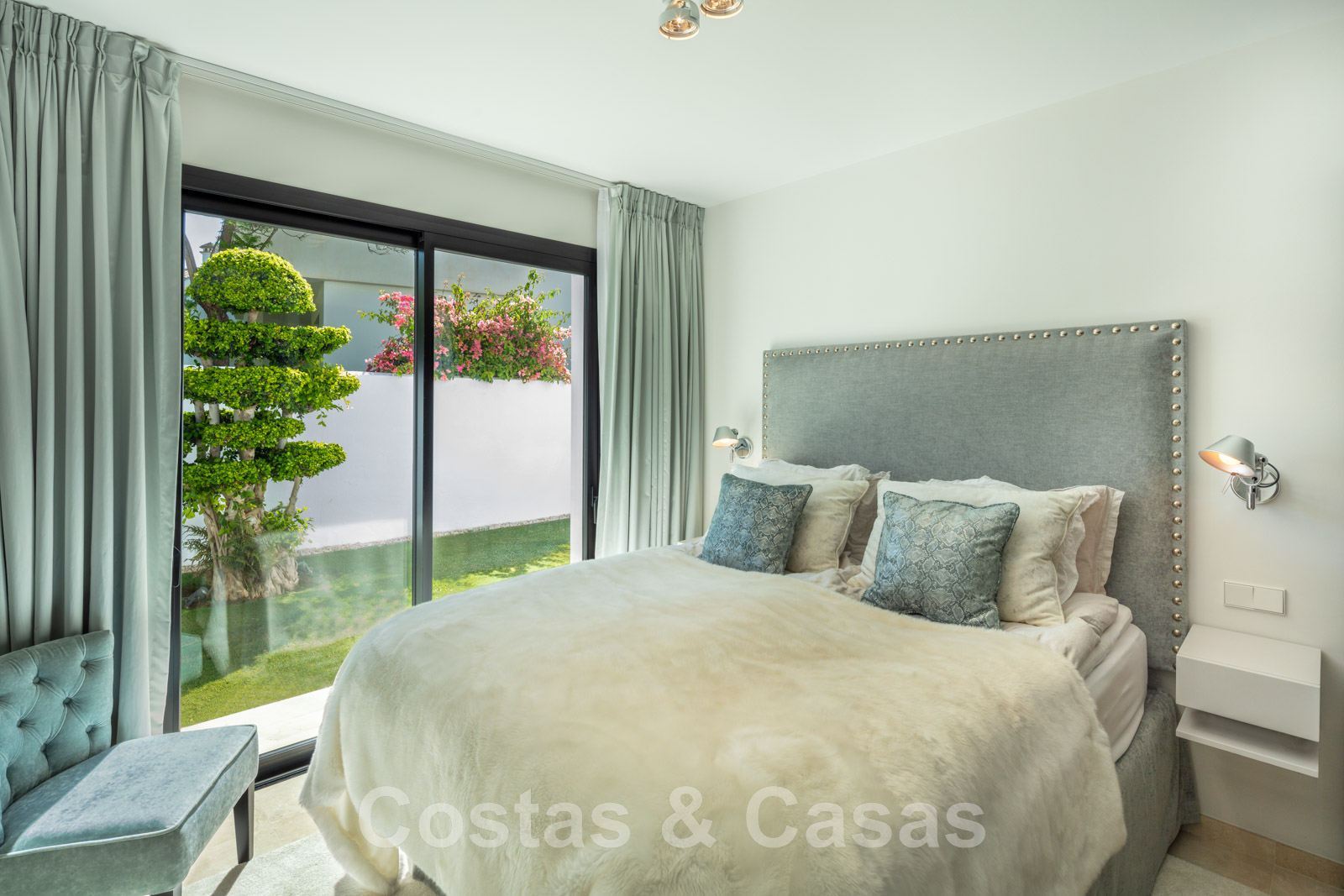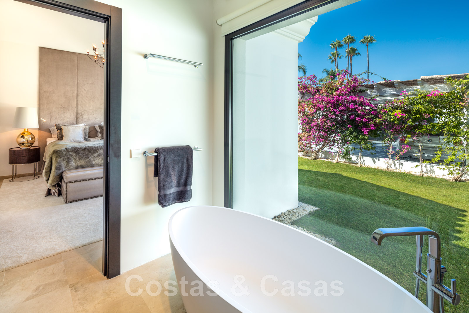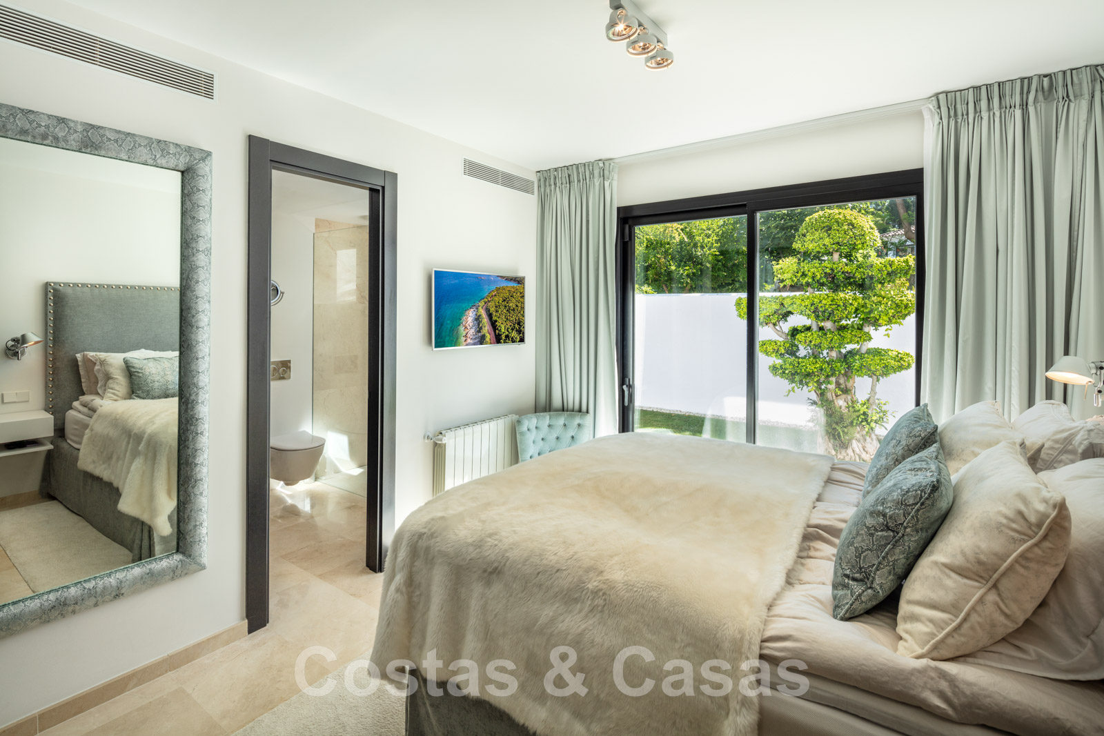 Élégante chambre principale avec accès à la terrasse privée.