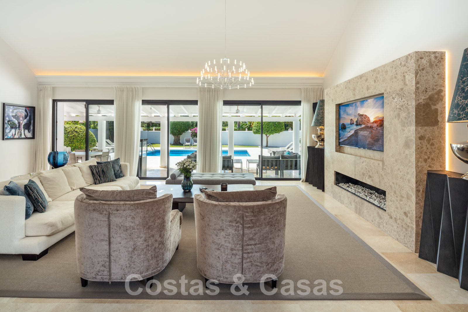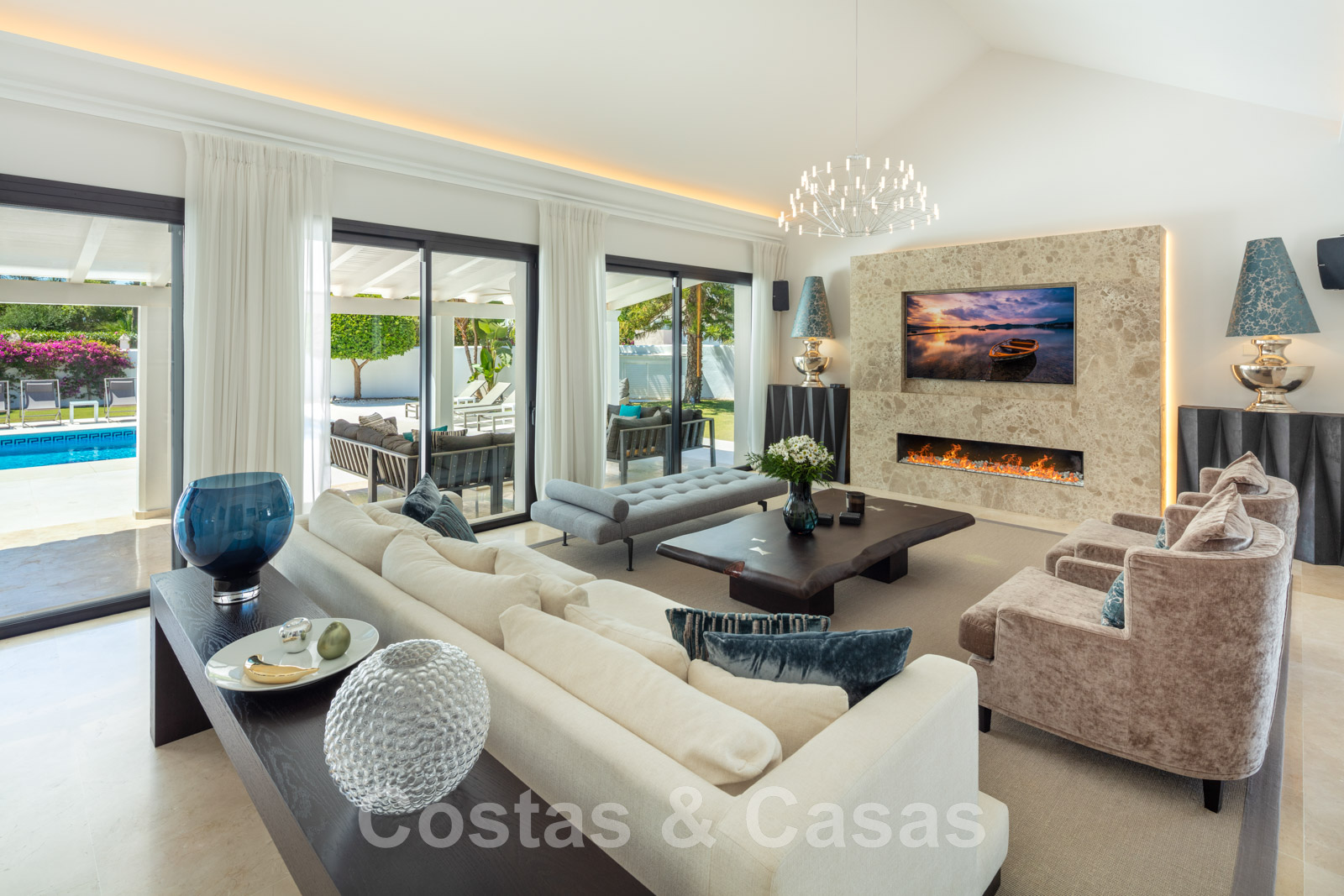 Salle de séjour à haut plafond avec salon TV décoré d'une cheminée moderne.