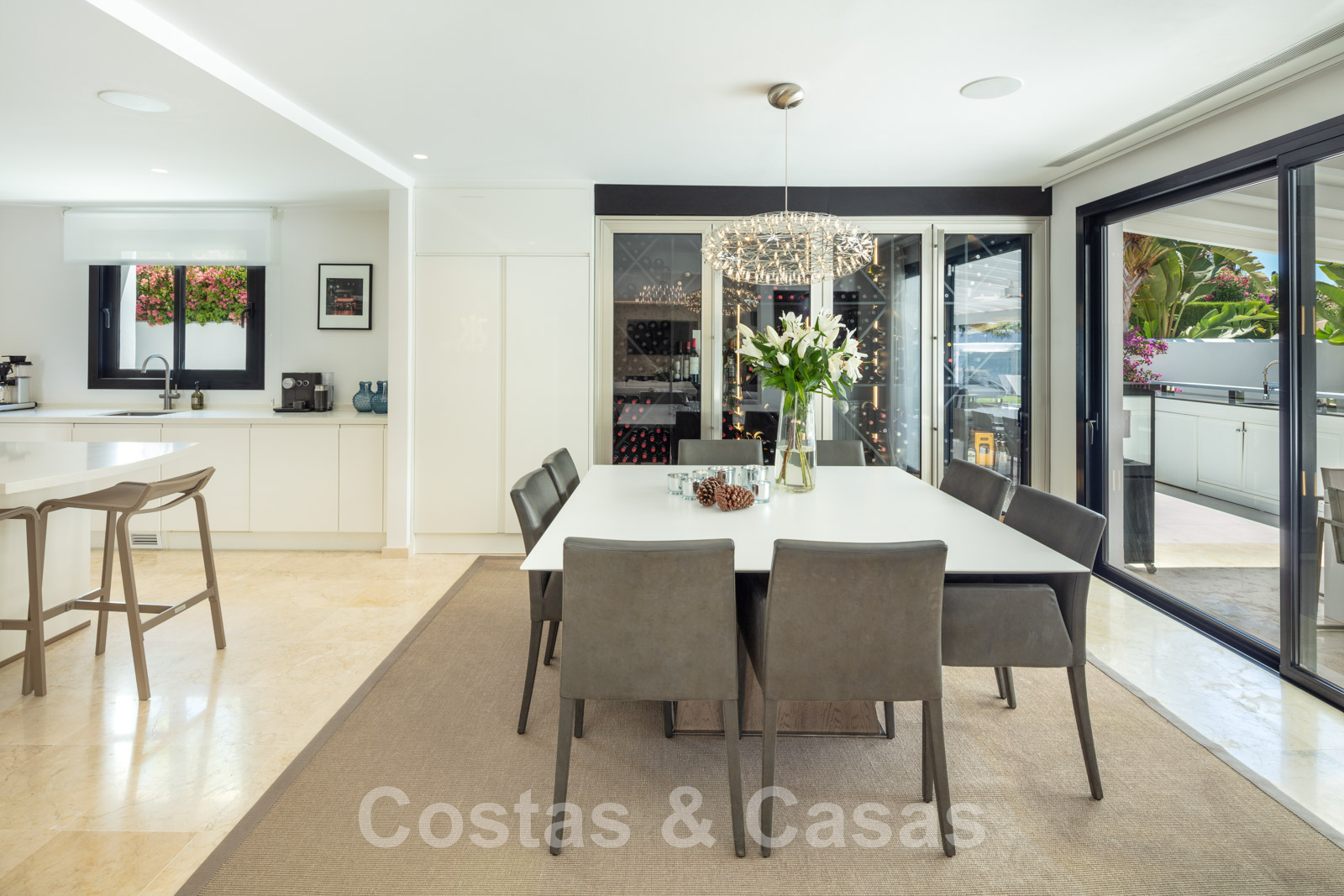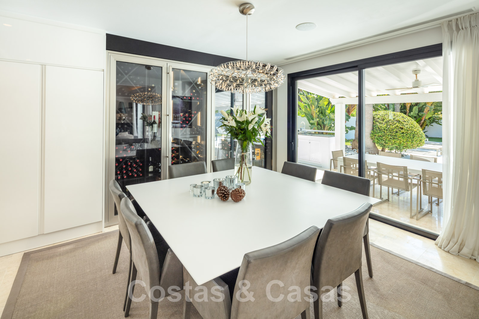 Adjacent à la salle à manger avec un grand refroidisseur de vin.