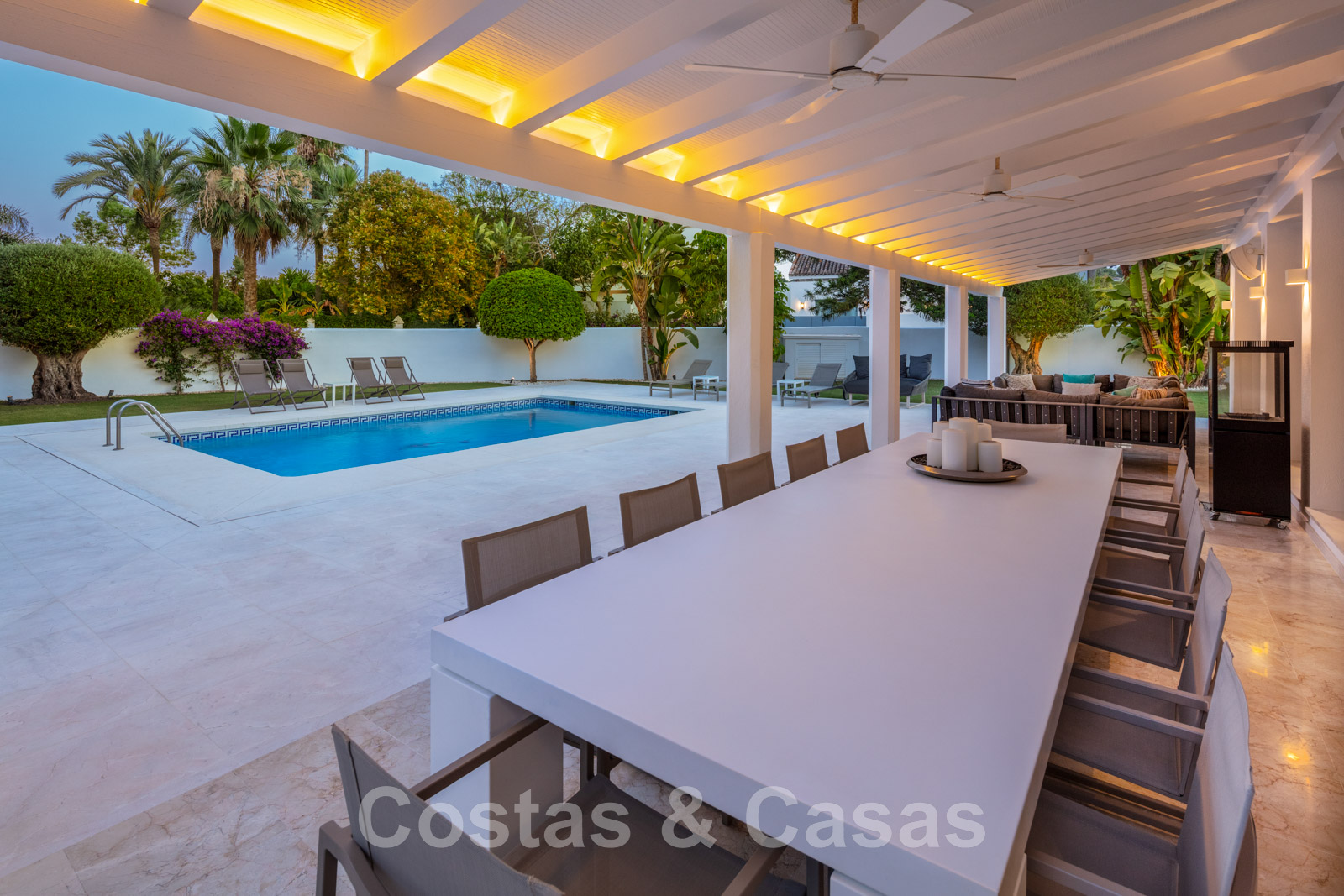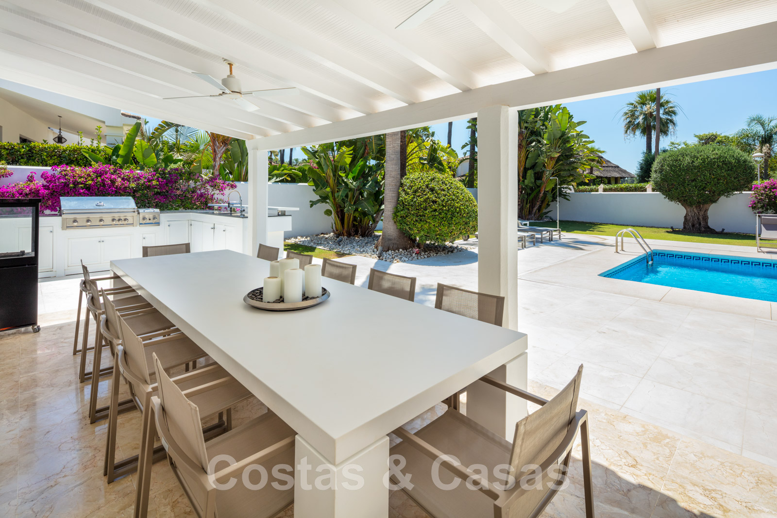 Au rez-de-chaussée, une grande terrasse couverte avec un chillout et une table à manger pour 12 personnes.