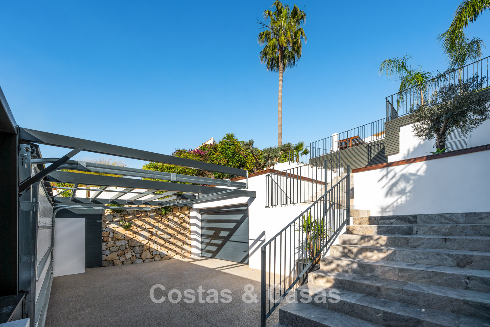 Cette villa impressionnante a été récemment entièrement rénovée avec une vision architecturale claire et une attention minutieuse aux détails. La propriété est répartie sur deux niveaux de vie soigneusement conçus, avec un agencement logique et naturel. Seuls des matériaux haut de gamme ont été utilisés, notamment le chêne, l’ébénisterie en noyer et le marbre à veines sombres. L’intérieur dégage un luxe moderne, caractérisé par une abondance de lumière naturelle et une atmosphère sereine. De grandes portes coulissantes en verre assurent une connexion ininterrompue entre les espaces de vie et les terrasses. Le spacieux salon dispose de finitions sur mesure raffinées et s’ouvre parfaitement sur la salle à manger. La cuisine ouverte est un chef-d’œuvre en soi, entièrement équipée avec des appareils haut de gamme et un élégant îlot central. La villa dispose de quatre chambres spacieuses et de quatre salles de bains luxueuses, la suite principale offrant une vue spectaculaire. Les sols sont finis avec un parquet en chevrons magnifiquement posé et de la pierre naturelle dans les zones humides. Le rez-de-chaussée comprend un second salon et une cave à vin sur mesure. Une buanderie séparée et des espaces de rangement supplémentaires offrent un confort optimal. La propriété dispose d’un garage privé pour un véhicule et d’un parking supplémentaire sur le terrain (3 places au total).