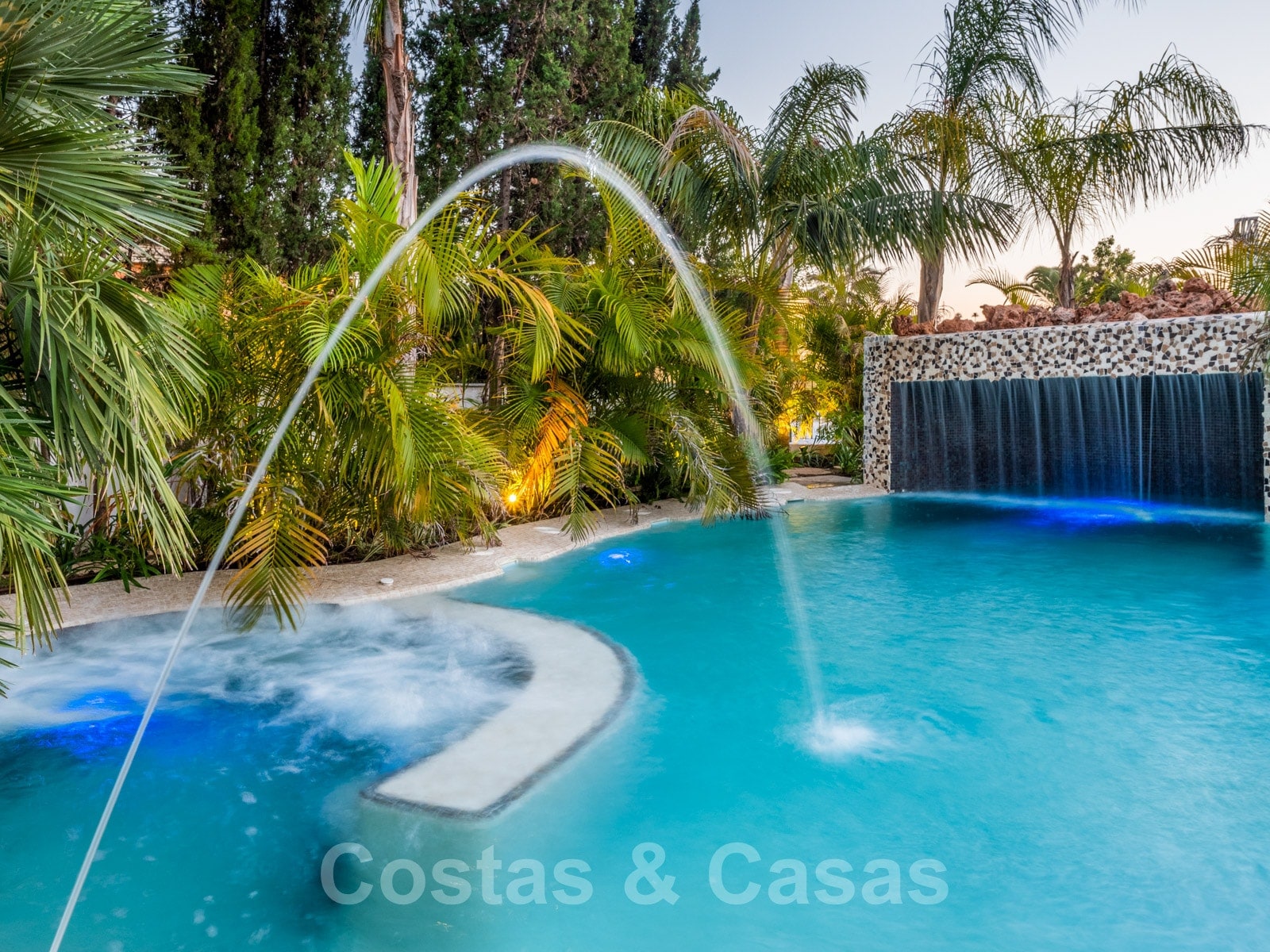Piscine "lagon" unique, avec éclairage intégré, jacuzzi, cascade et fontaines.