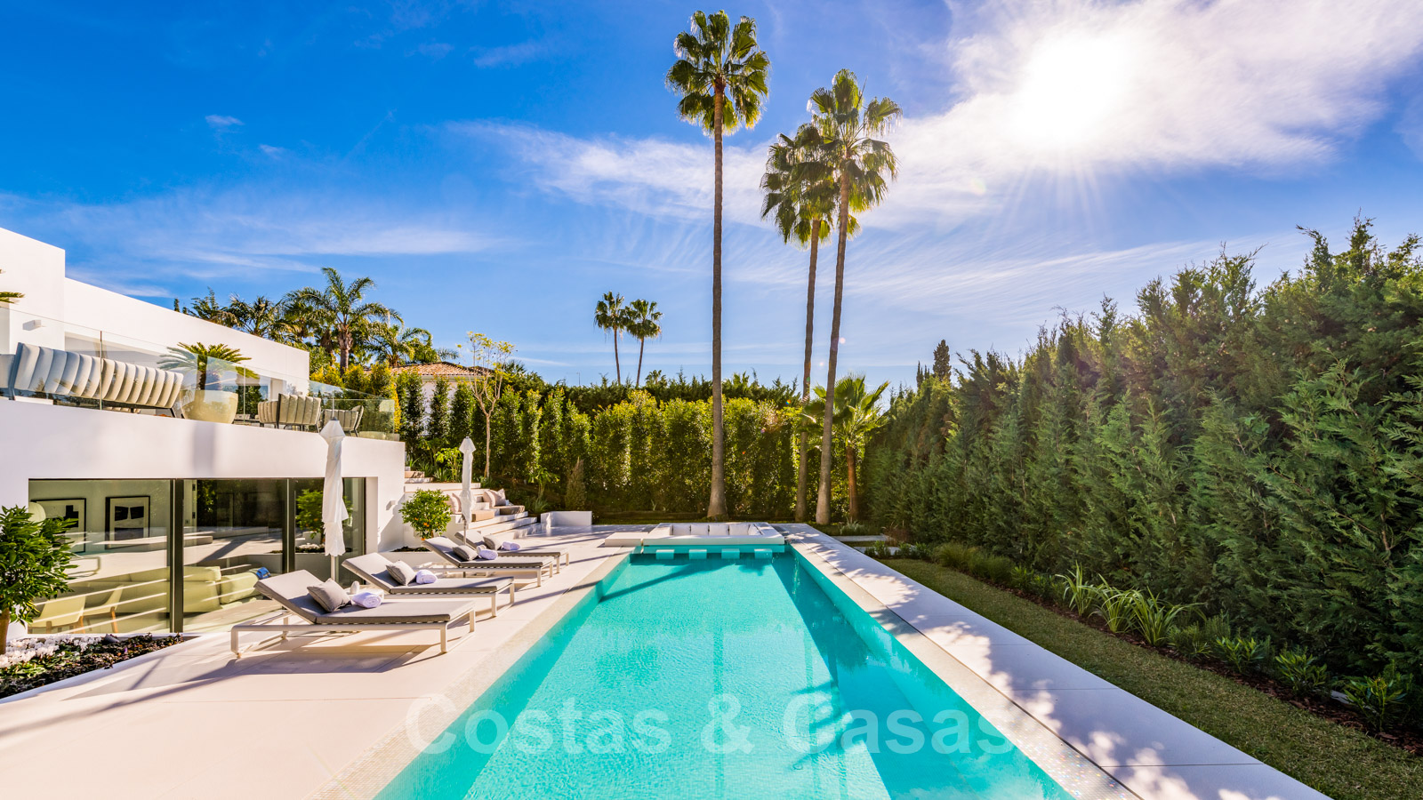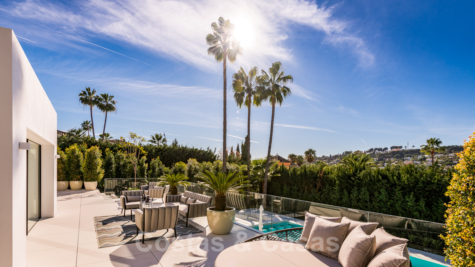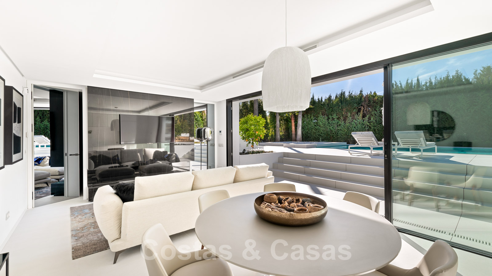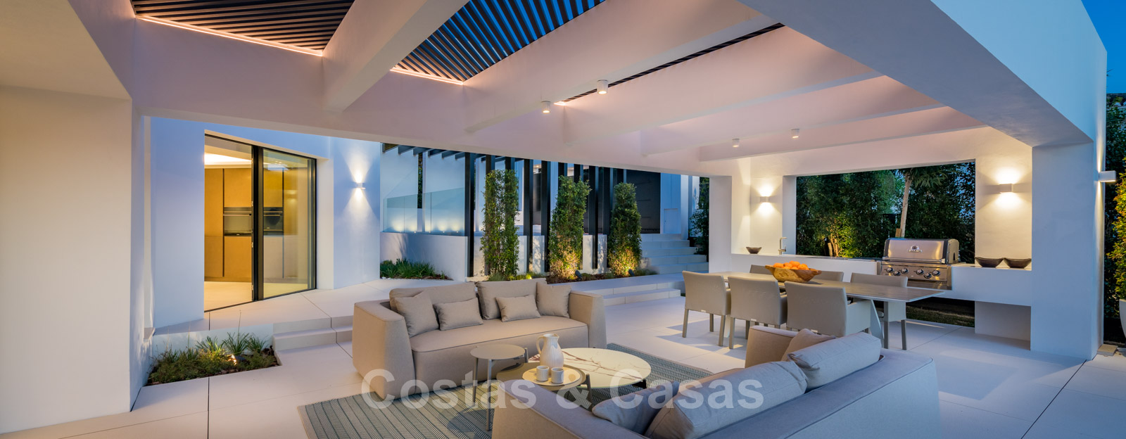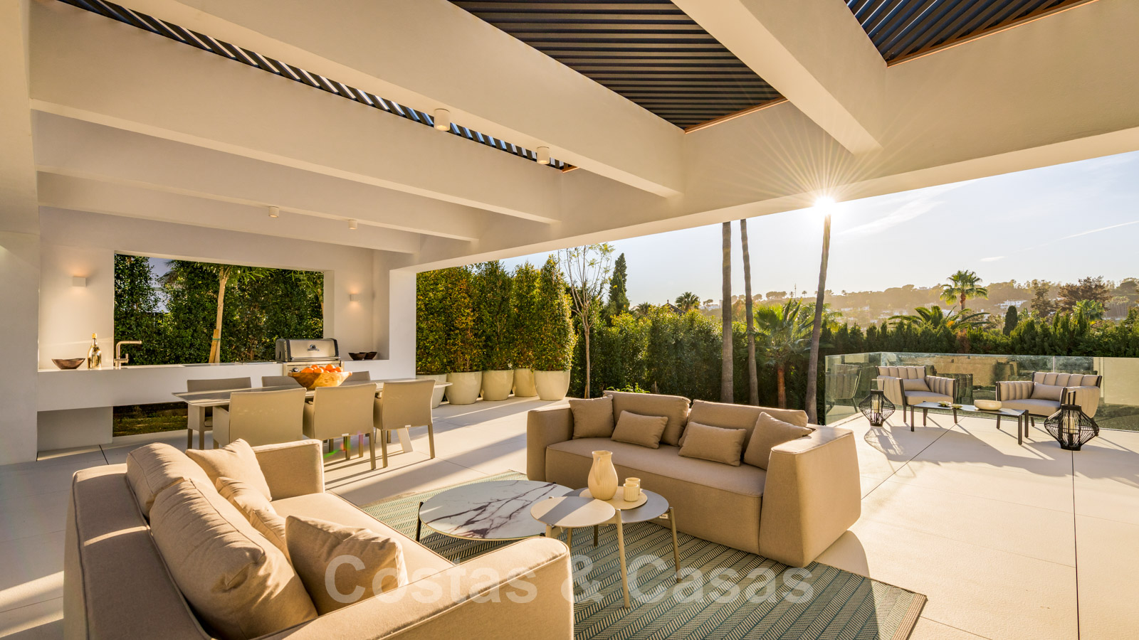 La vie à l'intérieur et à l'extérieur est mise en valeur. Il y a de grandes terrasses ouvertes et couvertes, y compris un coin chill-out, une cuisine extérieure et une salle à manger. Un coin salon supplémentaire est attenant à la magnifique piscine à débordement.