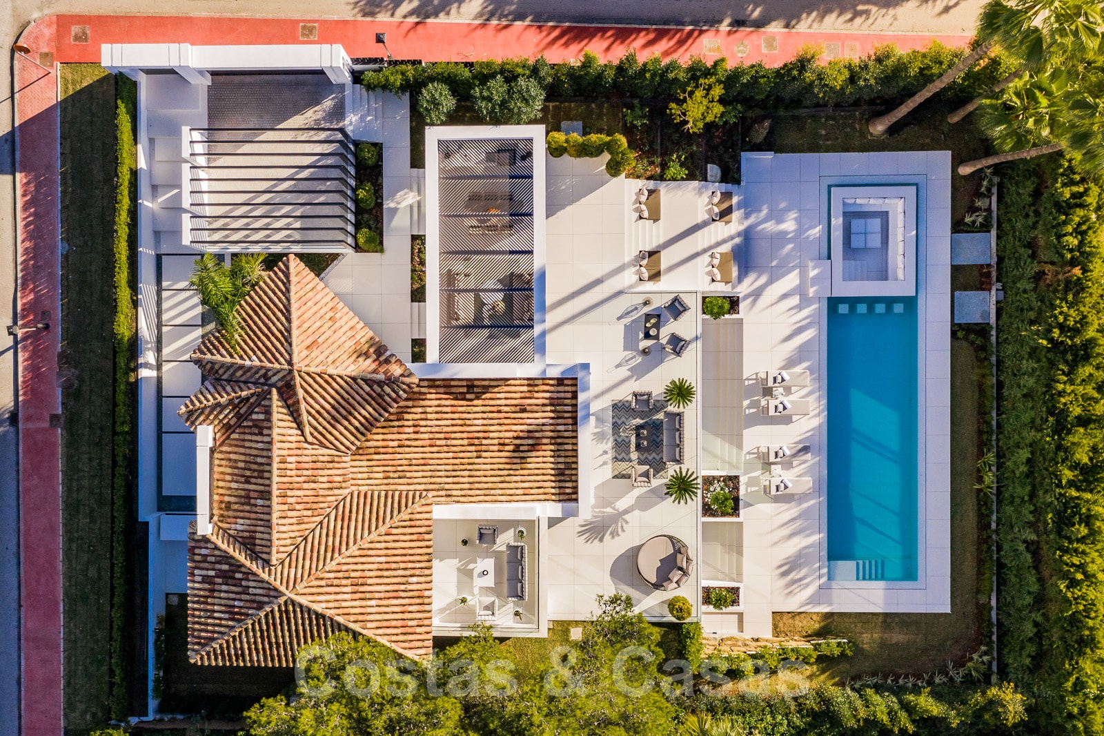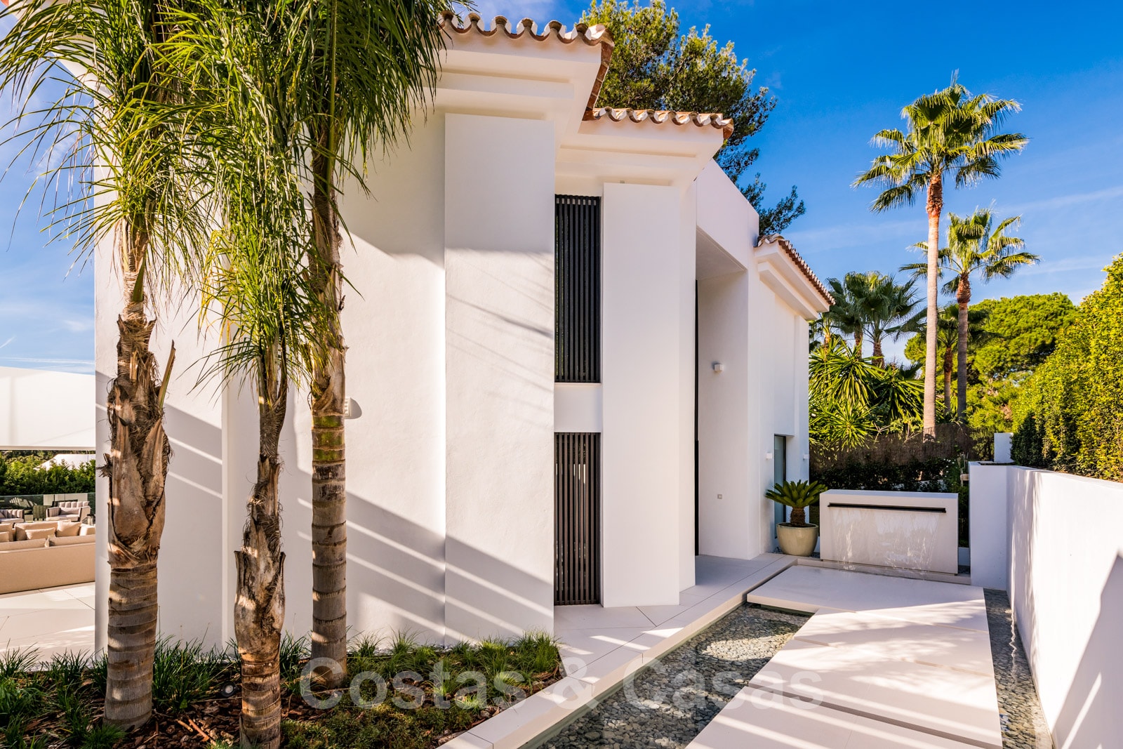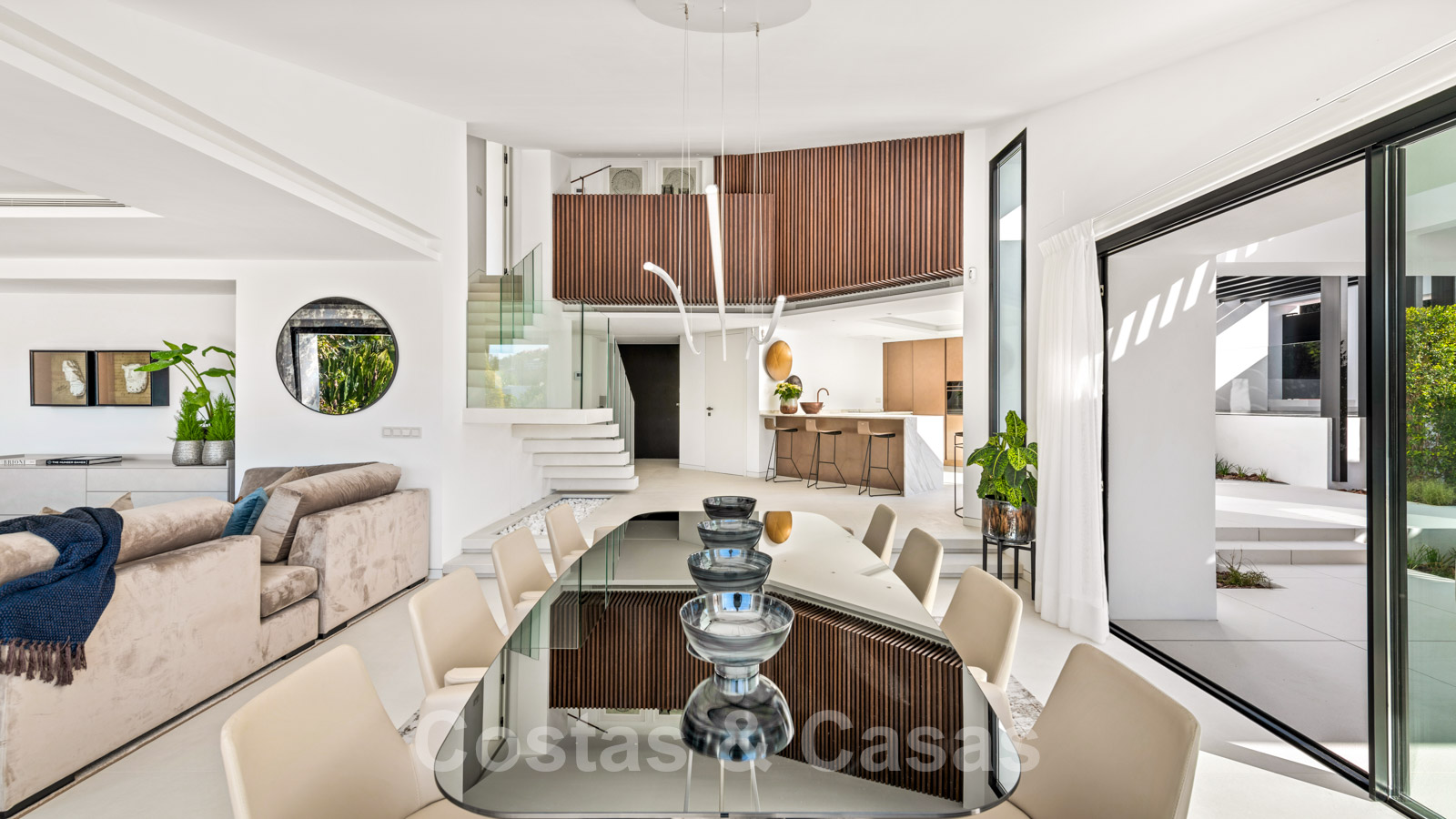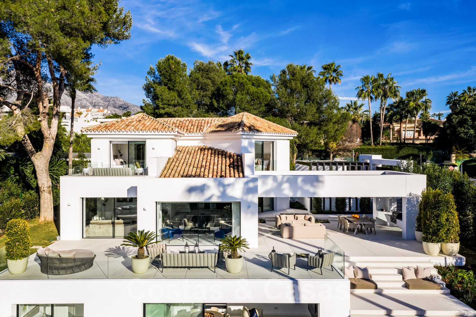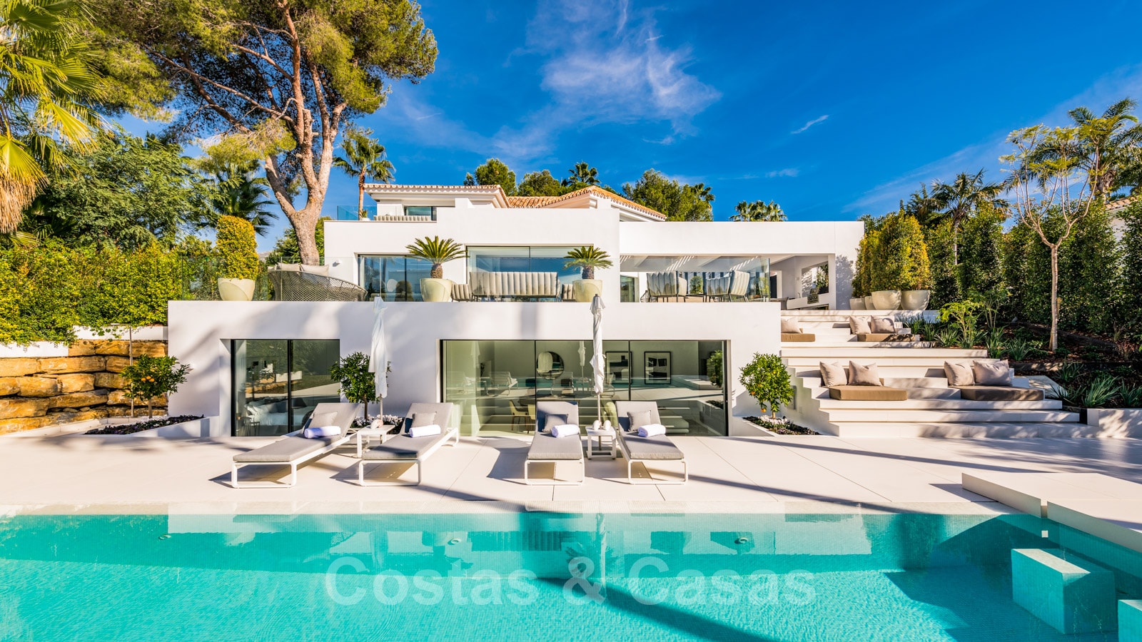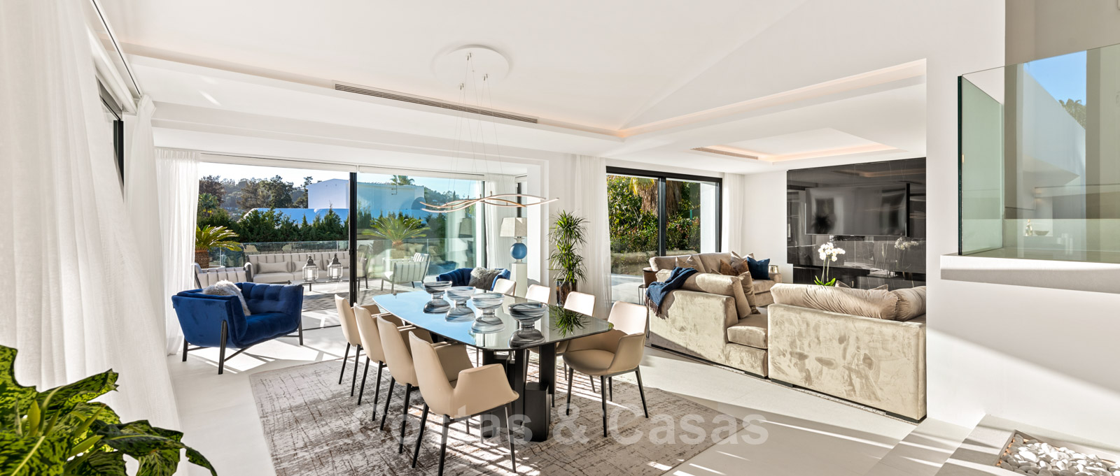 La vie à l'intérieur et à l'extérieur est mise en valeur. Il y a de grandes terrasses ouvertes et couvertes, y compris un coin chill-out, une cuisine extérieure et une salle à manger. Un coin salon supplémentaire est attenant à la magnifique piscine à débordement.