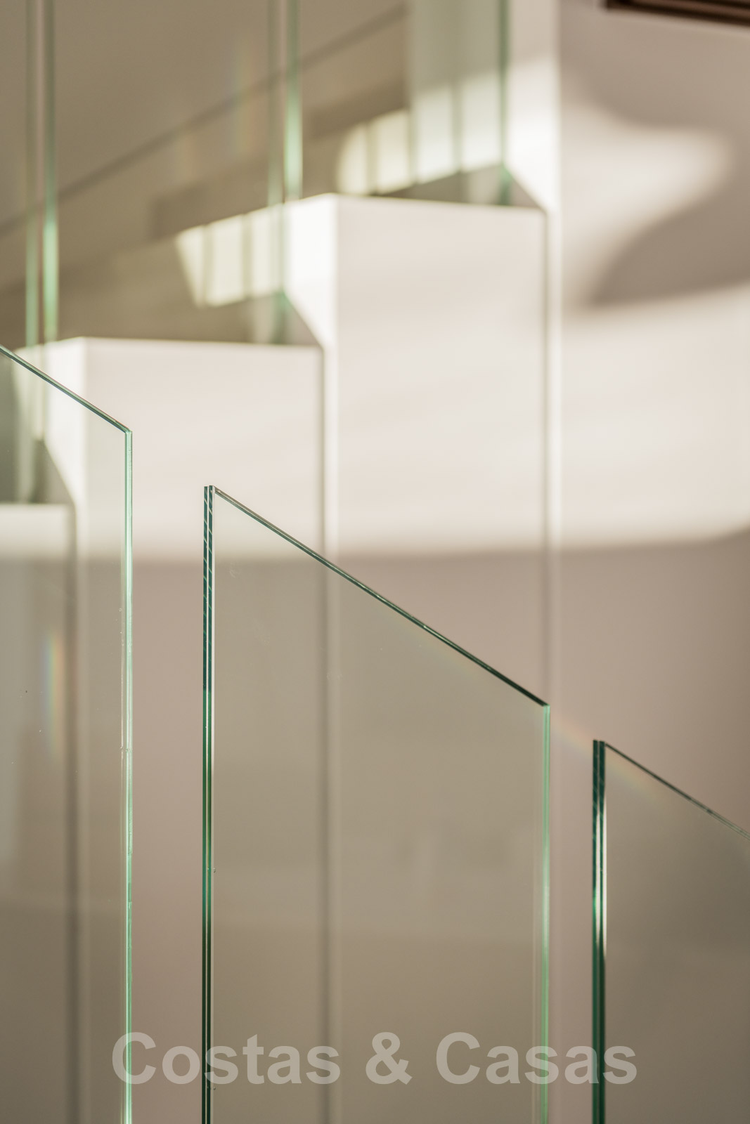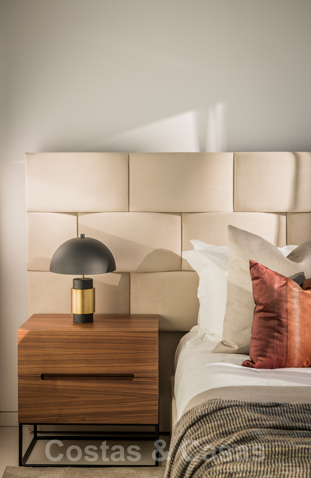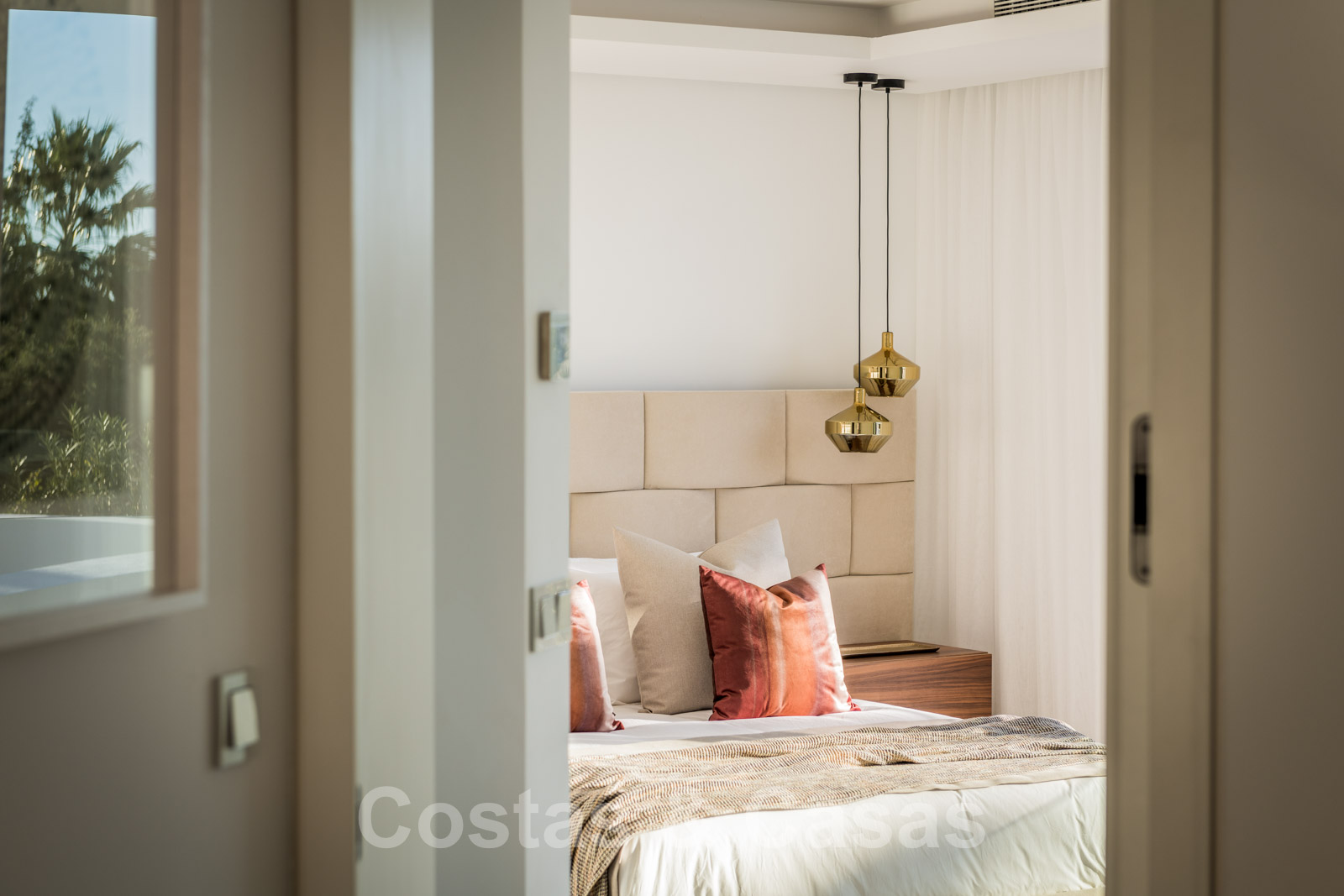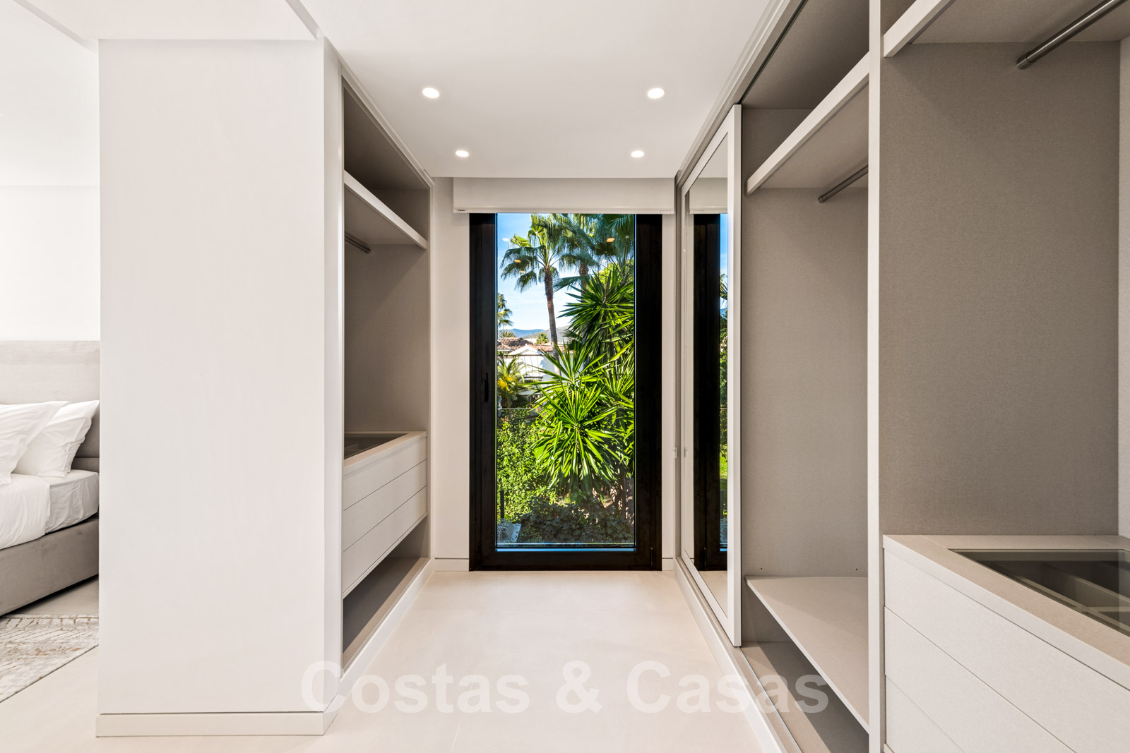 Étage supérieur : escalier et palier. Chambre à coucher en-suite avec placards encastrés. Chambre principale en-suite avec dressing et terrasse privée avec vue sur la piscine.