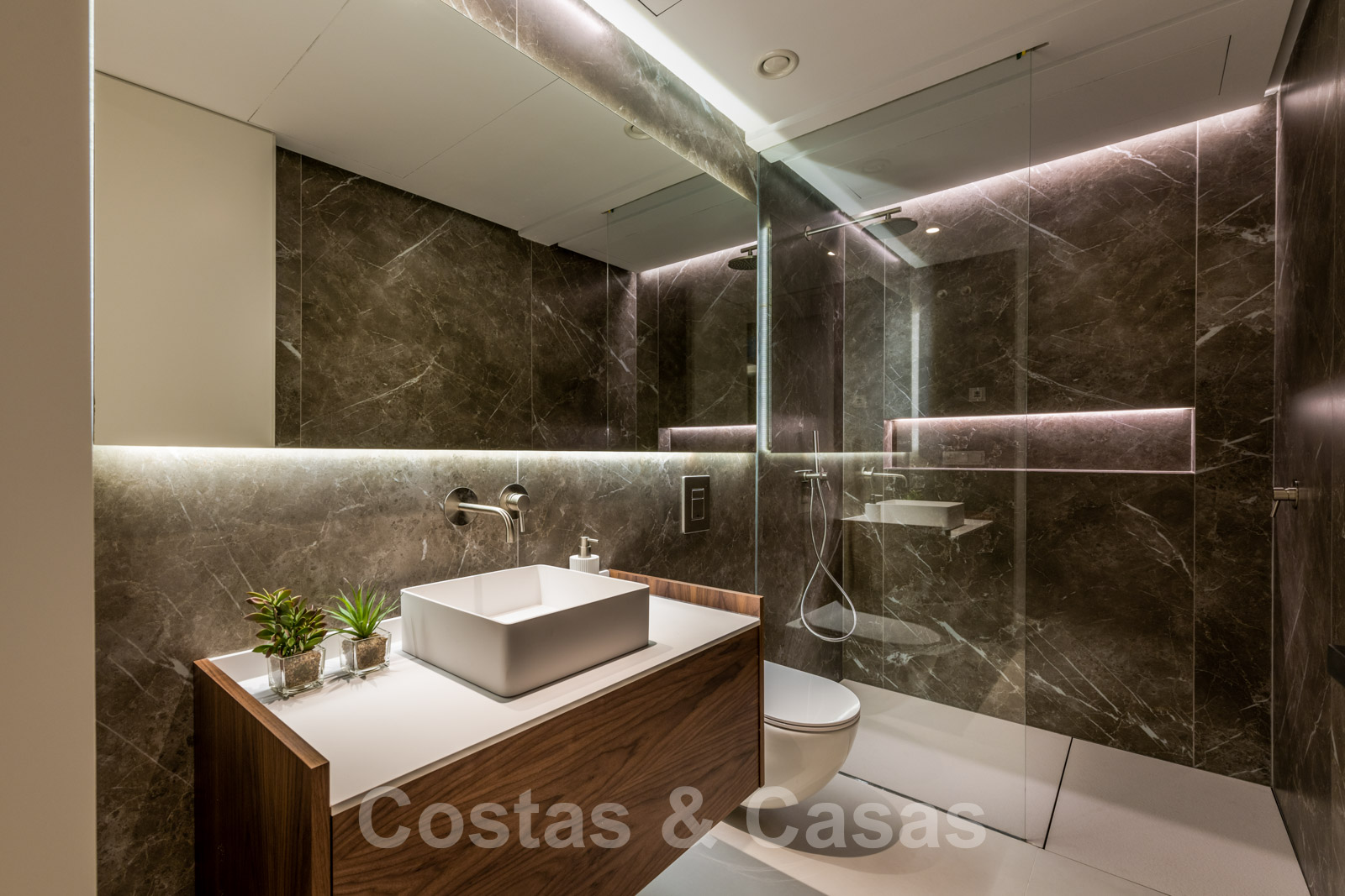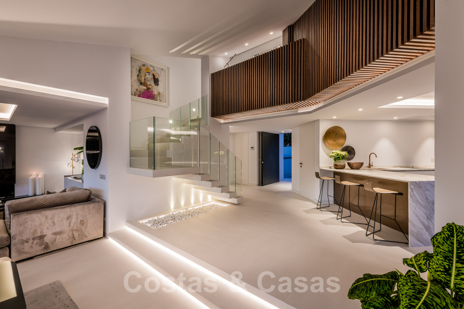Rez-de-chaussée : hall, toilette, escaliers. Chambre à coucher avec salle de bain. Cuisine ouverte avec îlot de cuisson et bar à petit-déjeuner. Coin salon et salle à manger intégrés. Le tout avec accès direct à de spacieuses terrasses couvertes et ouvertes avec cuisine extérieure, coin repas et salon. Entrée avec jeux d'eau. Abri pour 2 voitures.