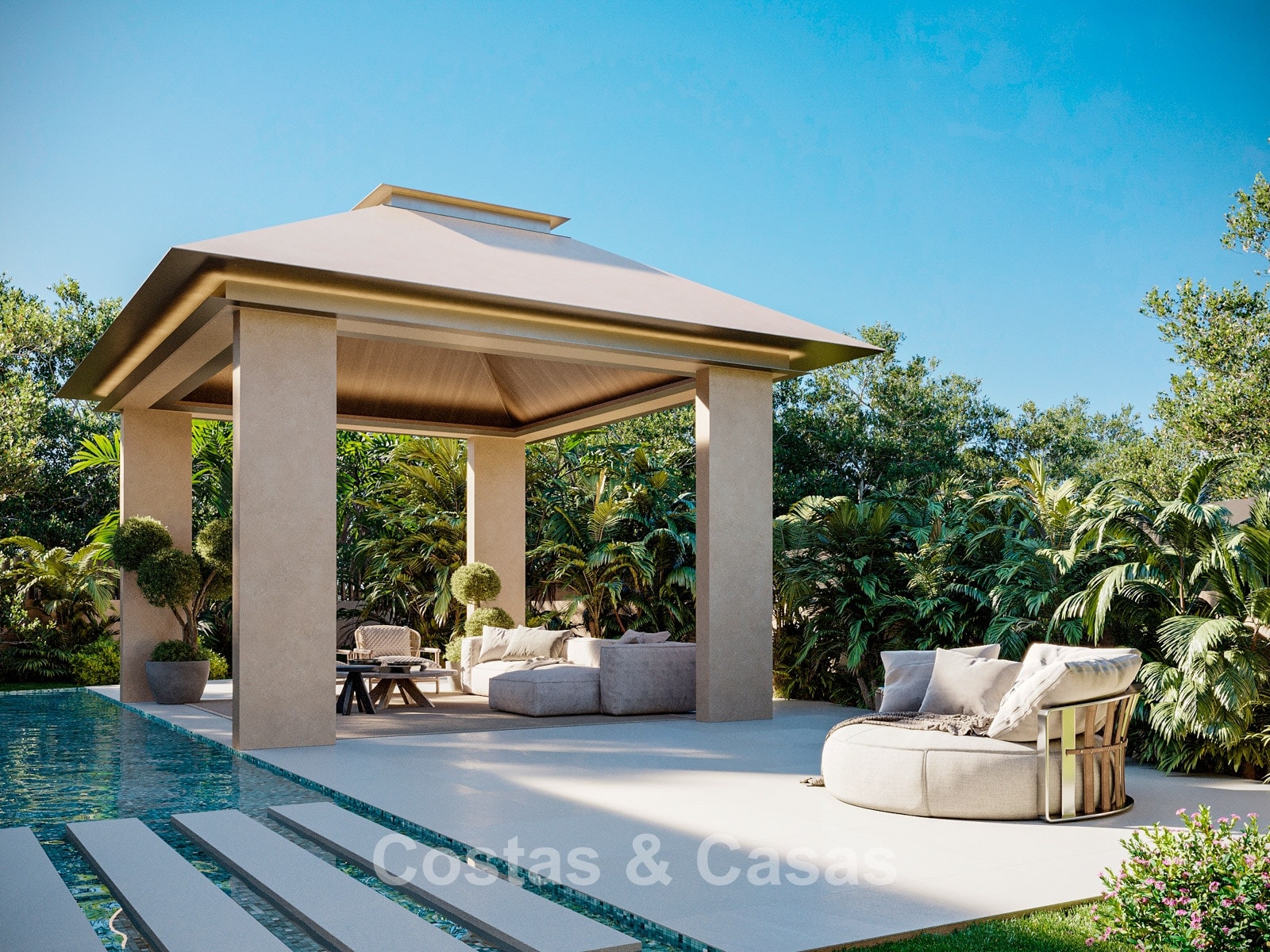 Vaste terrain verdoyant. Le jardin paysager, soigneusement entretenu, est agrémenté de plantes tropicales et d'une pelouse. La piscine à débordement, véritable joyau de l'espace extérieur, arbore des lignes épurées et modernes et une ambiance luxueuse. Les terrasses environnantes, ainsi que le pavillon élégamment conçu avec son salon semi-enterré, offrent un cadre extérieur exclusif propice à la détente. Vue apaisante sur la végétation tropicale luxuriante qui entoure la villa.
