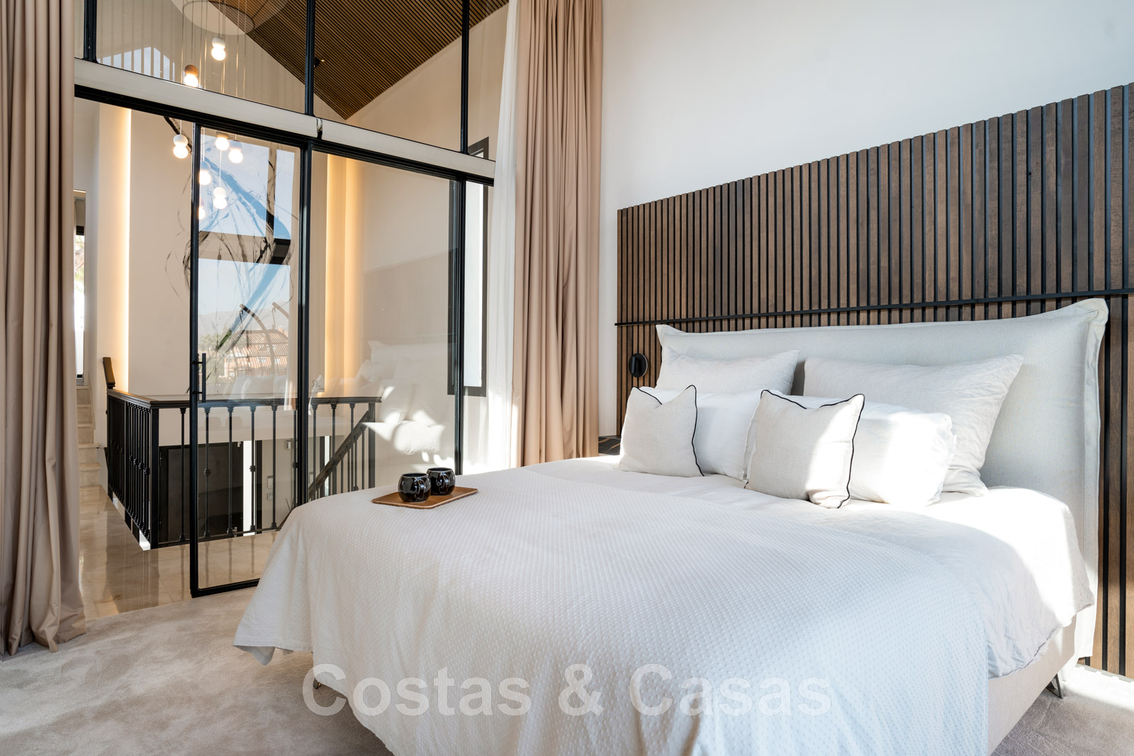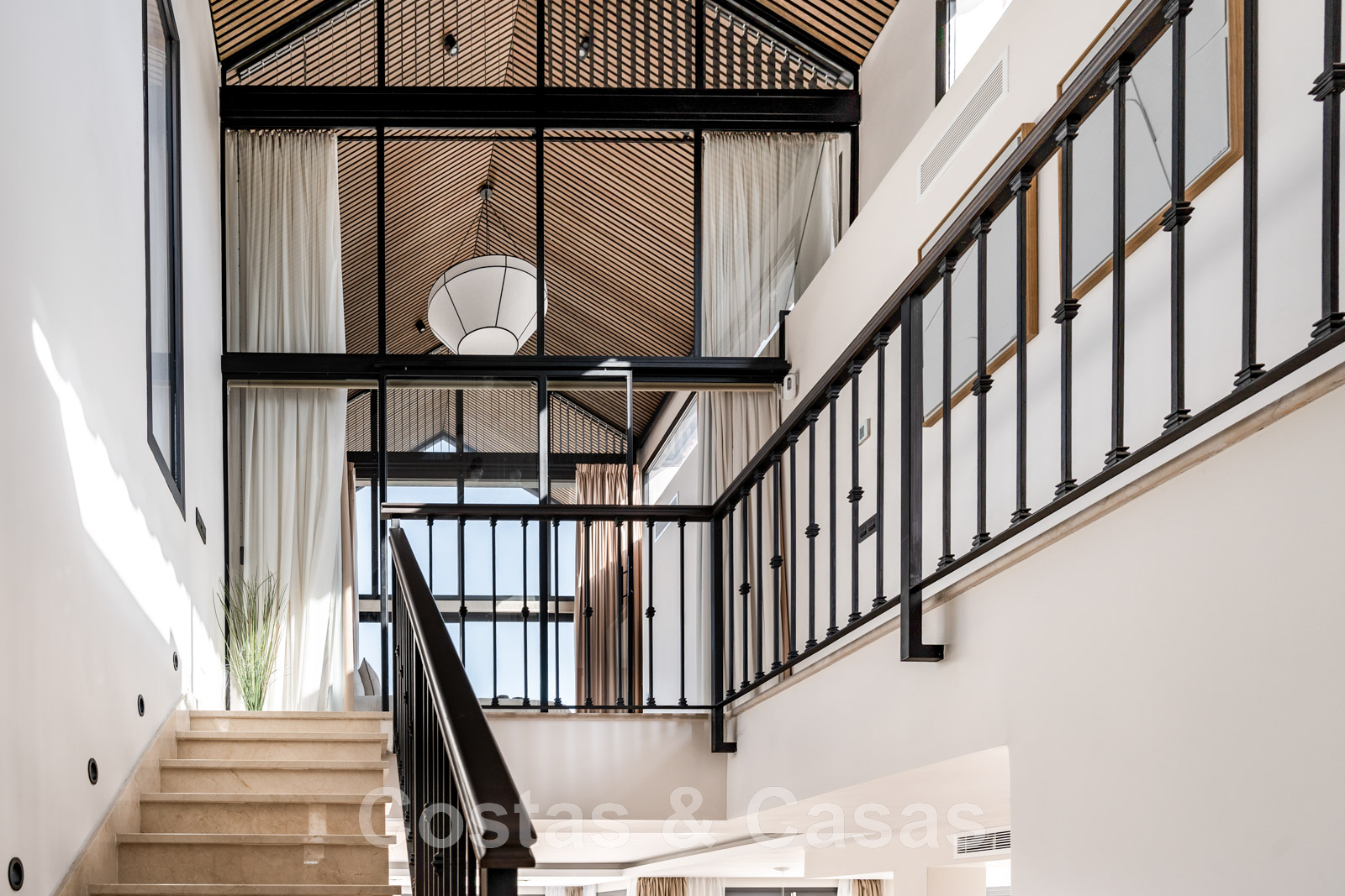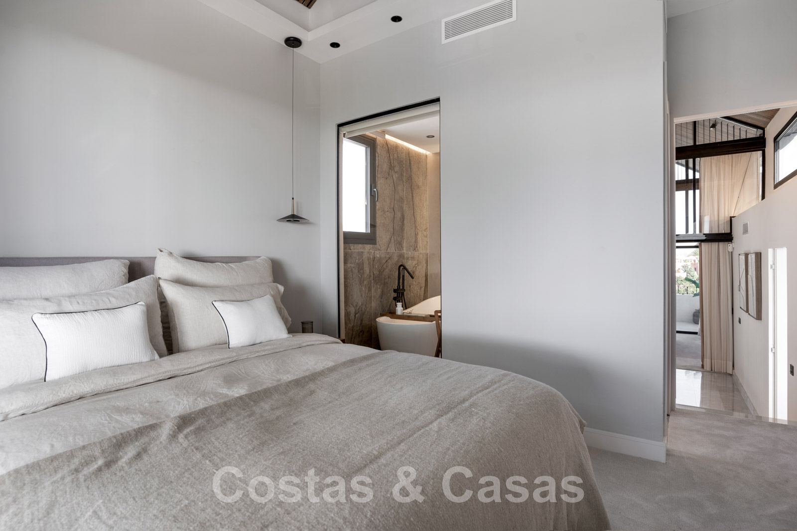 La spectaculaire suite principale est dotée d'une double hauteur, d'un plafond voûté, d'un dressing sur mesure et d'un accès à la terrasse privée.