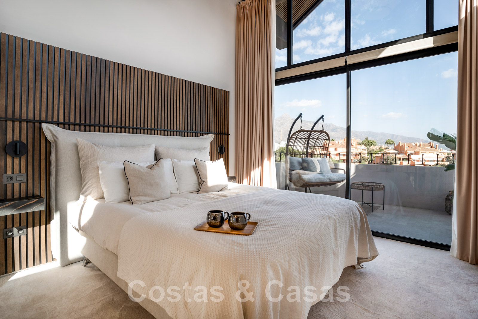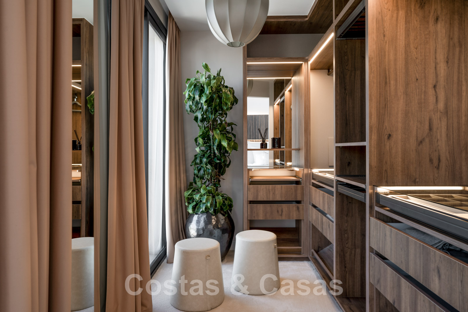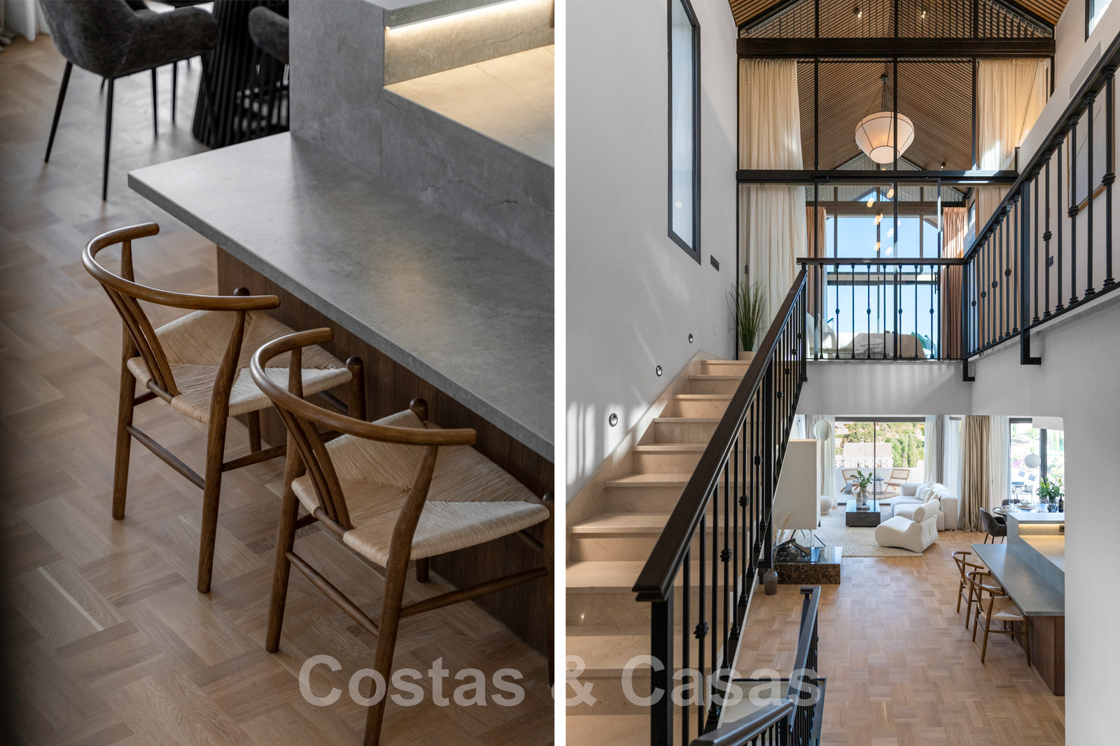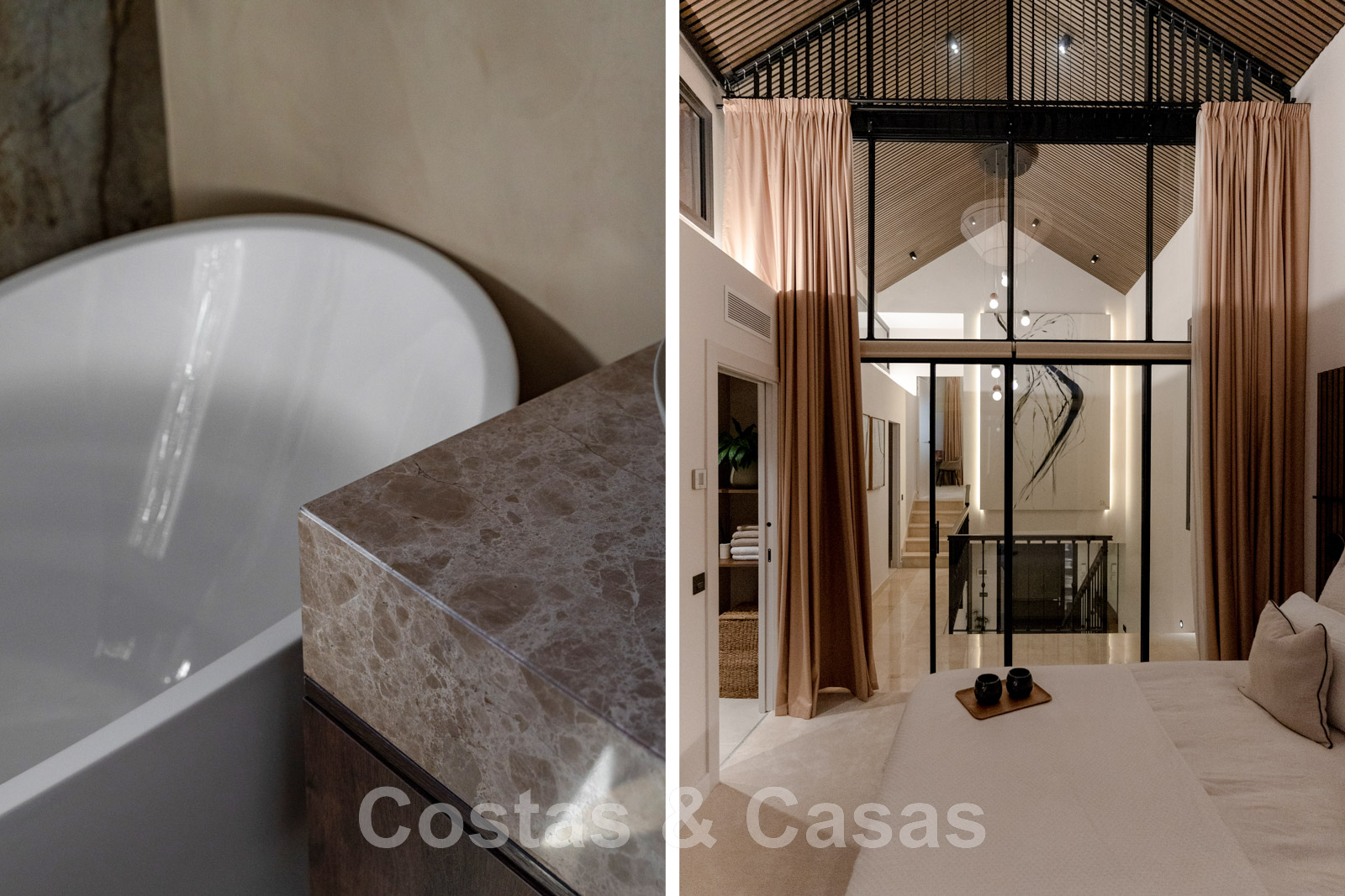 La spectaculaire suite principale est dotée d'une double hauteur, d'un plafond voûté, d'un dressing sur mesure et d'un accès à la terrasse privée.