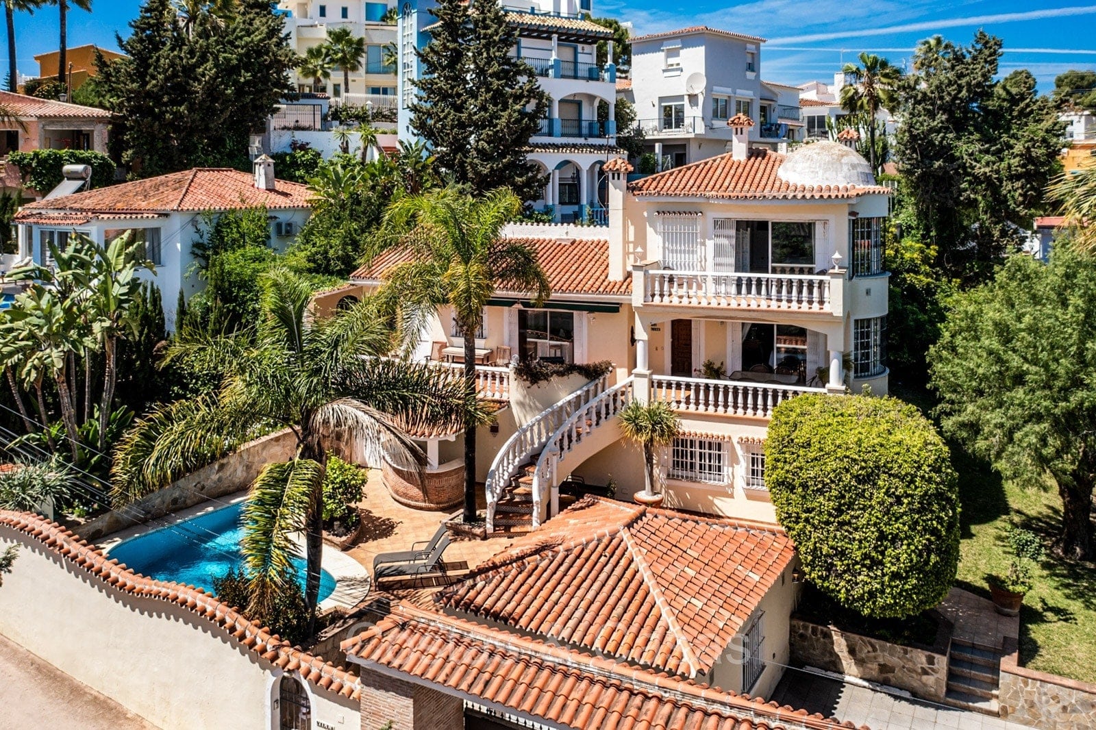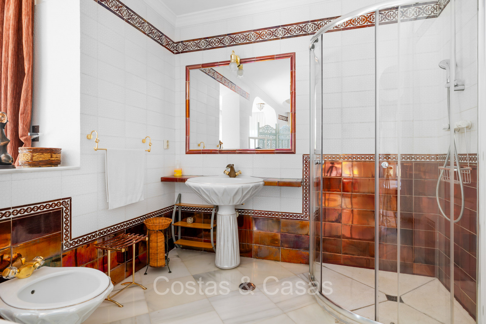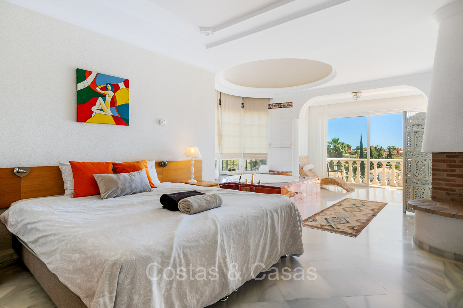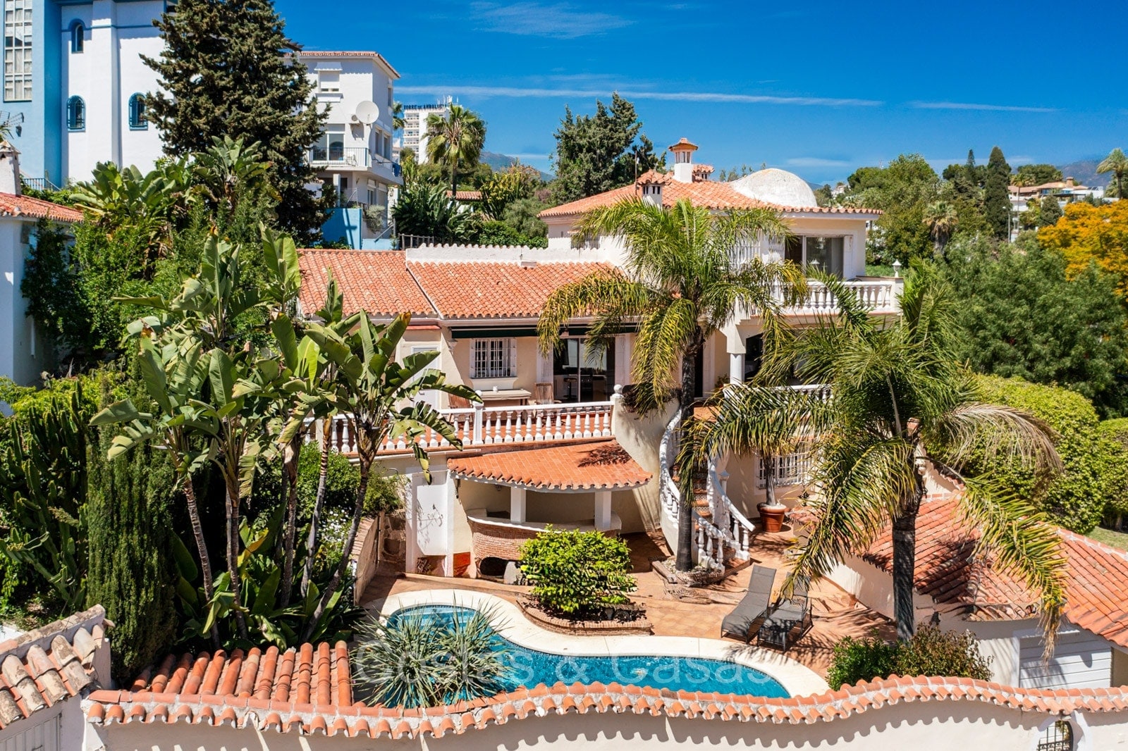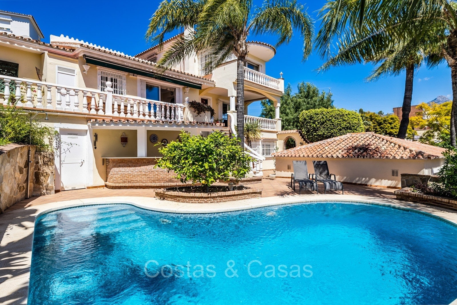 Villa individuelle de style architectural andalou traditionnel. De hautes fenêtres coulissantes offrent un intérieur aéré et très lumineux. Séjour spacieux avec un salon TV avec cheminée. Cuisine ouverte entièrement équipée avec un îlot. Coin repas intégré. 5 chambres, 4 salles de bains et une toilette séparée. La suite principale dispose d'un jacuzzi et d'un accès à une terrasse privée. Sols en marbre. L’étage inférieur en rez-de-jardin abrite une chambre d'amis avec salle de bains, sauna et buanderie. Débarras. Garage intérieur pour 1 voiture. Parking supplémentaire pour 2 voitures.