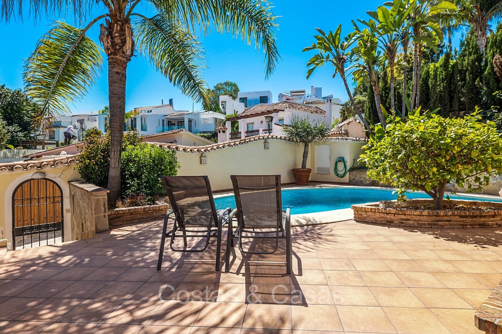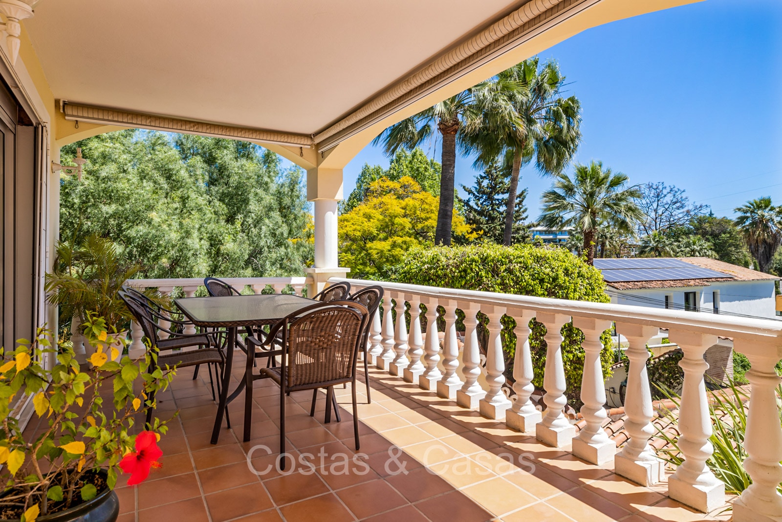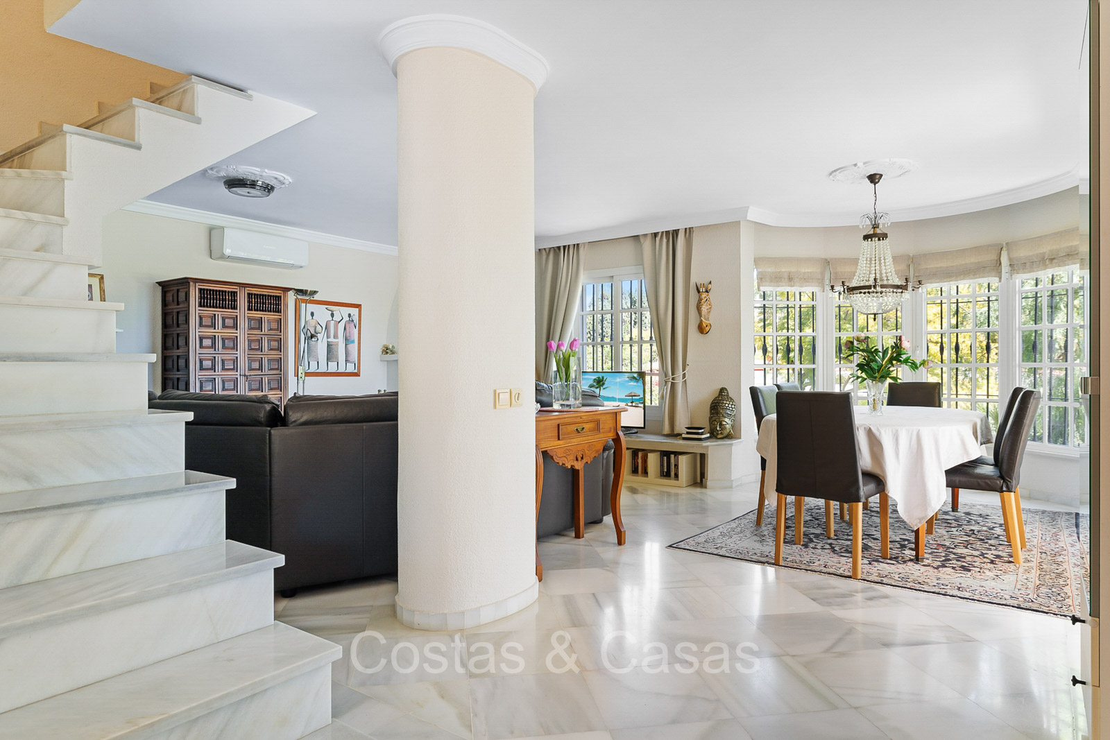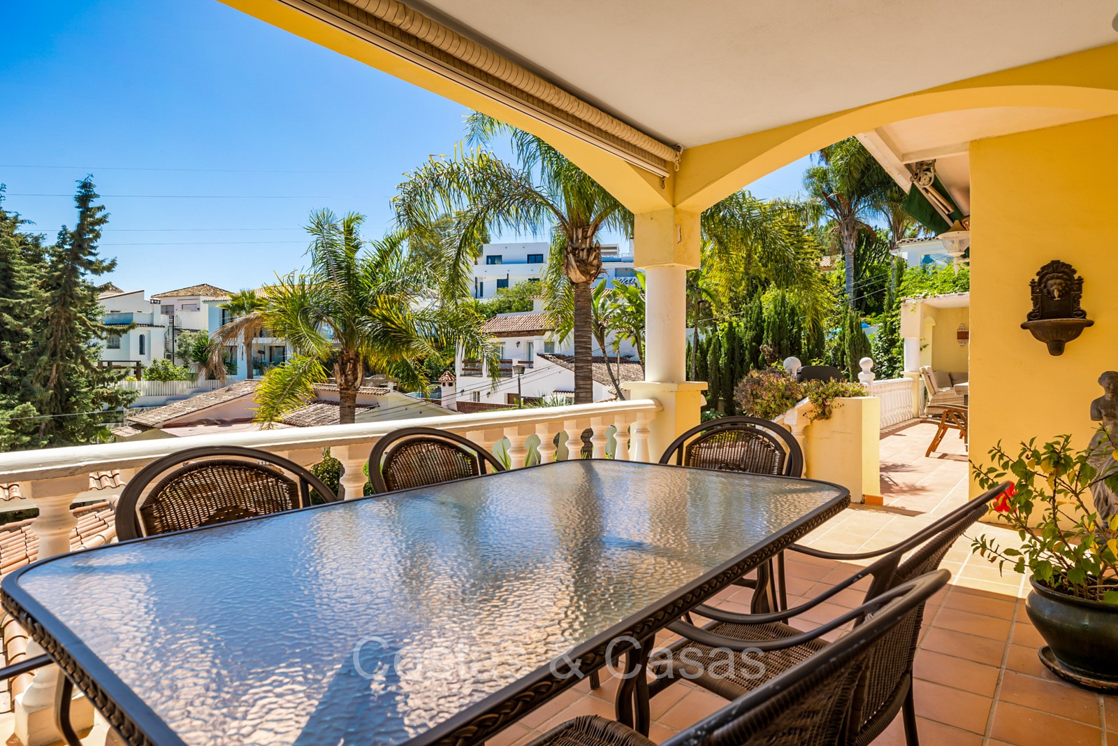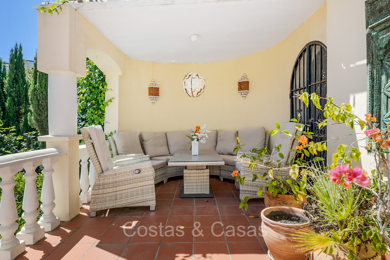 Villa individuelle de style architectural andalou traditionnel. De hautes fenêtres coulissantes offrent un intérieur aéré et très lumineux. Séjour spacieux avec un salon TV avec cheminée. Cuisine ouverte entièrement équipée avec un îlot. Coin repas intégré. 5 chambres, 4 salles de bains et une toilette séparée. La suite principale dispose d'un jacuzzi et d'un accès à une terrasse privée. Sols en marbre. L’étage inférieur en rez-de-jardin abrite une chambre d'amis avec salle de bains, sauna et buanderie. Débarras. Garage intérieur pour 1 voiture. Parking supplémentaire pour 2 voitures.