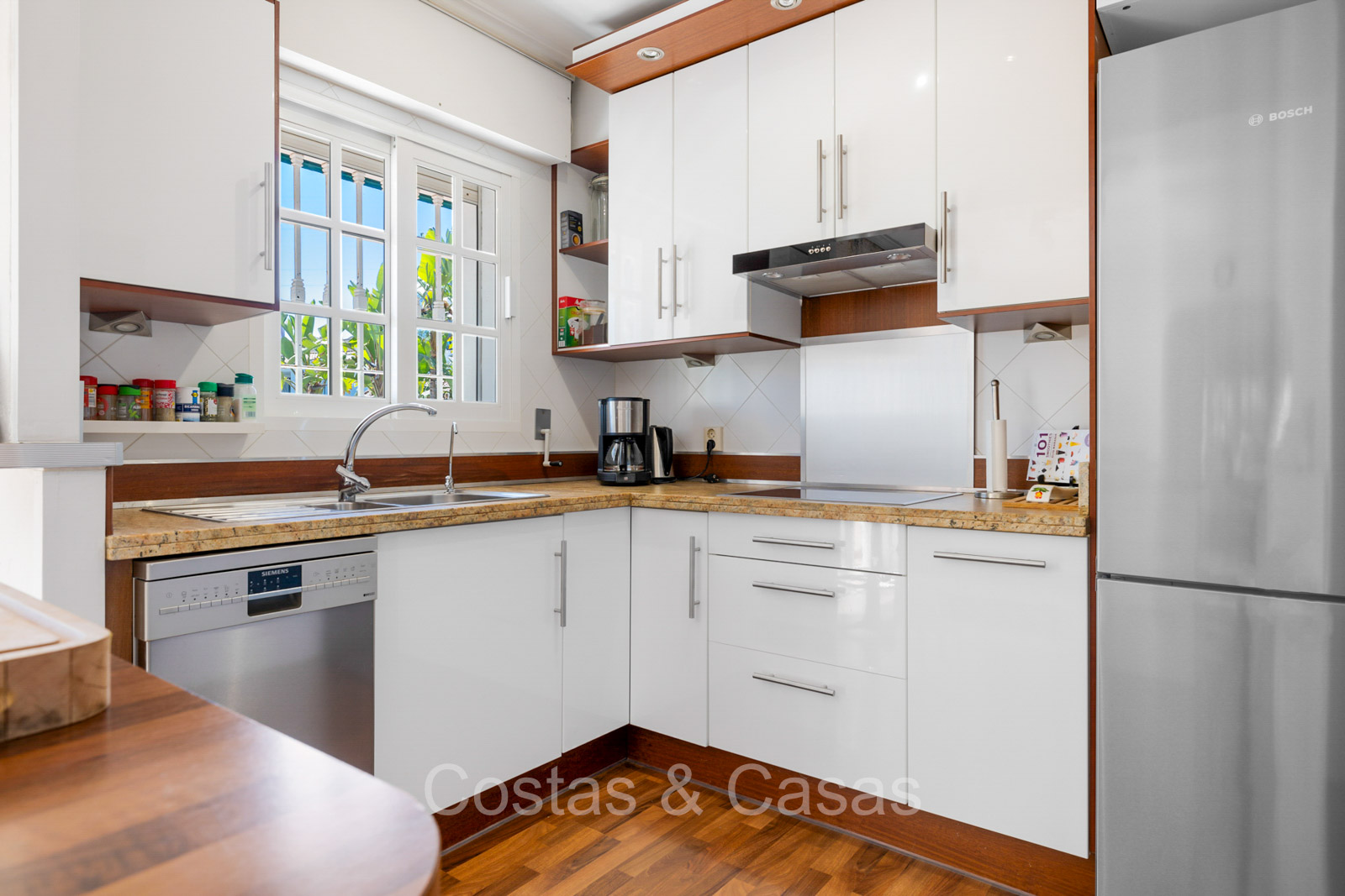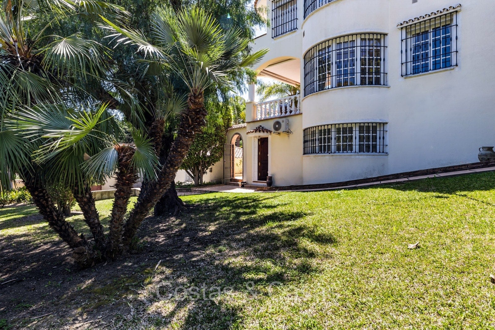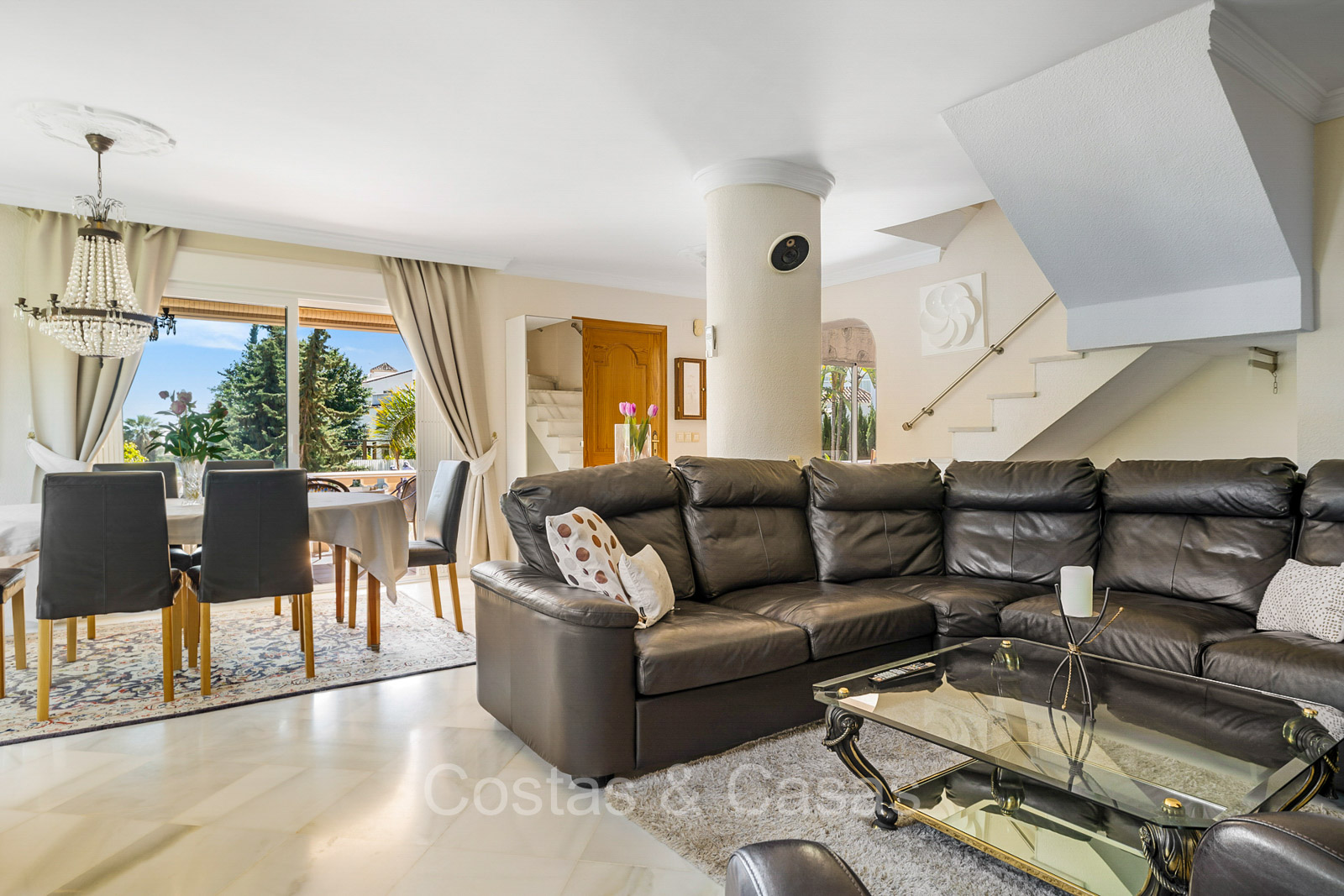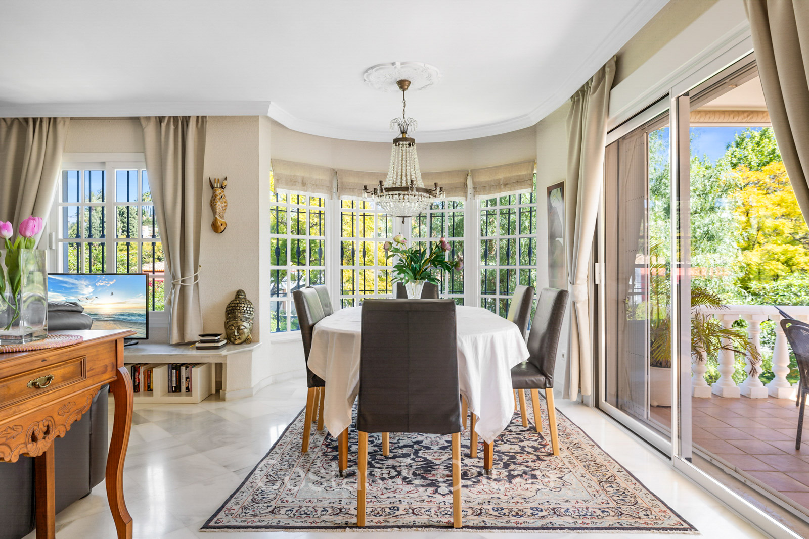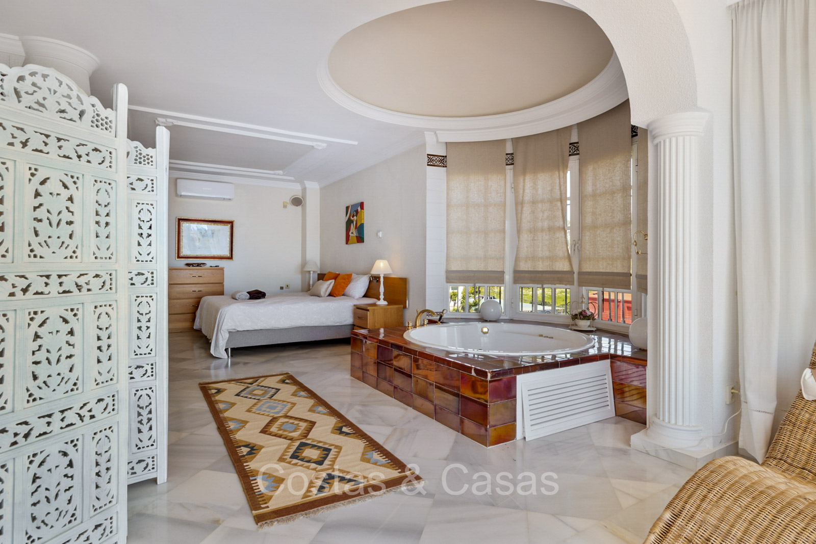 Villa individuelle de style architectural andalou traditionnel. De hautes fenêtres coulissantes offrent un intérieur aéré et très lumineux. Séjour spacieux avec un salon TV avec cheminée. Cuisine ouverte entièrement équipée avec un îlot. Coin repas intégré. 5 chambres, 4 salles de bains et une toilette séparée. La suite principale dispose d'un jacuzzi et d'un accès à une terrasse privée. Sols en marbre. L’étage inférieur en rez-de-jardin abrite une chambre d'amis avec salle de bains, sauna et buanderie. Débarras. Garage intérieur pour 1 voiture. Parking supplémentaire pour 2 voitures.