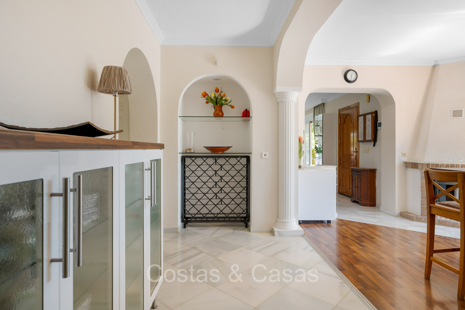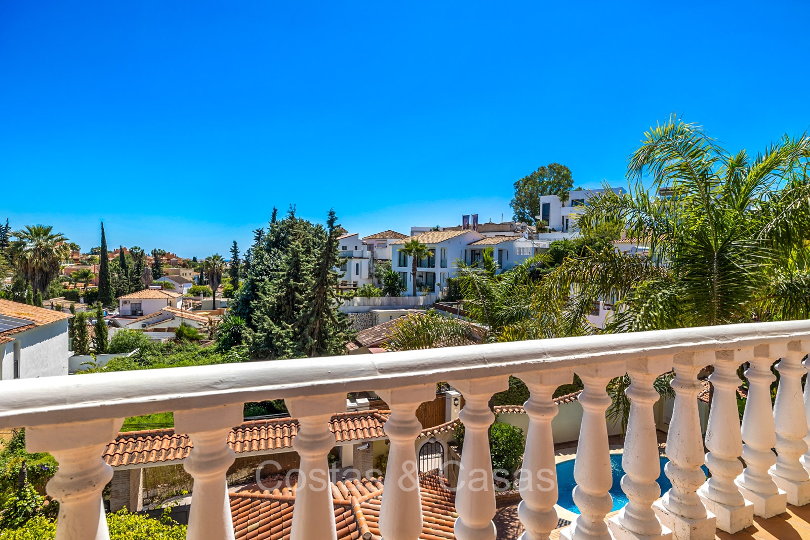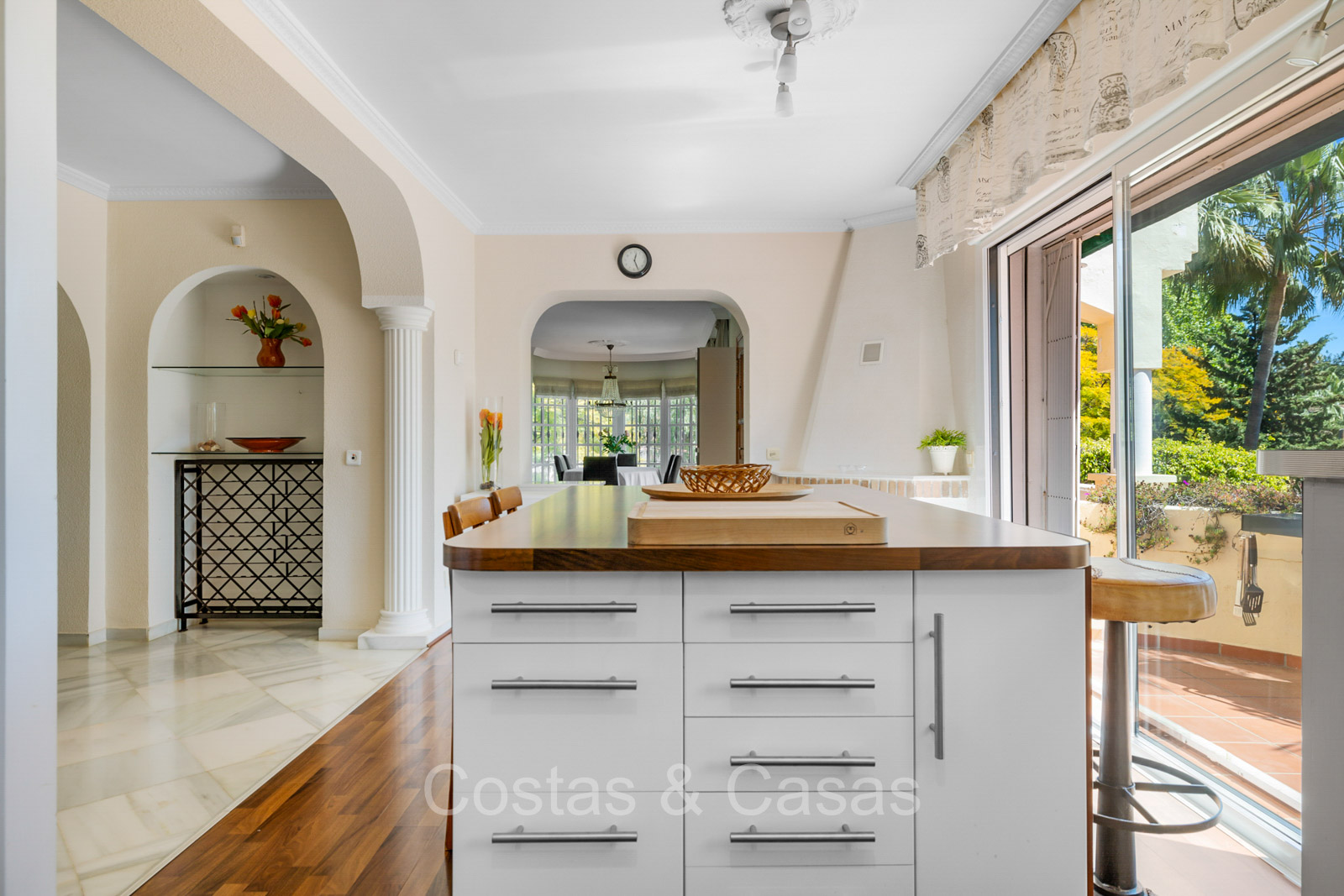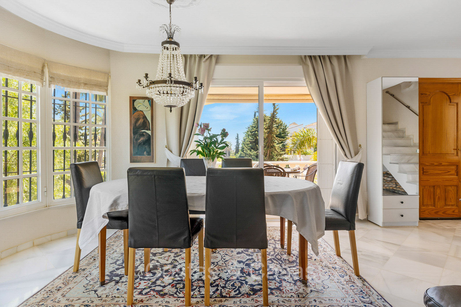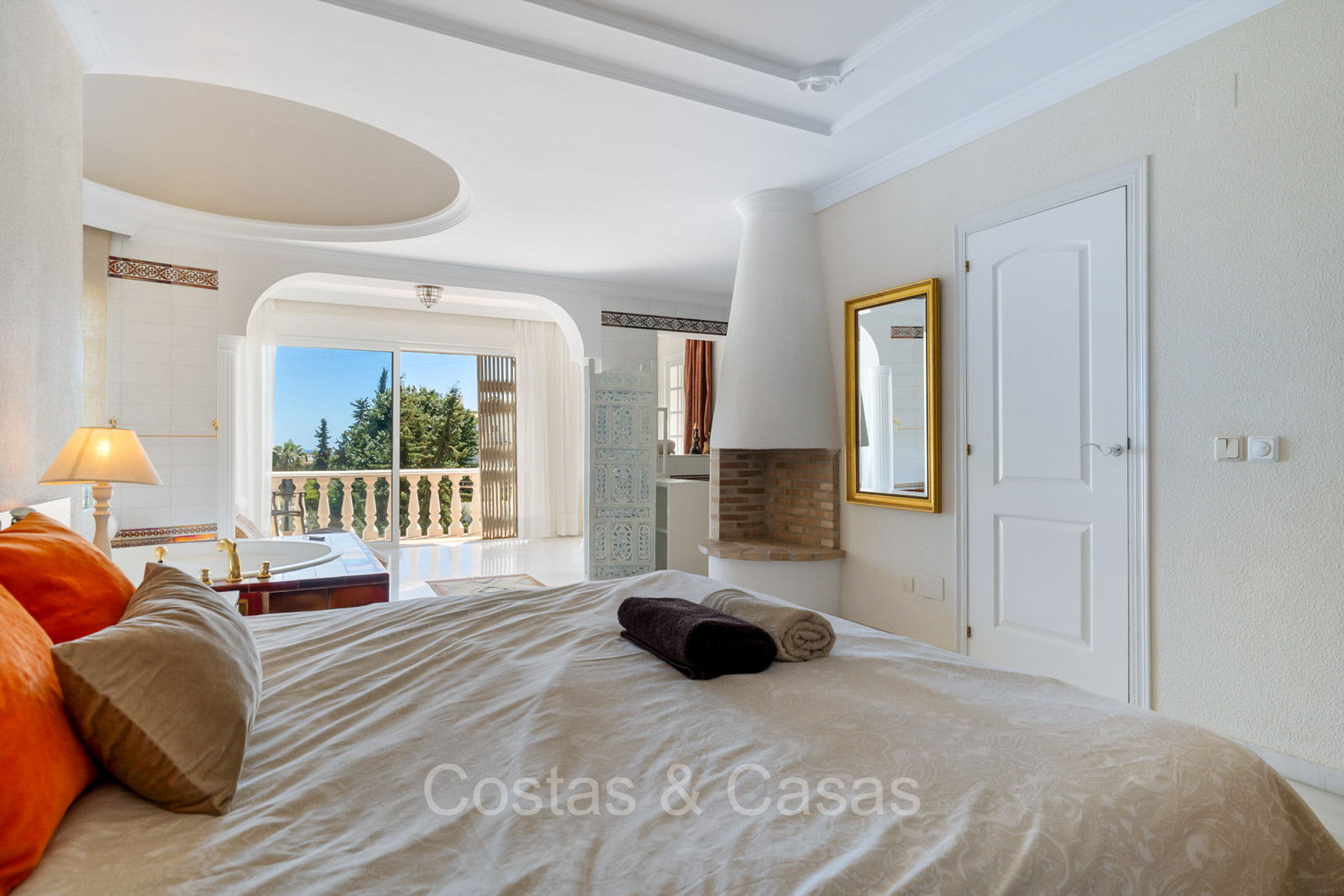 Villa individuelle de style architectural andalou traditionnel. De hautes fenêtres coulissantes offrent un intérieur aéré et très lumineux. Séjour spacieux avec un salon TV avec cheminée. Cuisine ouverte entièrement équipée avec un îlot. Coin repas intégré. 5 chambres, 4 salles de bains et une toilette séparée. La suite principale dispose d'un jacuzzi et d'un accès à une terrasse privée. Sols en marbre. L’étage inférieur en rez-de-jardin abrite une chambre d'amis avec salle de bains, sauna et buanderie. Débarras. Garage intérieur pour 1 voiture. Parking supplémentaire pour 2 voitures.