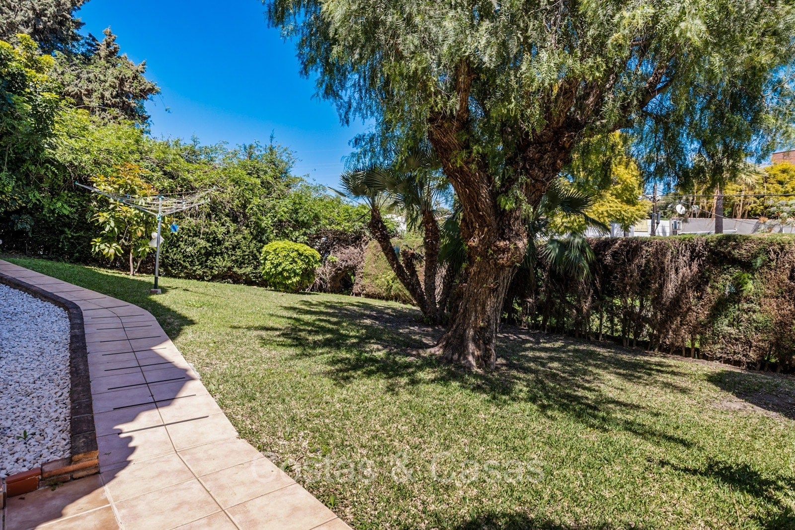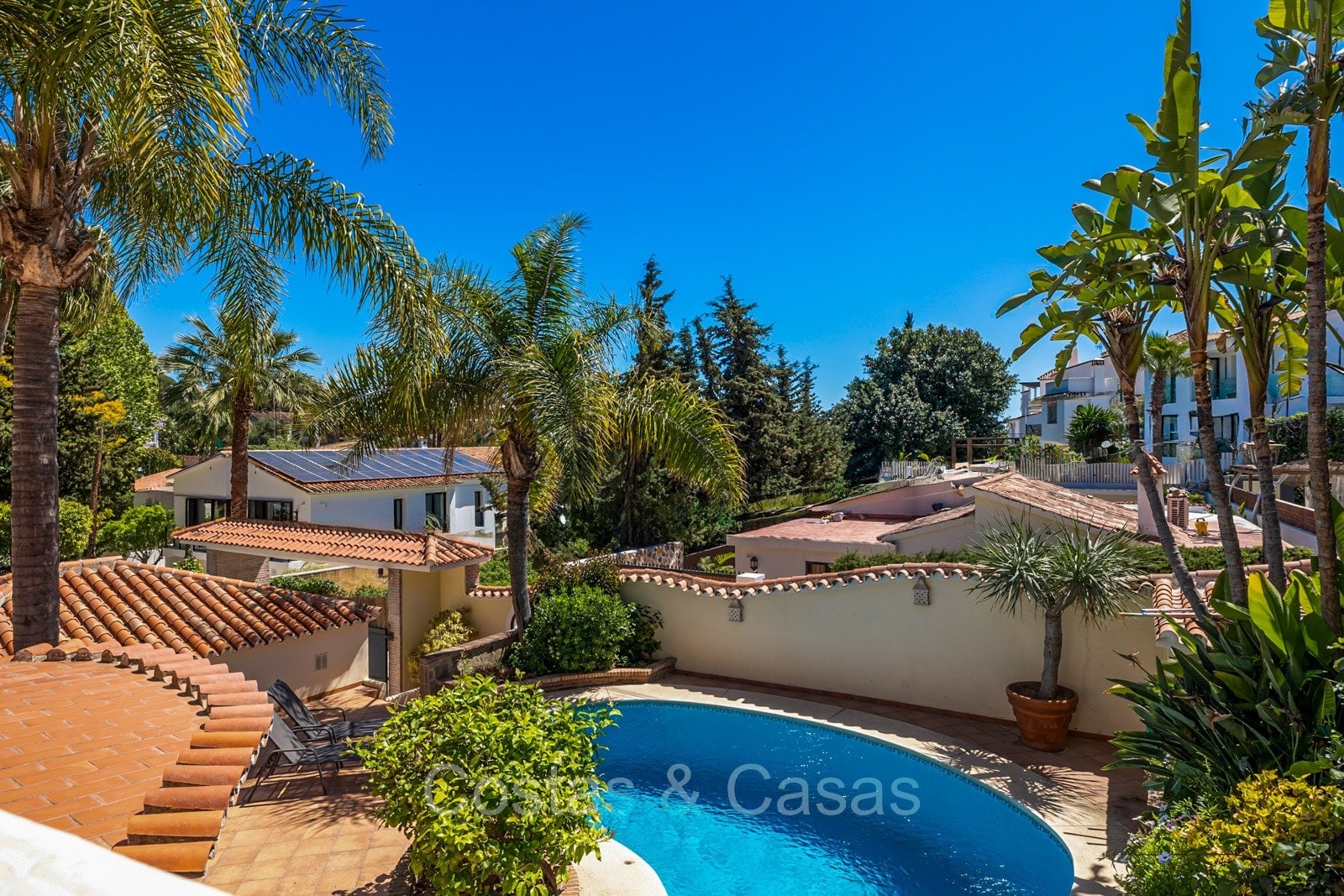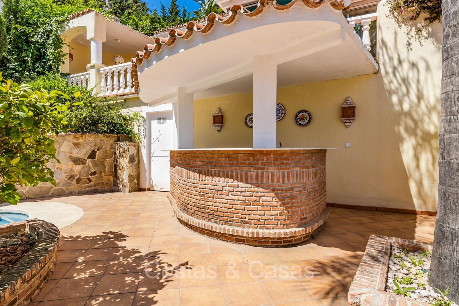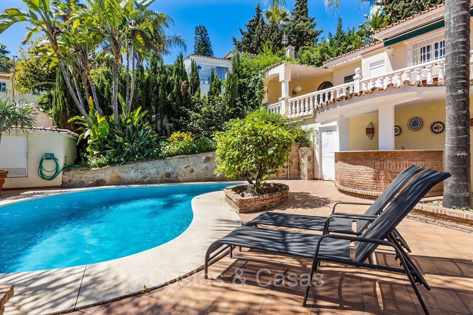 Terrain spacieux, entièrement entouré de plantes, qui offre l'intimité nécessaire. Jardin paysagé bien entretenu avec arbres matures et pelouse. Piscine privée intégrée entourée d'une terrasse ensoleillée et d'un bar de piscine ouvert. Plusieurs terrasses ouvertes et ombragées équipées d'un salon, d'un coin repas extérieur et d'un coin barbecue. Exposition sud. Vue sur le jardin et les environs pittoresques.
