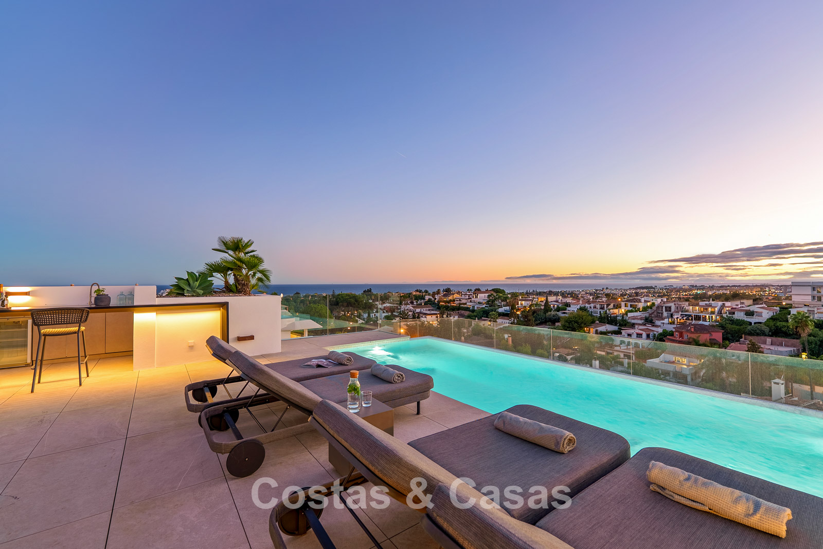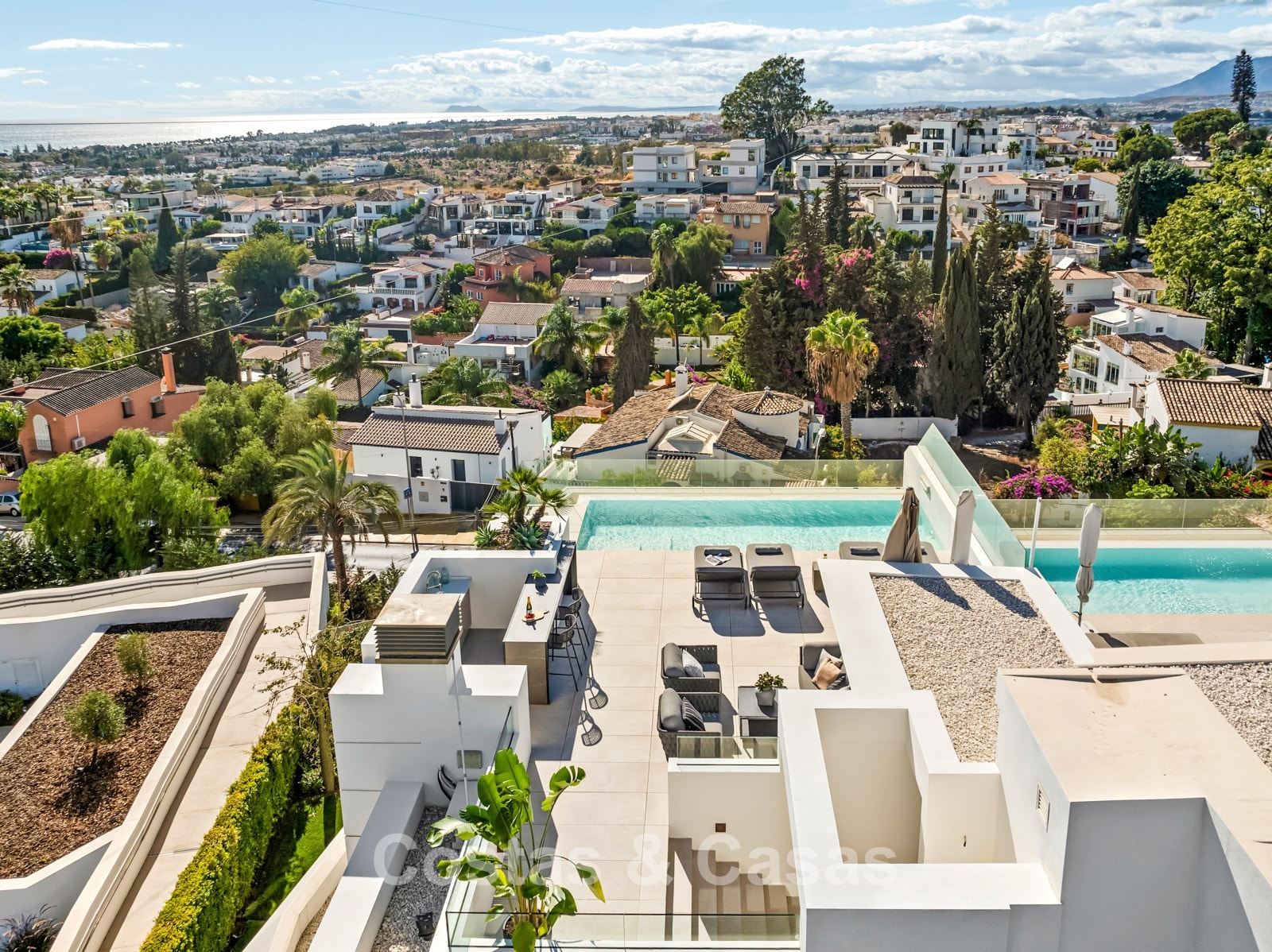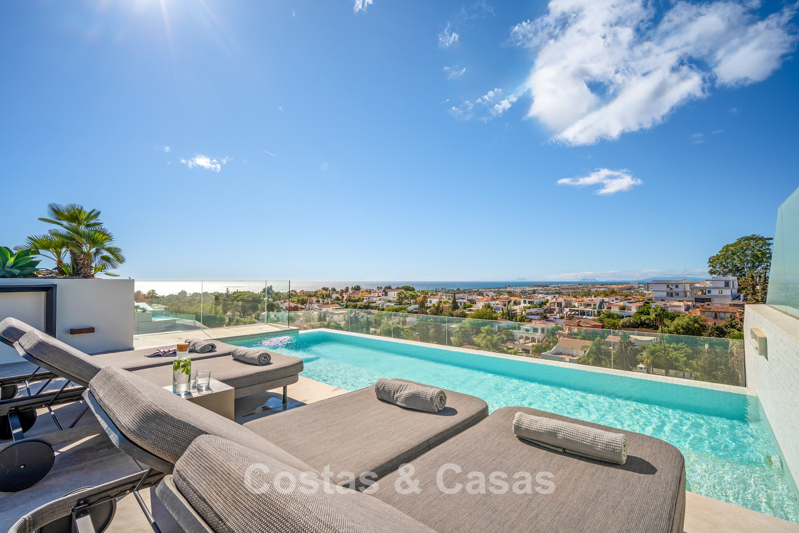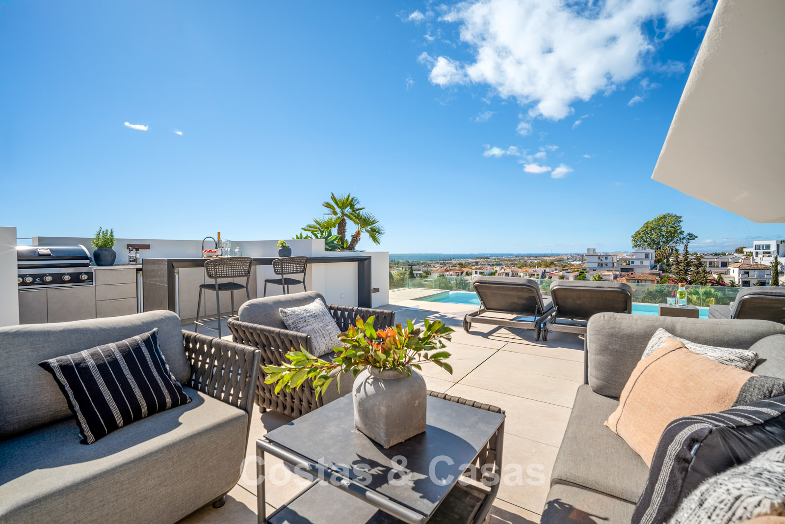 Jardin privé entièrement clos avec son propre putting green. Plusieurs terrasses spacieuses optimisent l'ensoleillement, l'intimité et les vues. La vaste terrasse sur le toit est conçue pour un confort et une détente absolue. Elle comprend une élégante cuisine d'été, une piscine et divers espaces de détente offrant une vue panoramique. Orientation sud-ouest. Vue sur le sommet du mont La Concha, la mer Méditerranée et le détroit de Gibraltar.