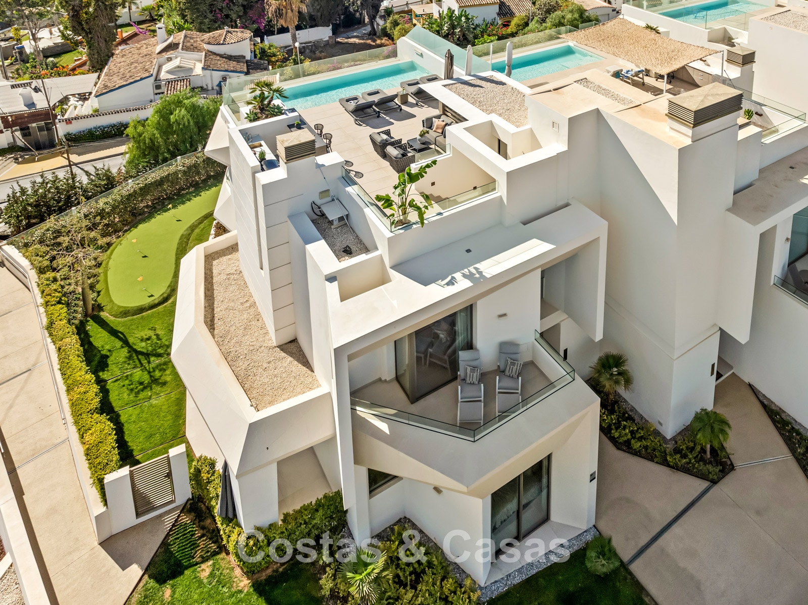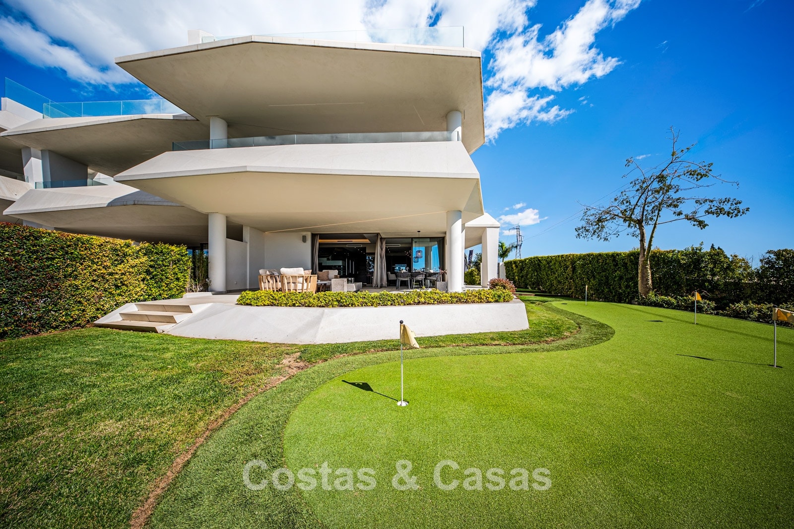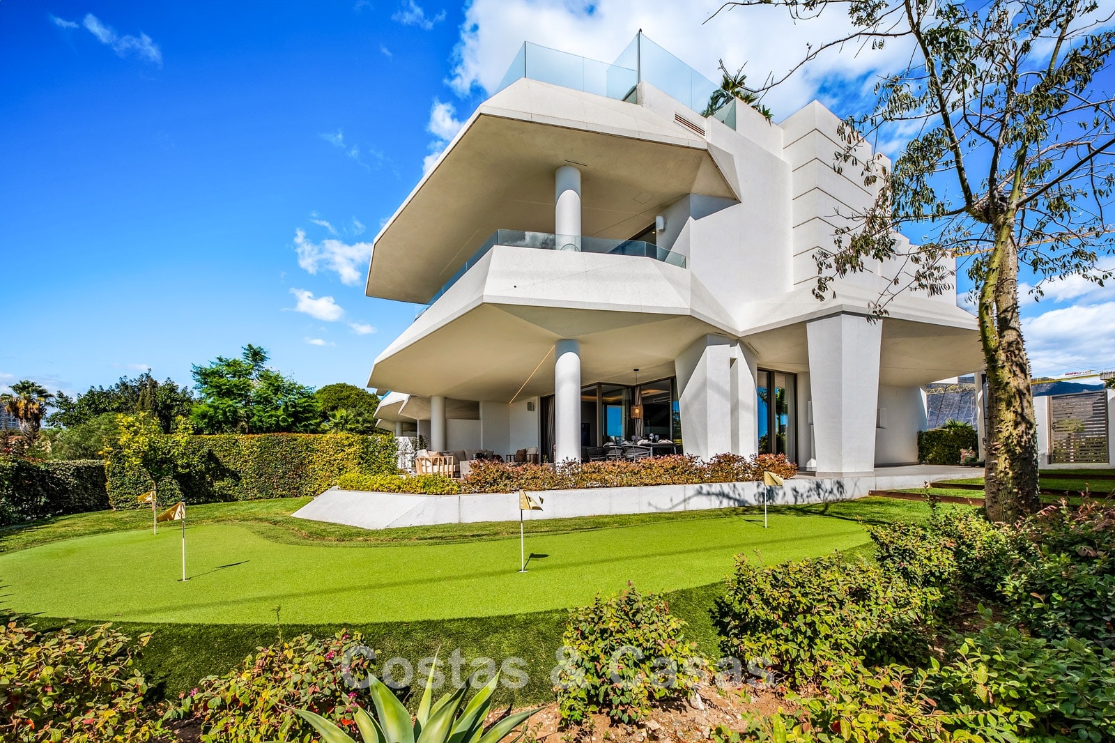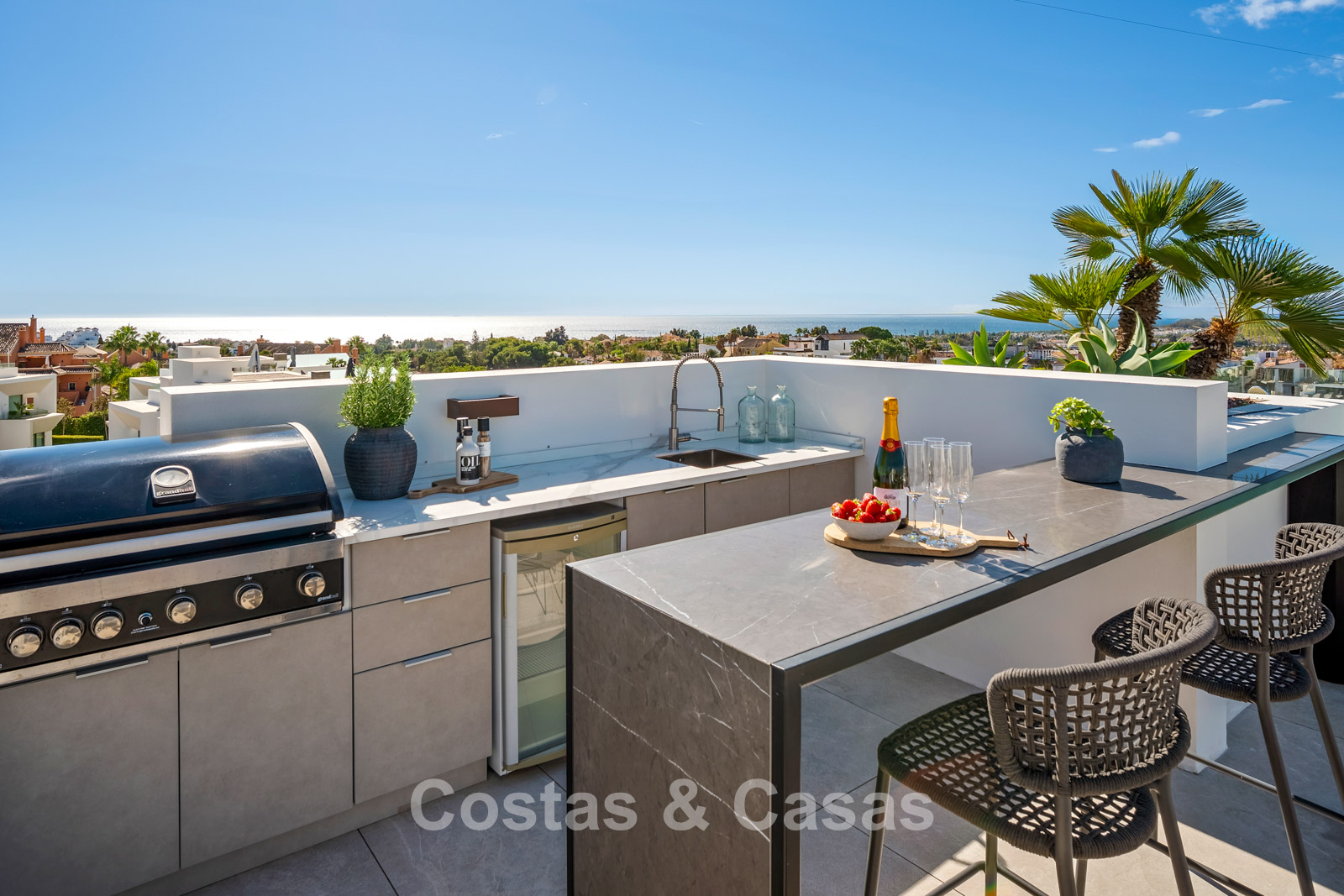 Jardin privé entièrement clos avec son propre putting green. Plusieurs terrasses spacieuses optimisent l'ensoleillement, l'intimité et les vues. La vaste terrasse sur le toit est conçue pour un confort et une détente absolue. Elle comprend une élégante cuisine d'été, une piscine et divers espaces de détente offrant une vue panoramique. Orientation sud-ouest. Vue sur le sommet du mont La Concha, la mer Méditerranée et le détroit de Gibraltar.