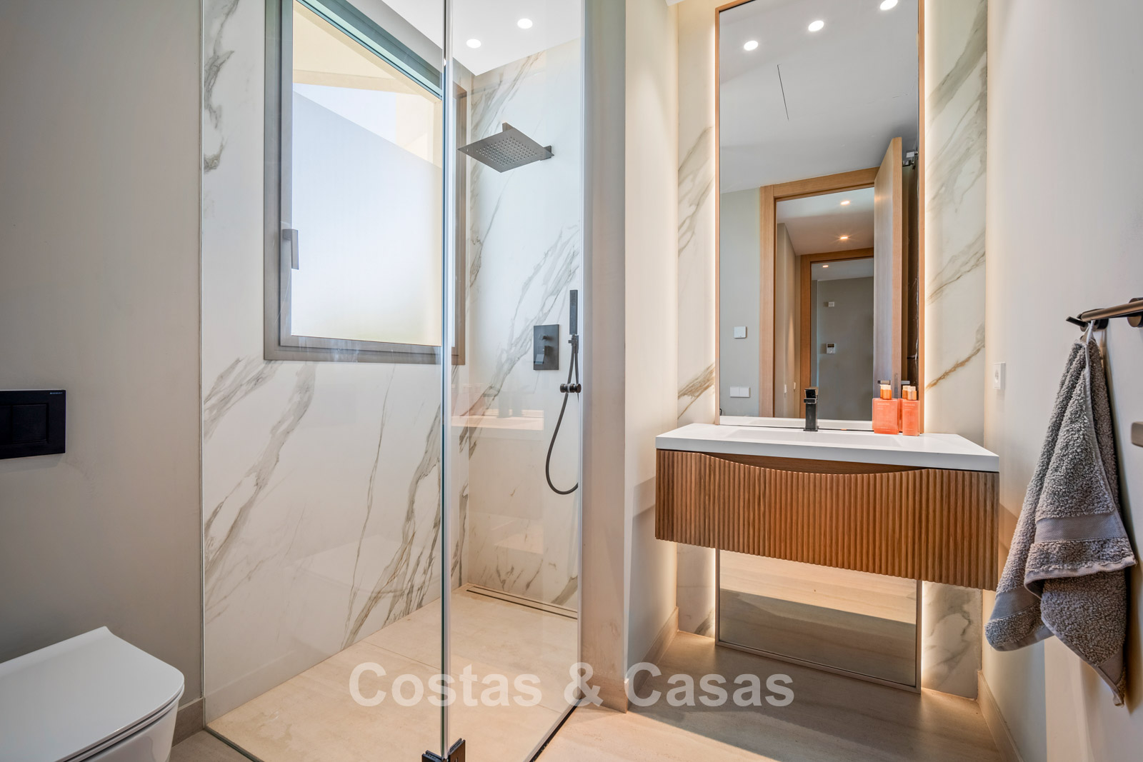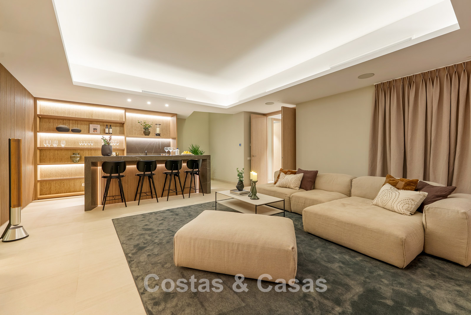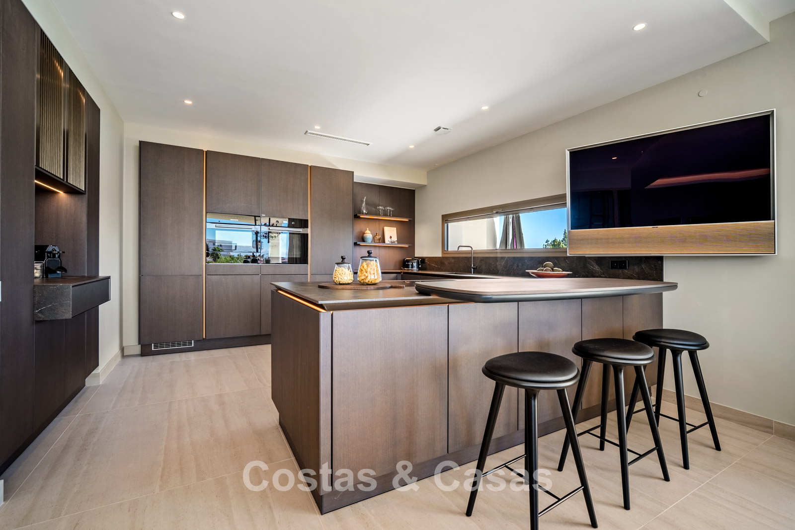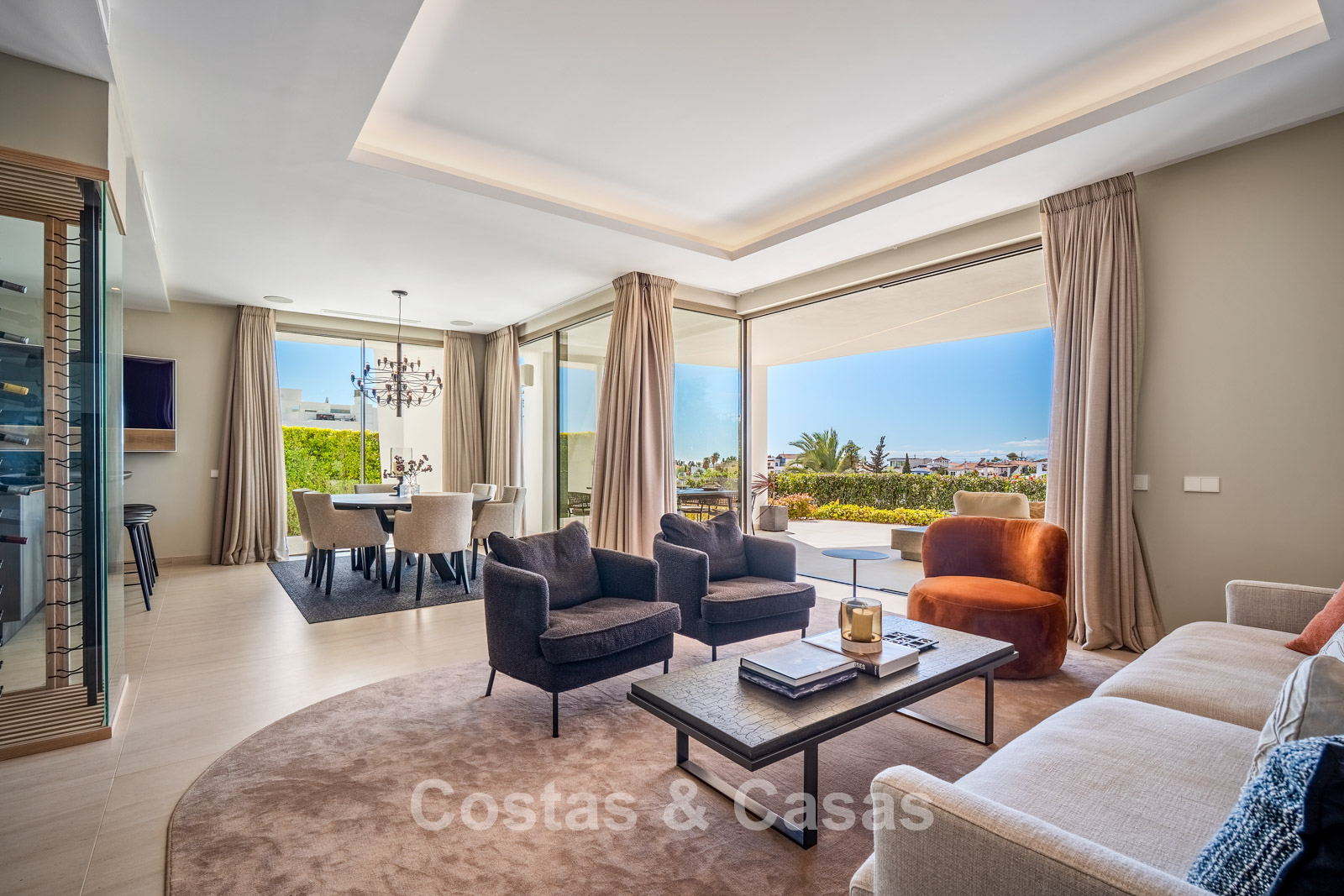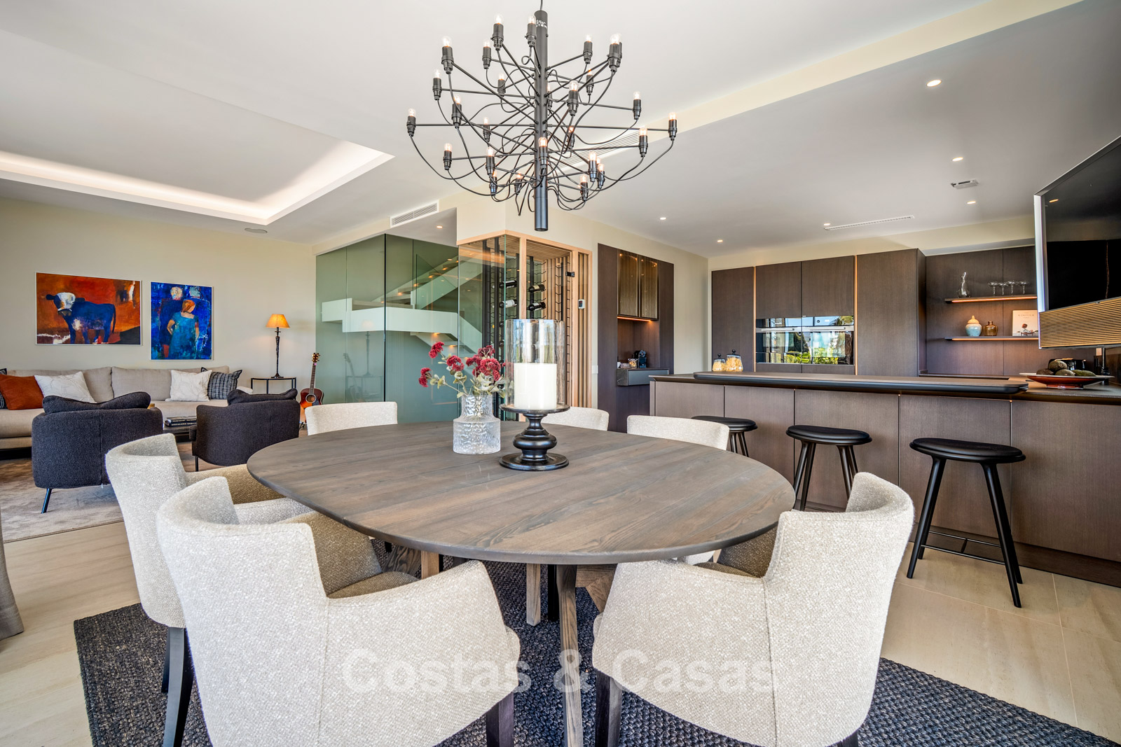 Villa jumelée à l'architecture avant-gardiste, caractérisée par des lignes minimalistes, un agencement ouvert et l'utilisation de matériaux haut de gamme qui créent une atmosphère de sérénité et d'exclusivité. De larges baies vitrées coulissantes s'ouvrent sur l'extérieur, laissant entrer une abondante lumière naturelle. Espace de vie ouvert. La cave à vin moderne et climatisée, intégrée à l'espace de vie, est à la fois fonctionnelle pour une conservation optimale des vins et un élément décoratif remarquable. Cuisine Siematic sur mesure, équipée d'appareils Miele haut de gamme et d'un bar. Salle à manger intégrée. Quatre chambres, chacune avec sa propre salle de bain. Carrelage grand format de haute qualité. L’étage inférieur est dédié à la détente et aux moments de convivialité, avec un bar élégant, un salon confortable et une ambiance raffinée créée par l'utilisation de matériaux chaleureux et d'un éclairage d'ambiance. Buanderie. Local technique. Garage intégré pour deux voitures.