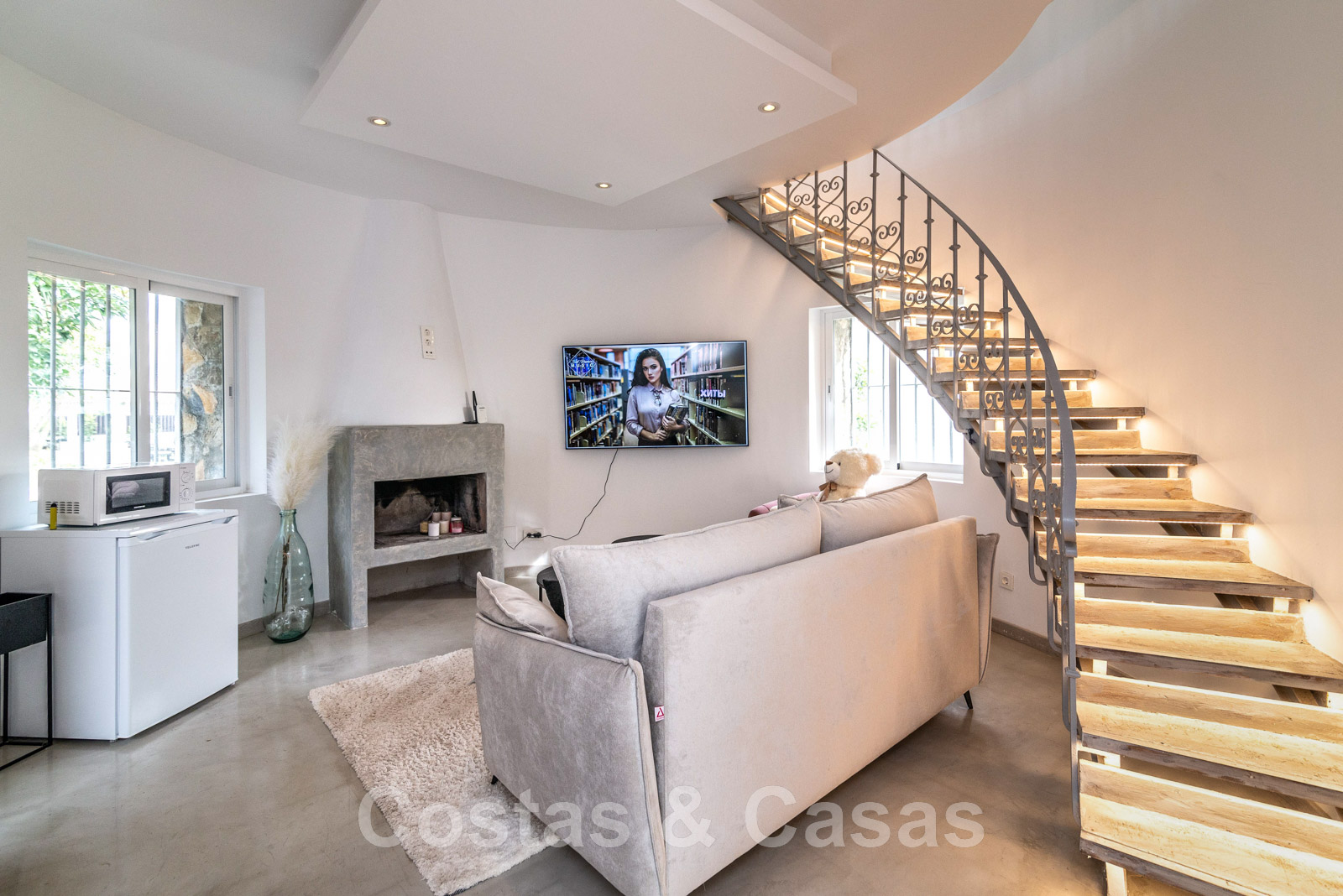 Rez-de-chaussée Hall d'entrée avec ascenseur, ouvre sur l'espace de vie. Salle de séjour ouverte avec un chillout, un grand salon et une salle à manger. Cuisine design ouverte avec îlot équipé de sièges et d'un refroidisseur de vin. 2 chambres en-suite donnant sur le jardin. Débarras, buanderie. Une tour mauresque idyllique située dans l'arrière-cour a été transformée en maison de retraite.