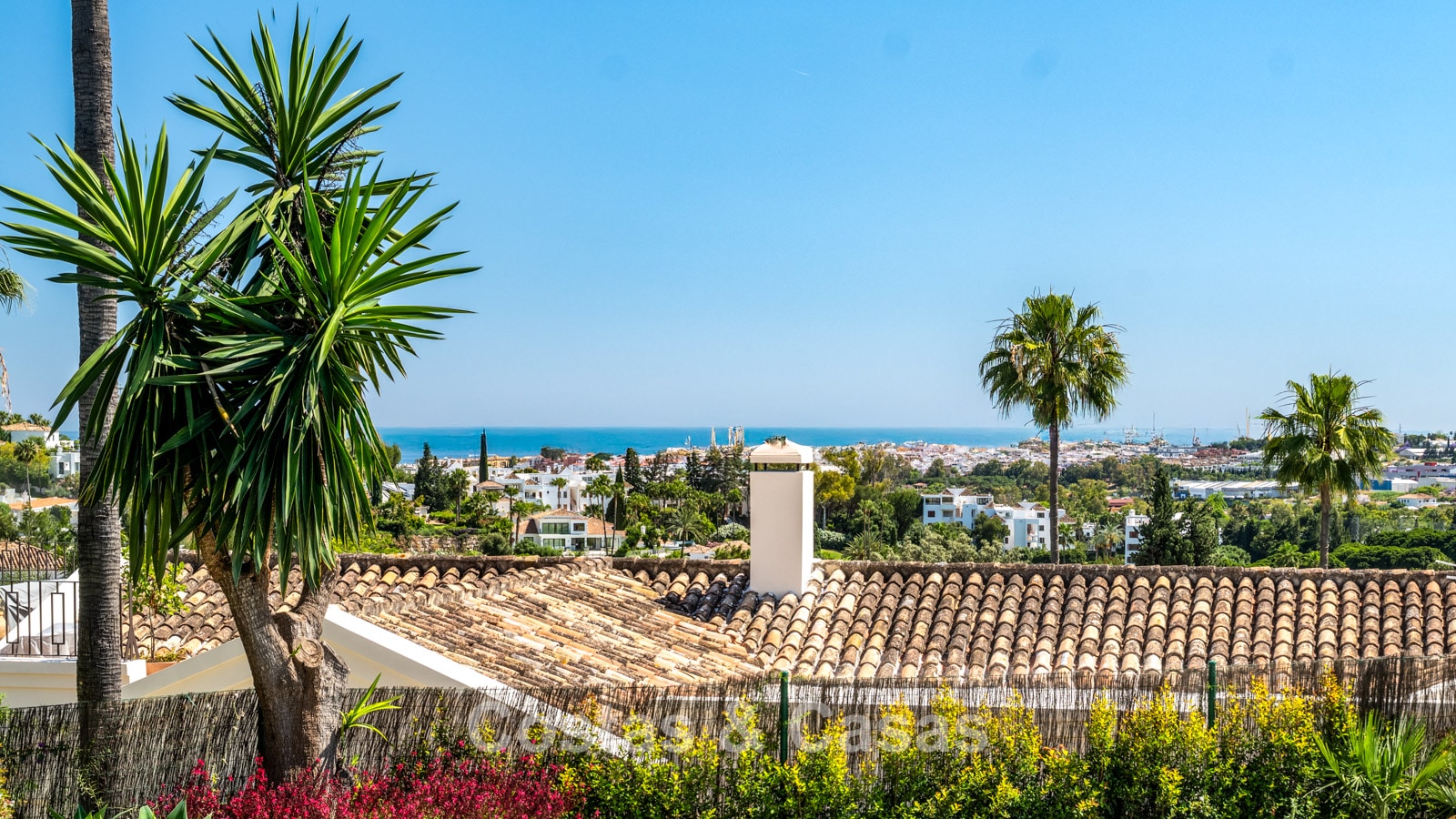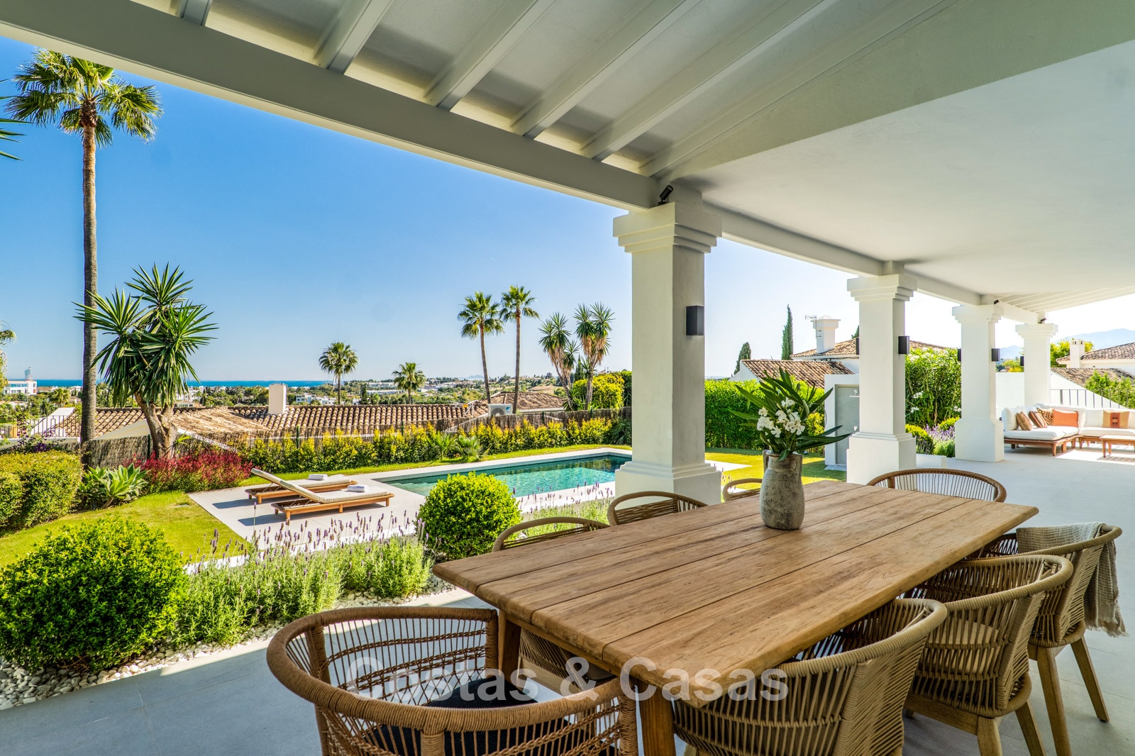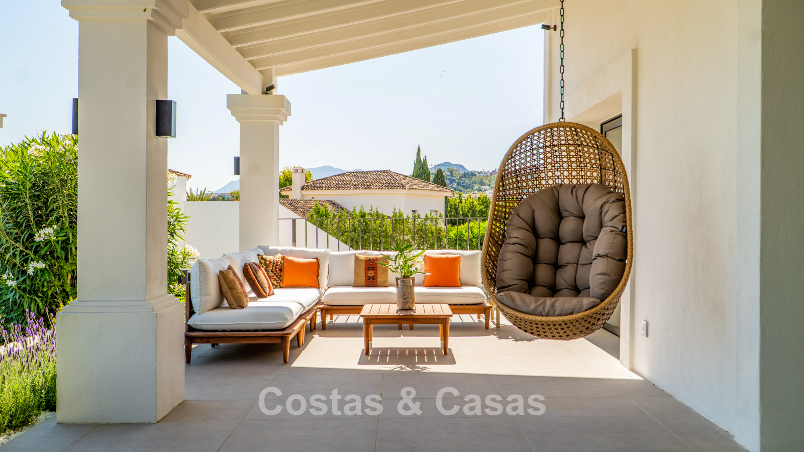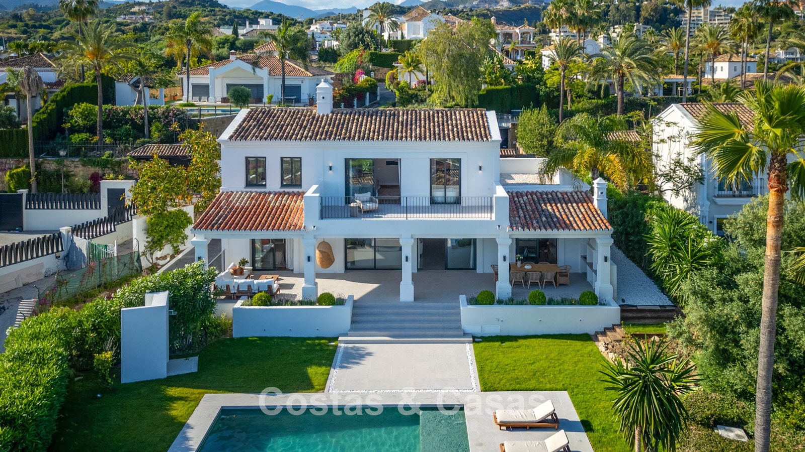 Villa individuelle de style méditerranéen élégant, alliant charme classique et confort moderne. Vue sur le jardin, la vallée du golf et la mer Méditerranée. Les espaces de vie lumineux et ouverts aux tons neutres rayonnent de tranquillité et d’élégance. Cuisine ouverte moderne et sur mesure au design raffiné, avec îlot central et bar. Salle à manger intégrée. 5 chambres, 5 salles de bain et une toilette séparée. Deuxième salon TV. Sols carrelés. Garage intégré. Deux places de parking supplémentaires sur le terrain.