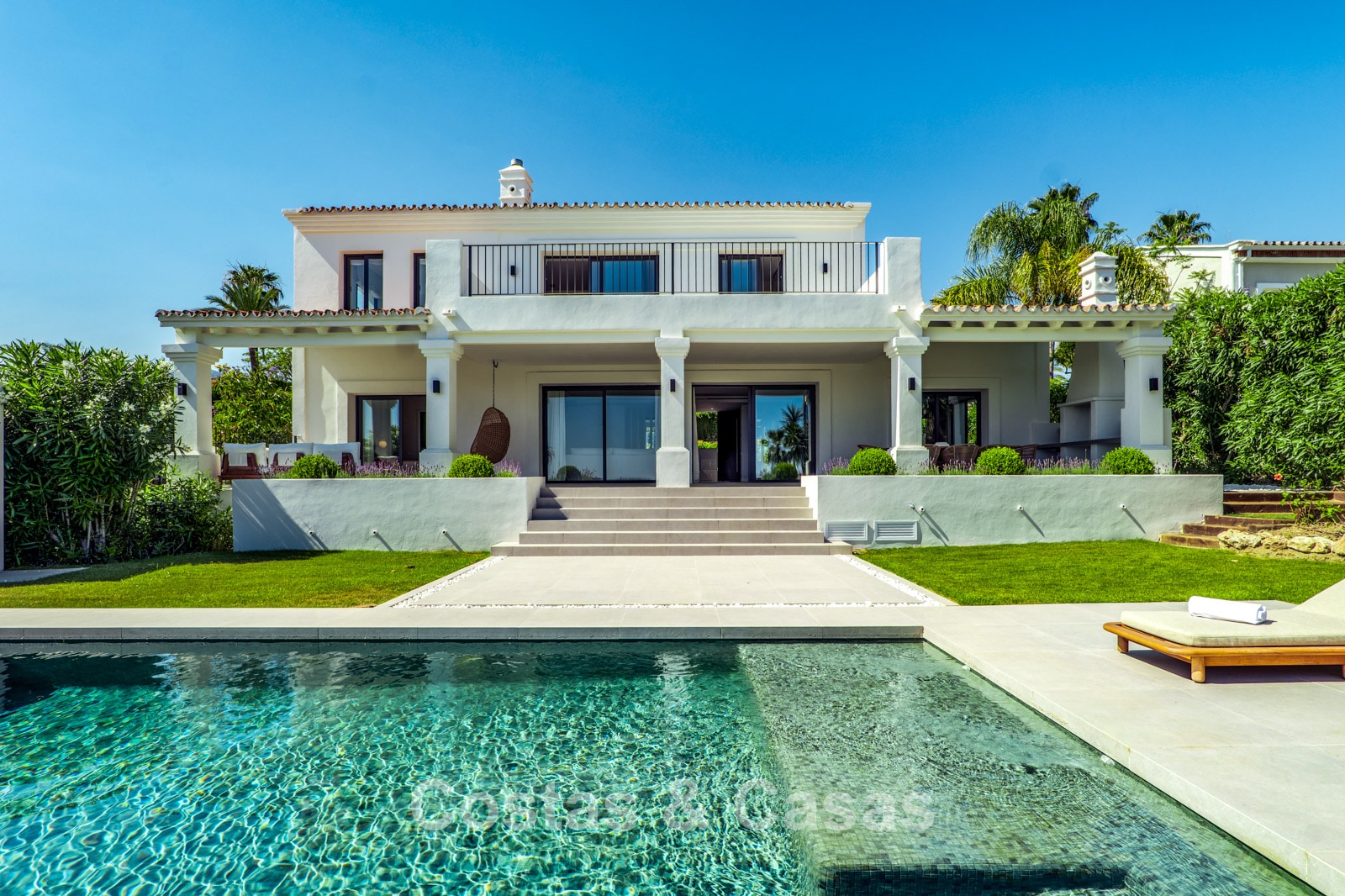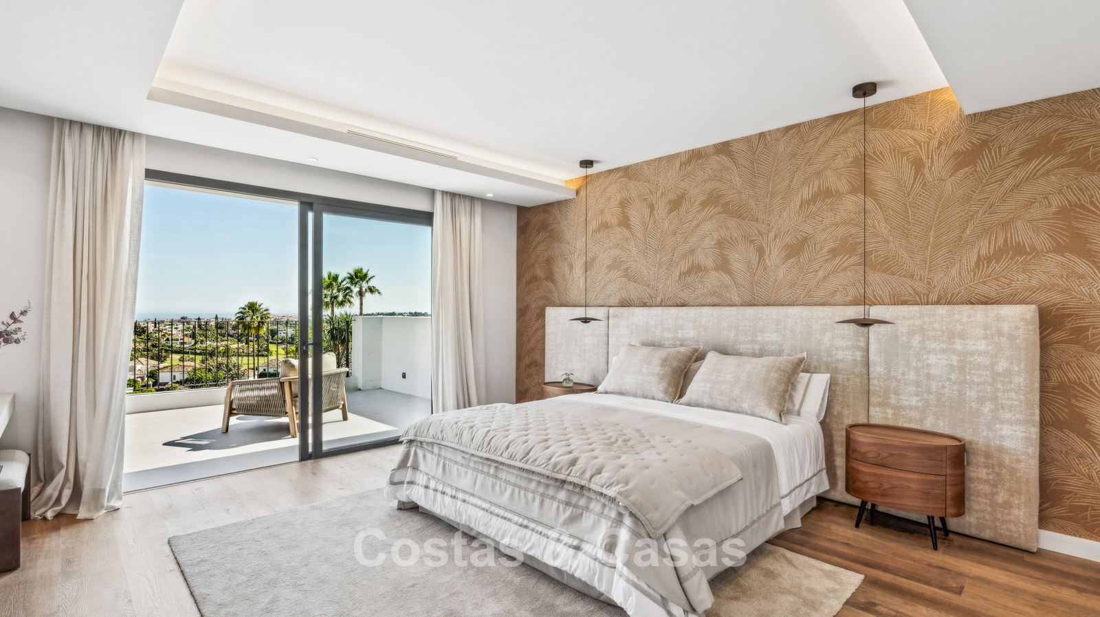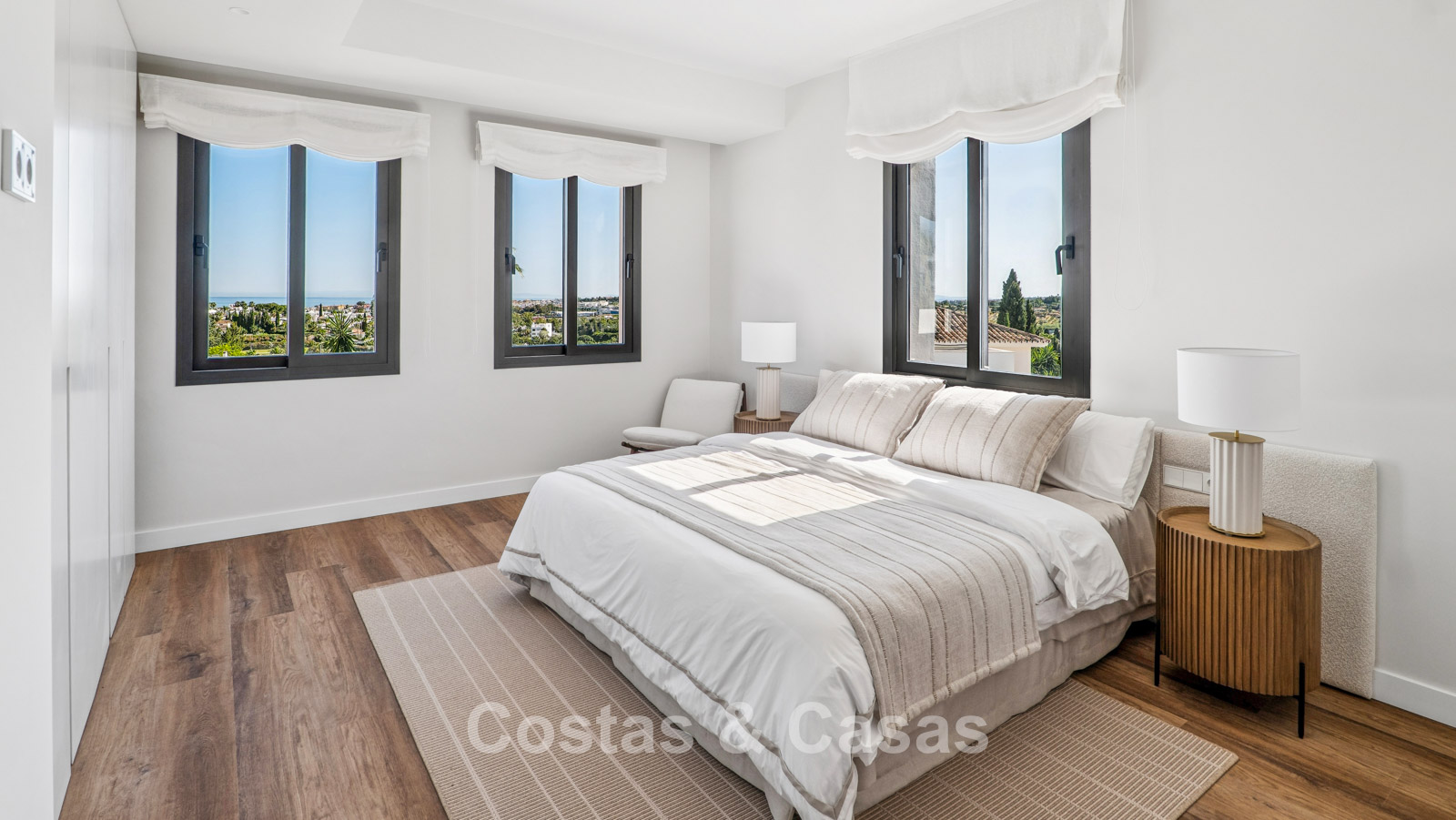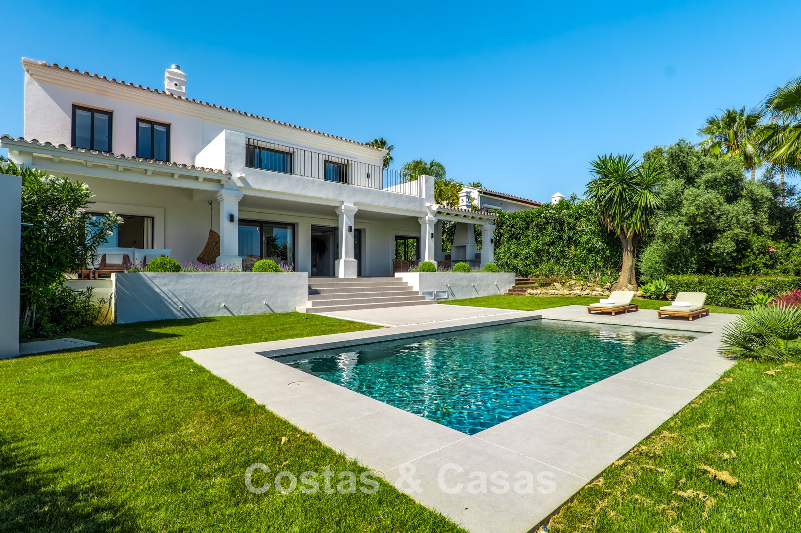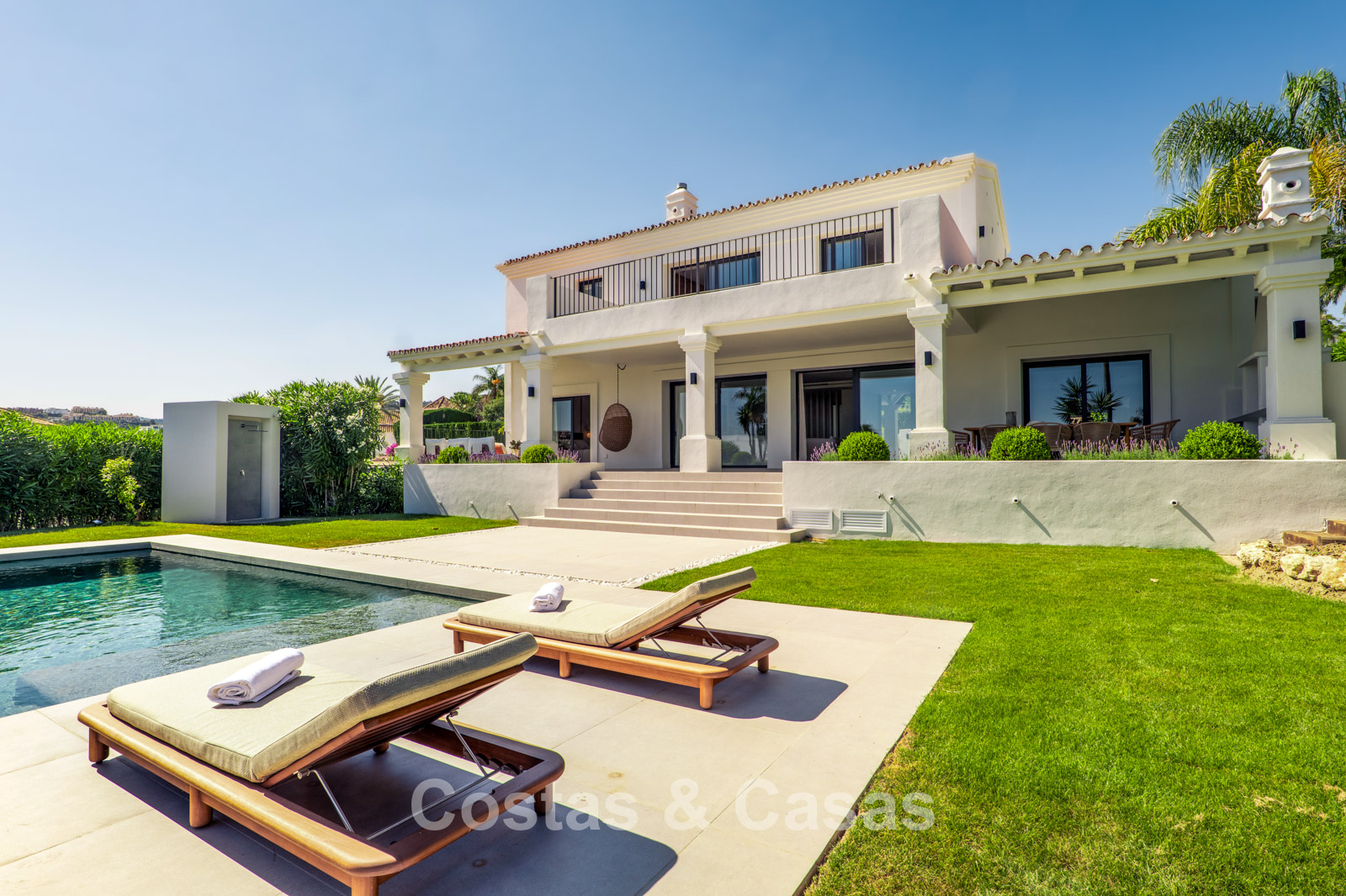 Villa individuelle de style méditerranéen élégant, alliant charme classique et confort moderne. Vue sur le jardin, la vallée du golf et la mer Méditerranée. Les espaces de vie lumineux et ouverts aux tons neutres rayonnent de tranquillité et d’élégance. Cuisine ouverte moderne et sur mesure au design raffiné, avec îlot central et bar. Salle à manger intégrée. 5 chambres, 5 salles de bain et une toilette séparée. Deuxième salon TV. Sols carrelés. Garage intégré. Deux places de parking supplémentaires sur le terrain.